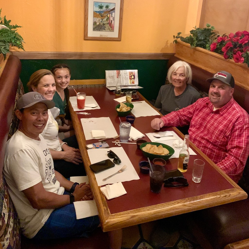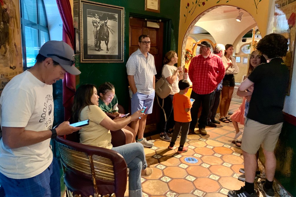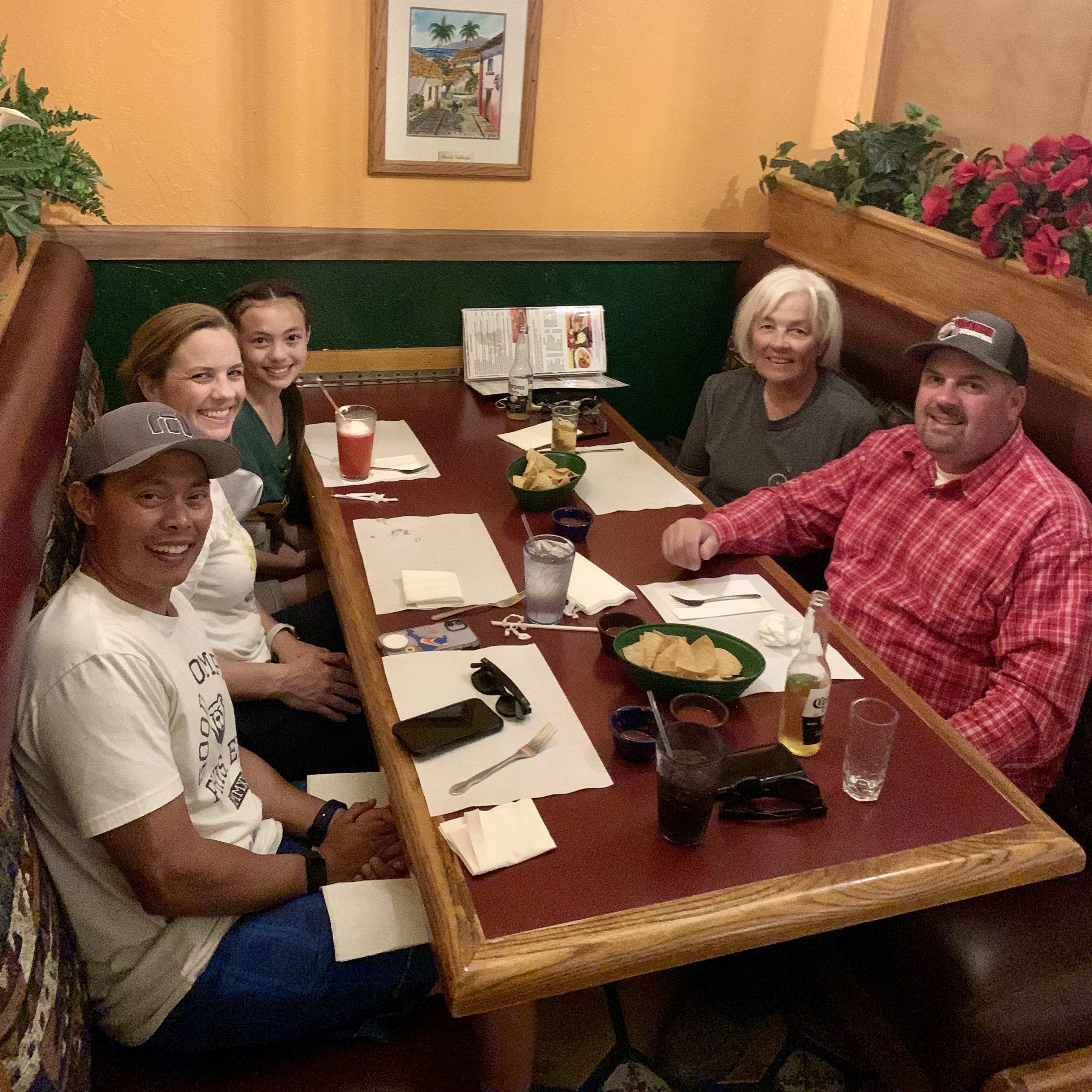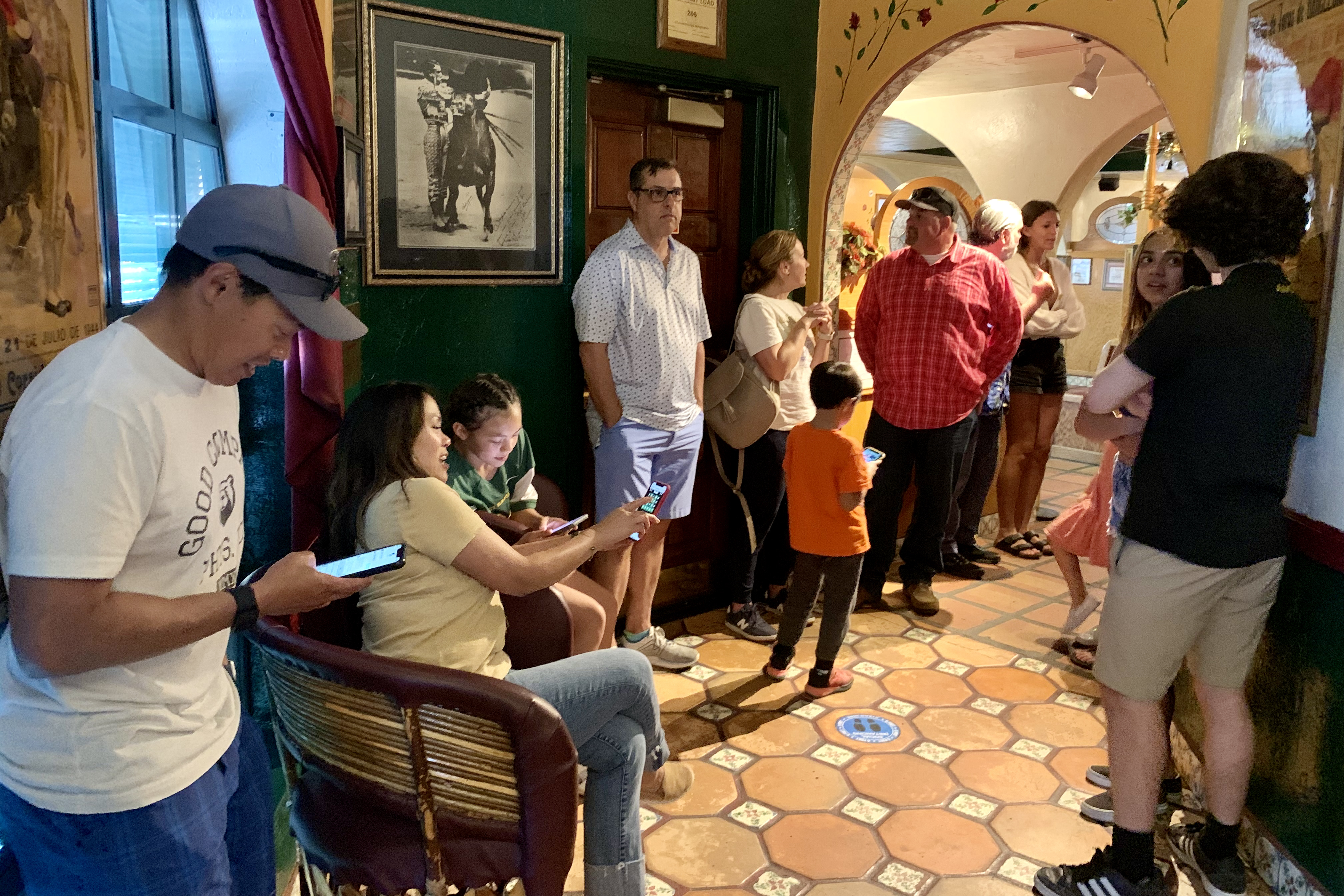 After the game, we all went to El Novillero. Lenin, Leah and Sophia playing Wordle, Jeff, Thais, Justin, and Carson. To the right, Lauren and Antonio.