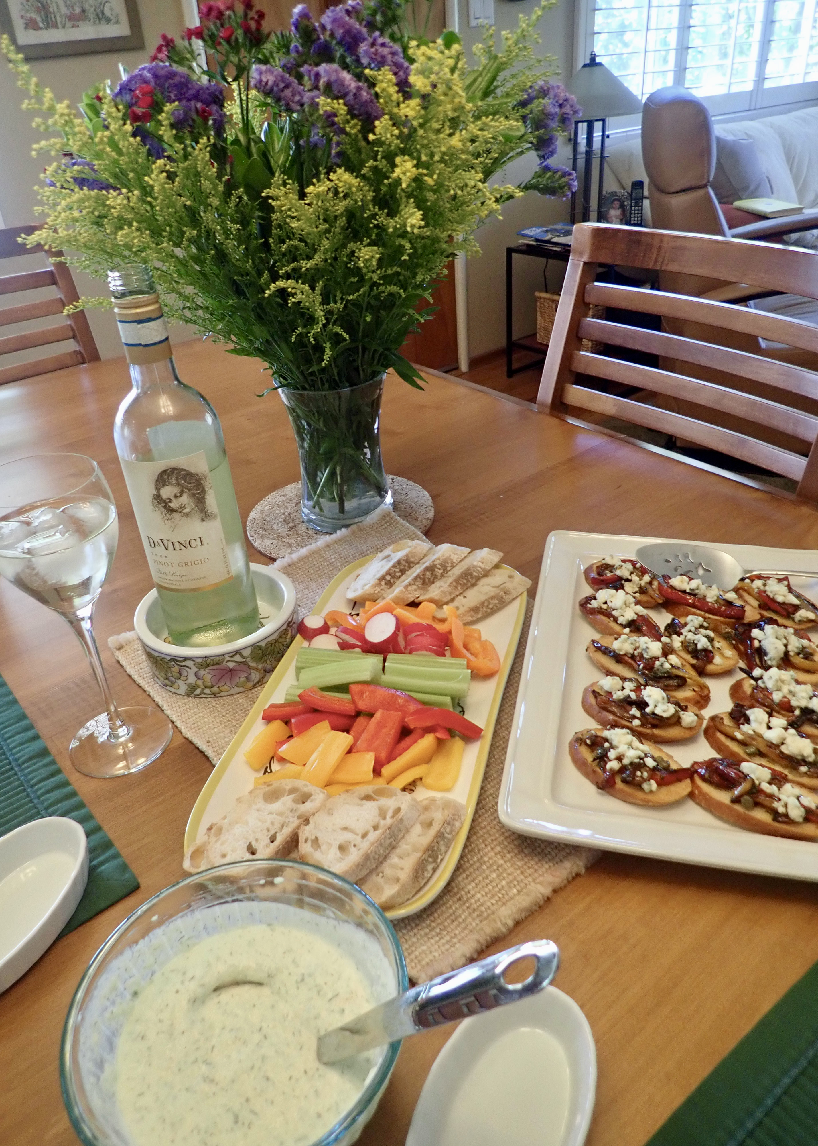 By chance, our appetizers were both bell-pepper oriented this time. Mine was a cucumber/dill/cream cheese dip. Merrilyn made caramelized peppers with capers and Gorgonzola on crostini.