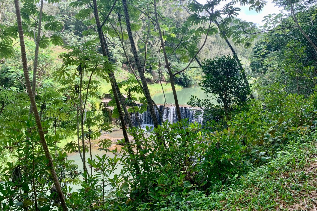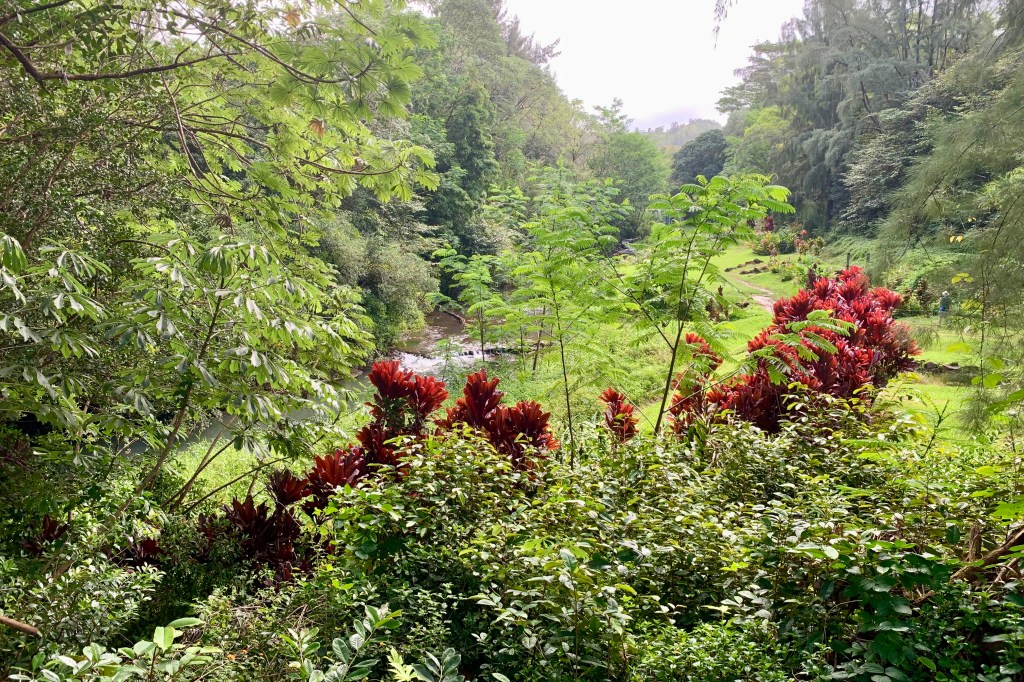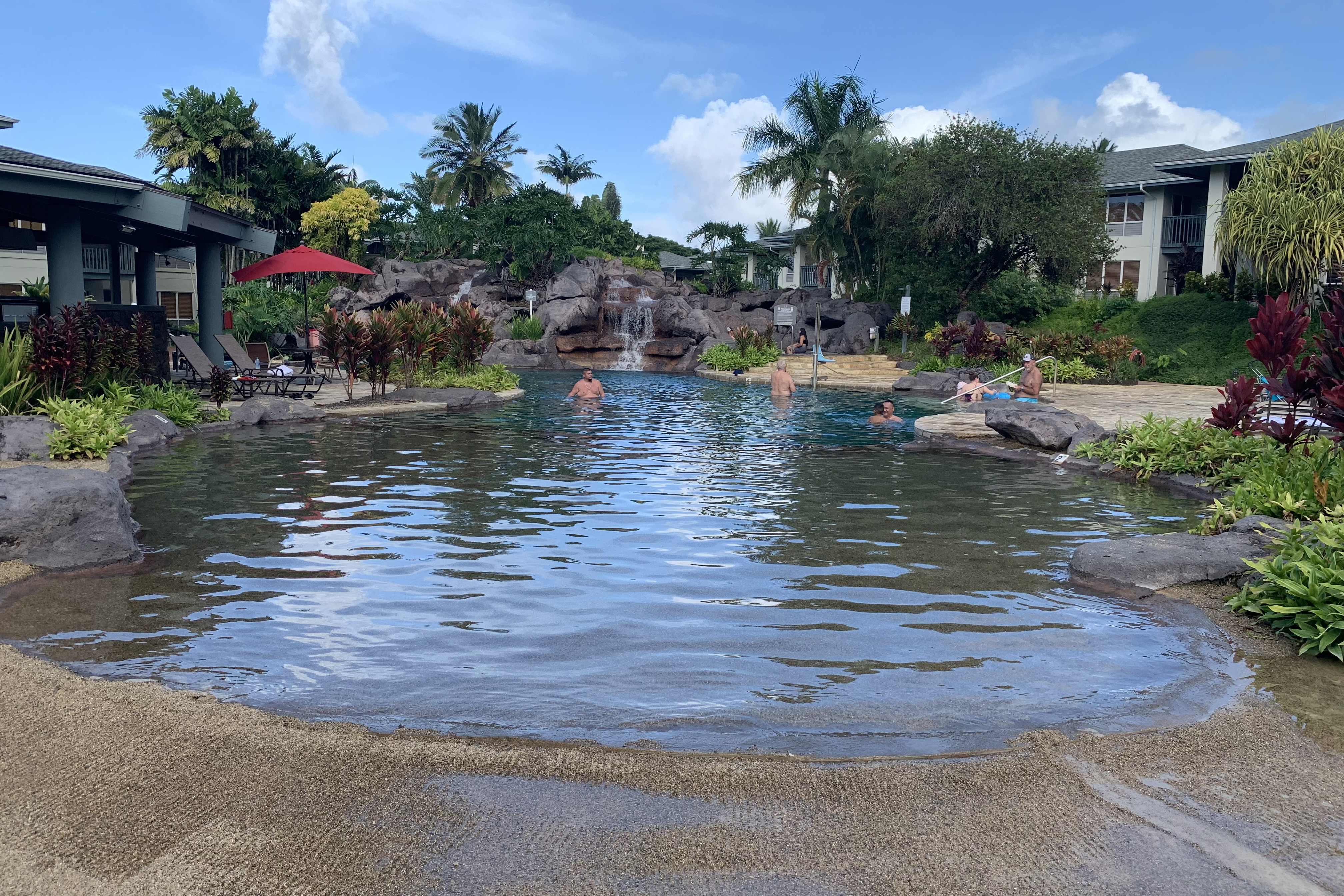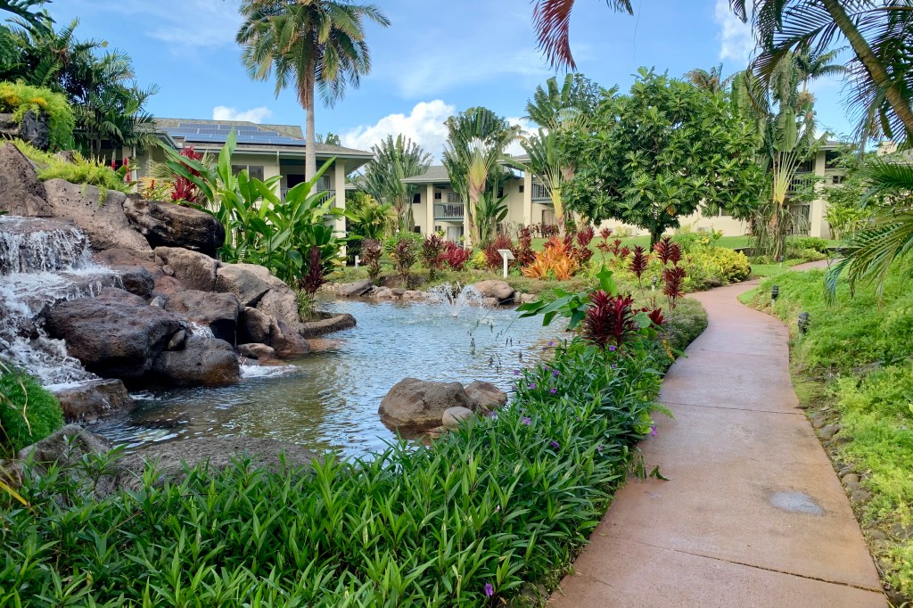 With no specific plan for the day, we decided to go back to a couple of our favorites on the north shore. Hanalei Gourmet was closed – a staff holiday until next Sunday – so we drove to Kilauea and had a very good fish sandwich at Kilauea Market and Cafe. Here are a few views of the area around the timeshare we’ve been in. On one side was a parking area with 2 food trucks – one Mexican, the other Asian fusion – both with good food and more convenient and cheaper than going to a restaurant. On the other side, the pool.