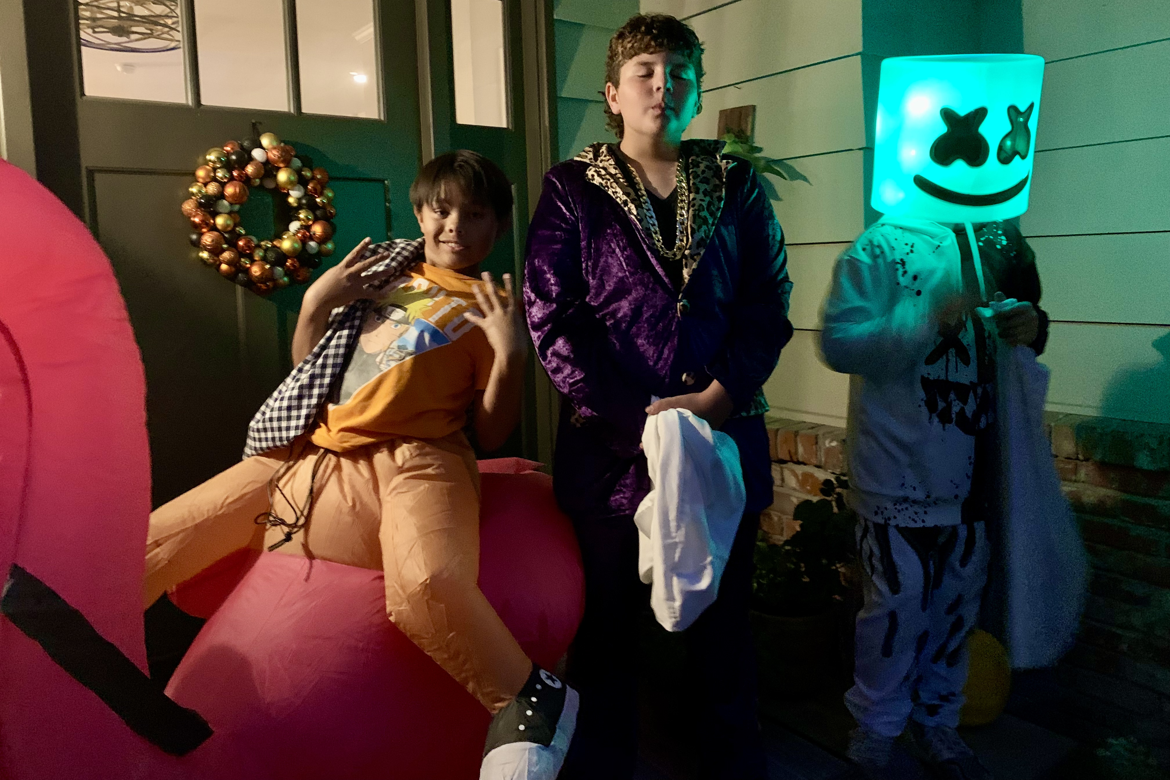 Avery-sumo riding a flamingo, Anthony-wizard, and Ethan-Marshmallow Man: