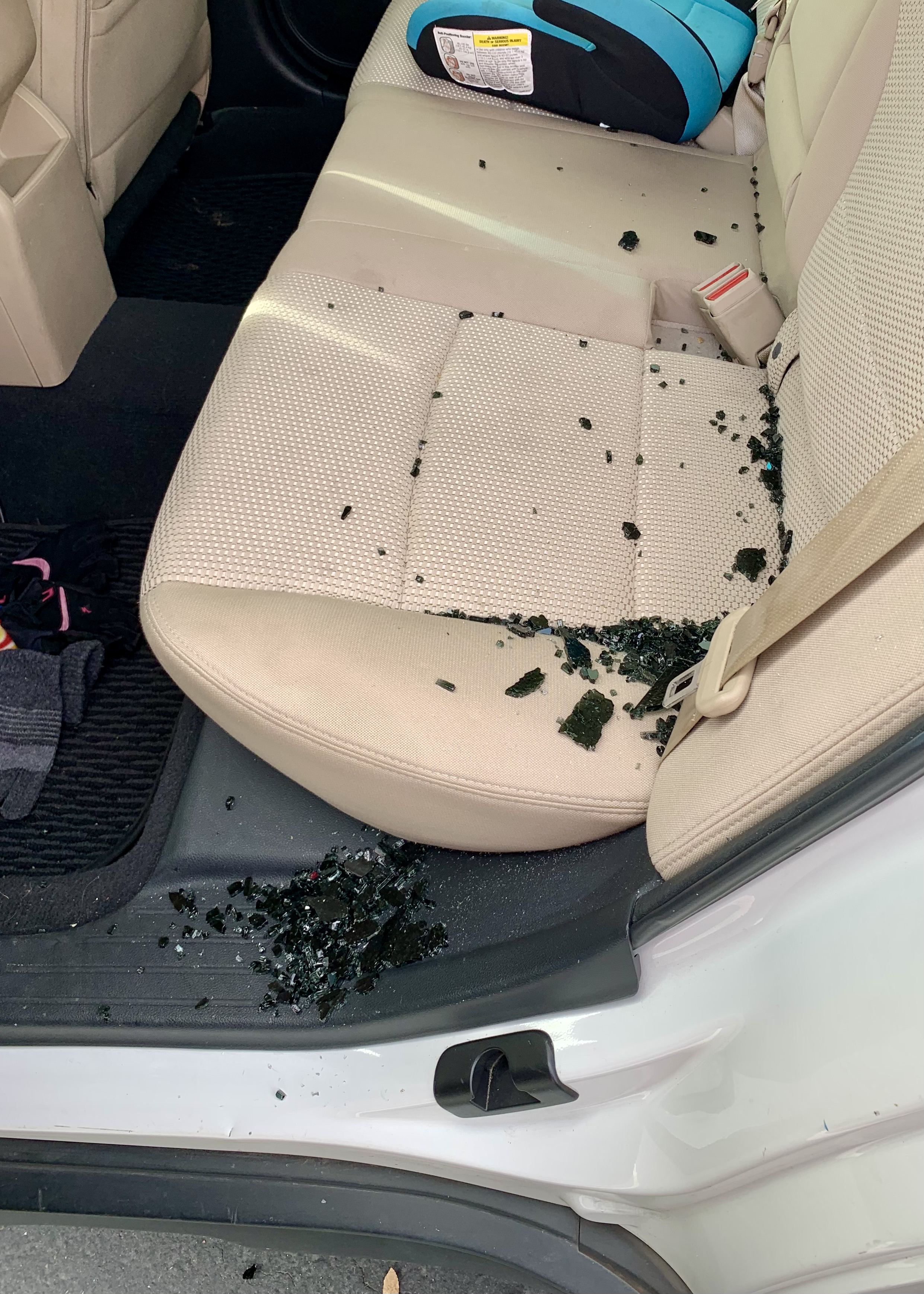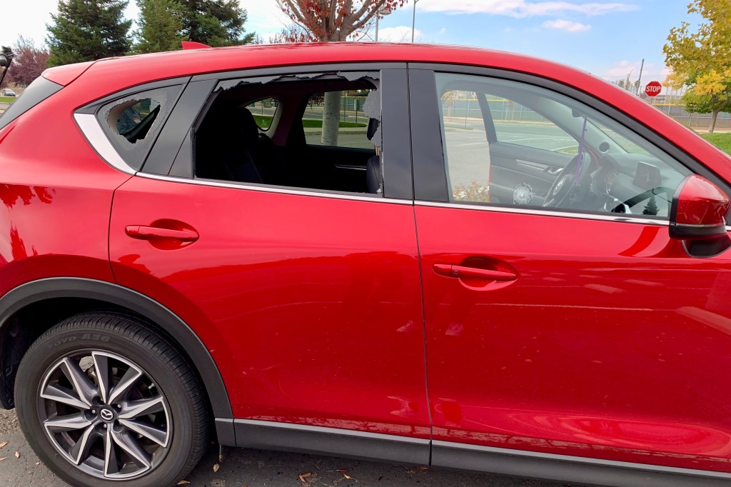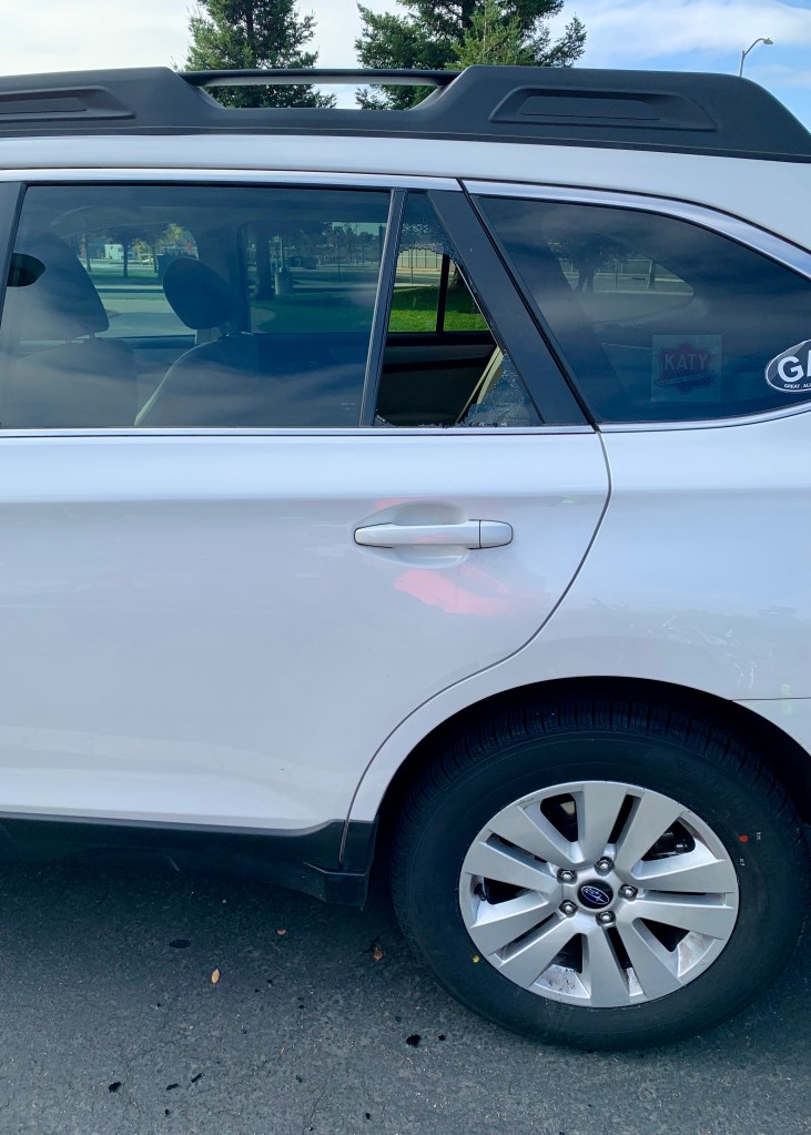 When the Pedal Up Natomas riders arrived back at our starting point around 11 am and we were getting ready to go our separate ways, one of them pointed to a window on my car … broken.