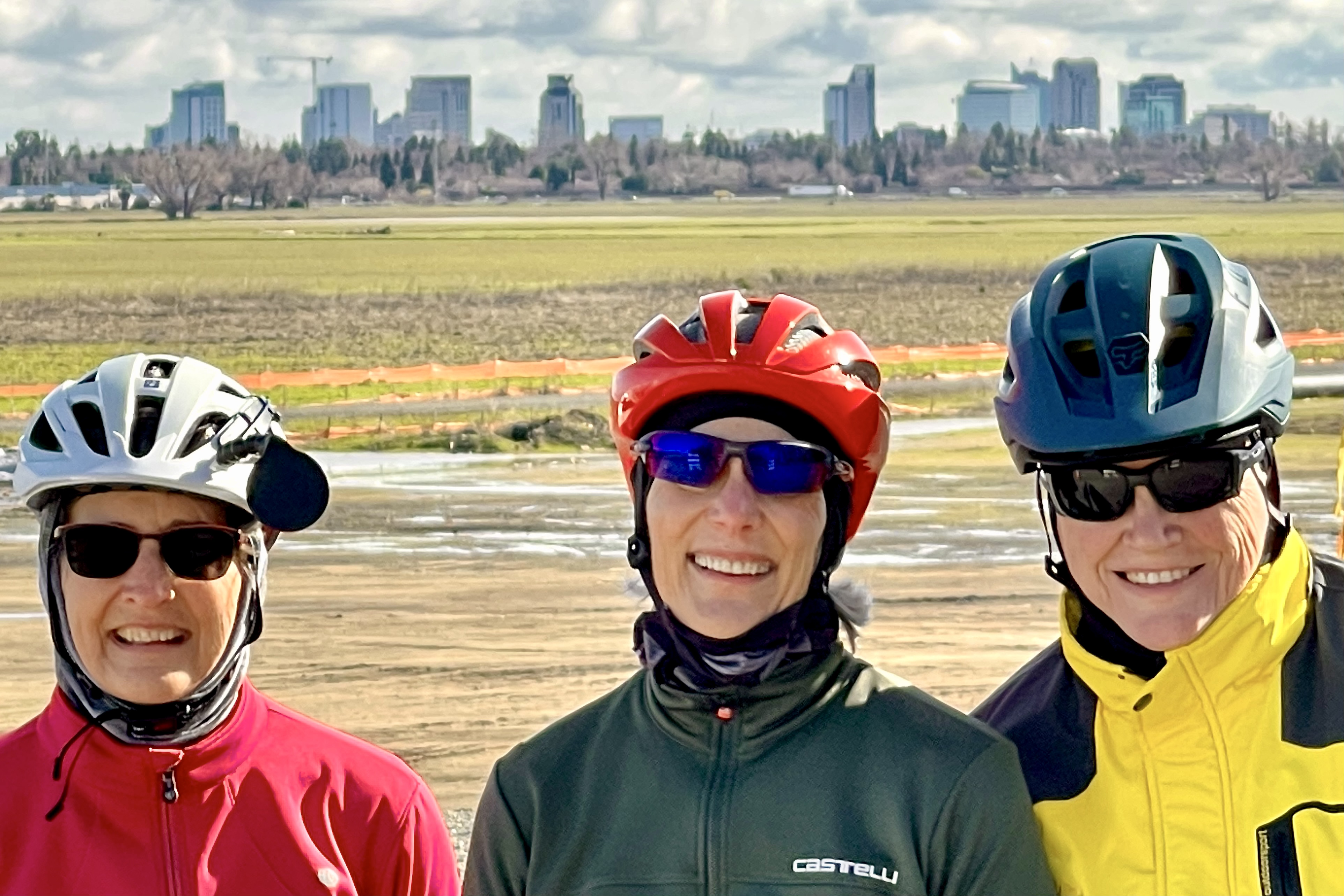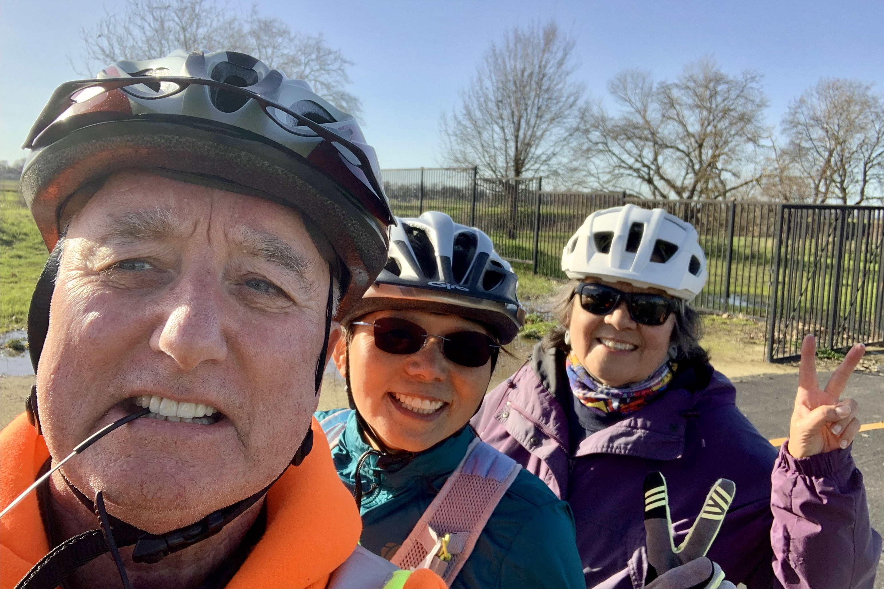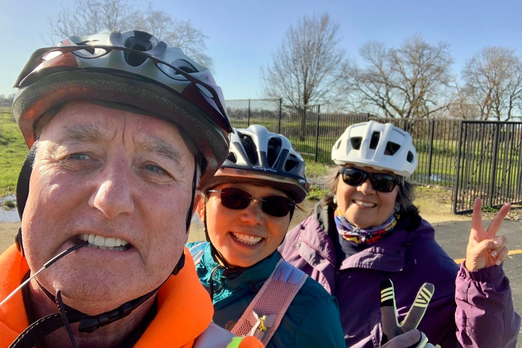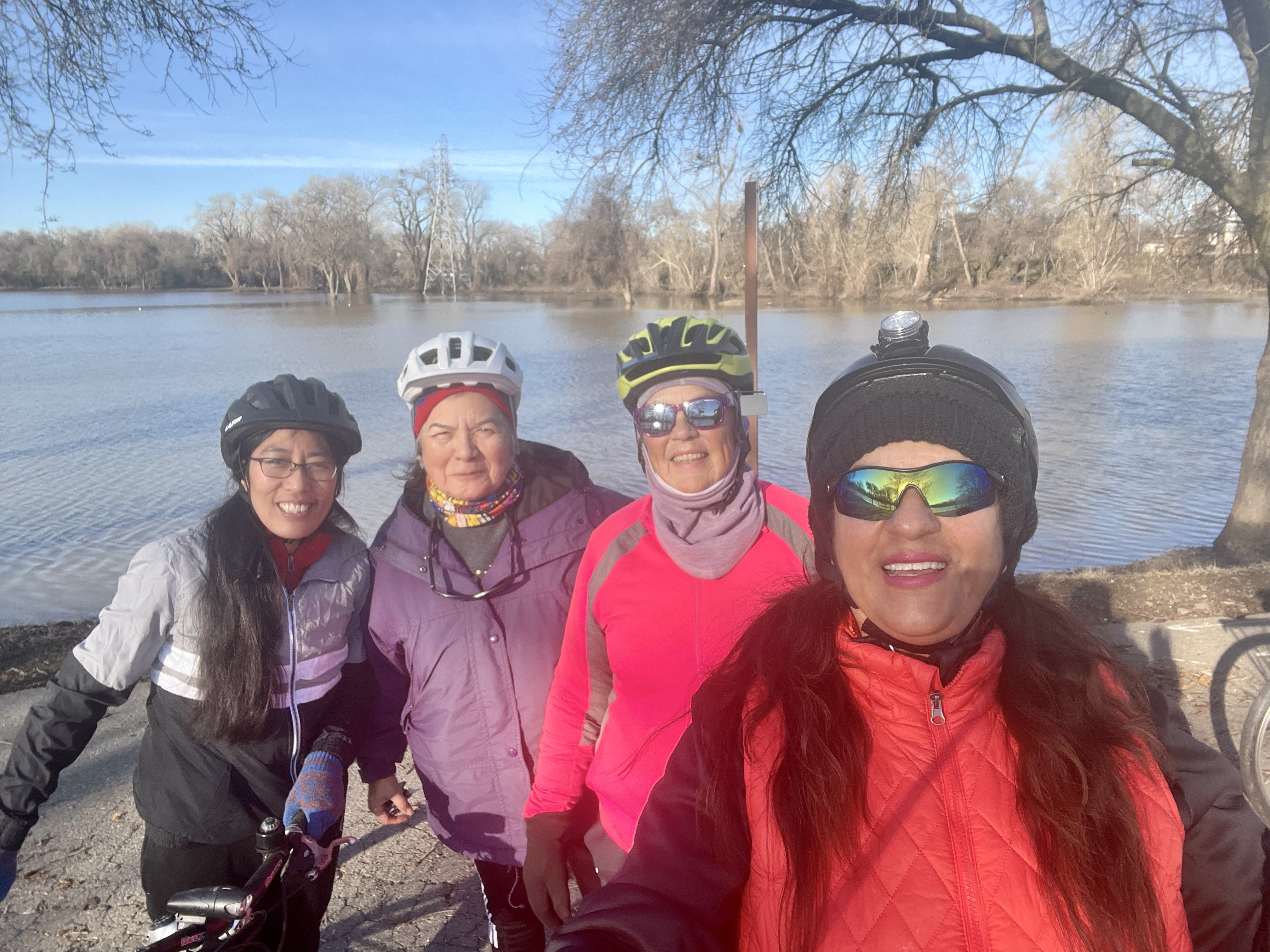 Thanks for riding today: Brenda, Minerva, Yingce, Rachel, Jim, and Carol for riding today. After the main ride, a few of us rode over to the E Levee Rd to check out the flooding from Steelhead Creek and see the Hansen Ranch Park site. Picture taken by the shadow.