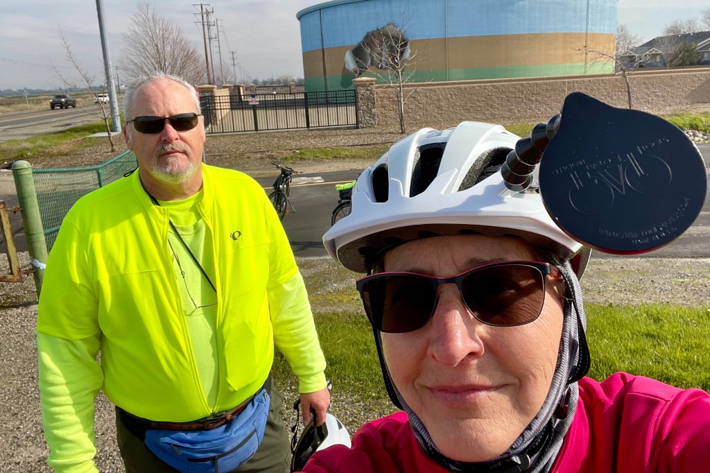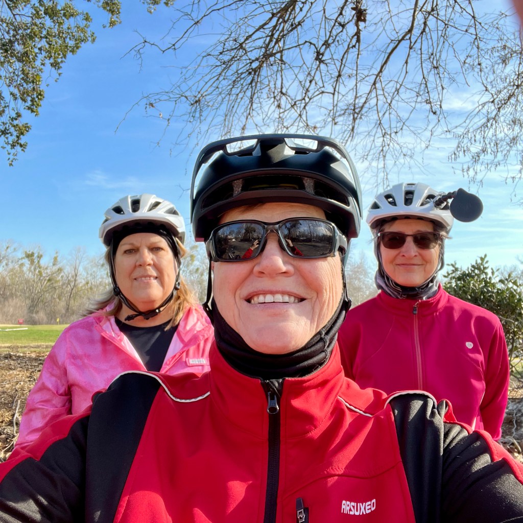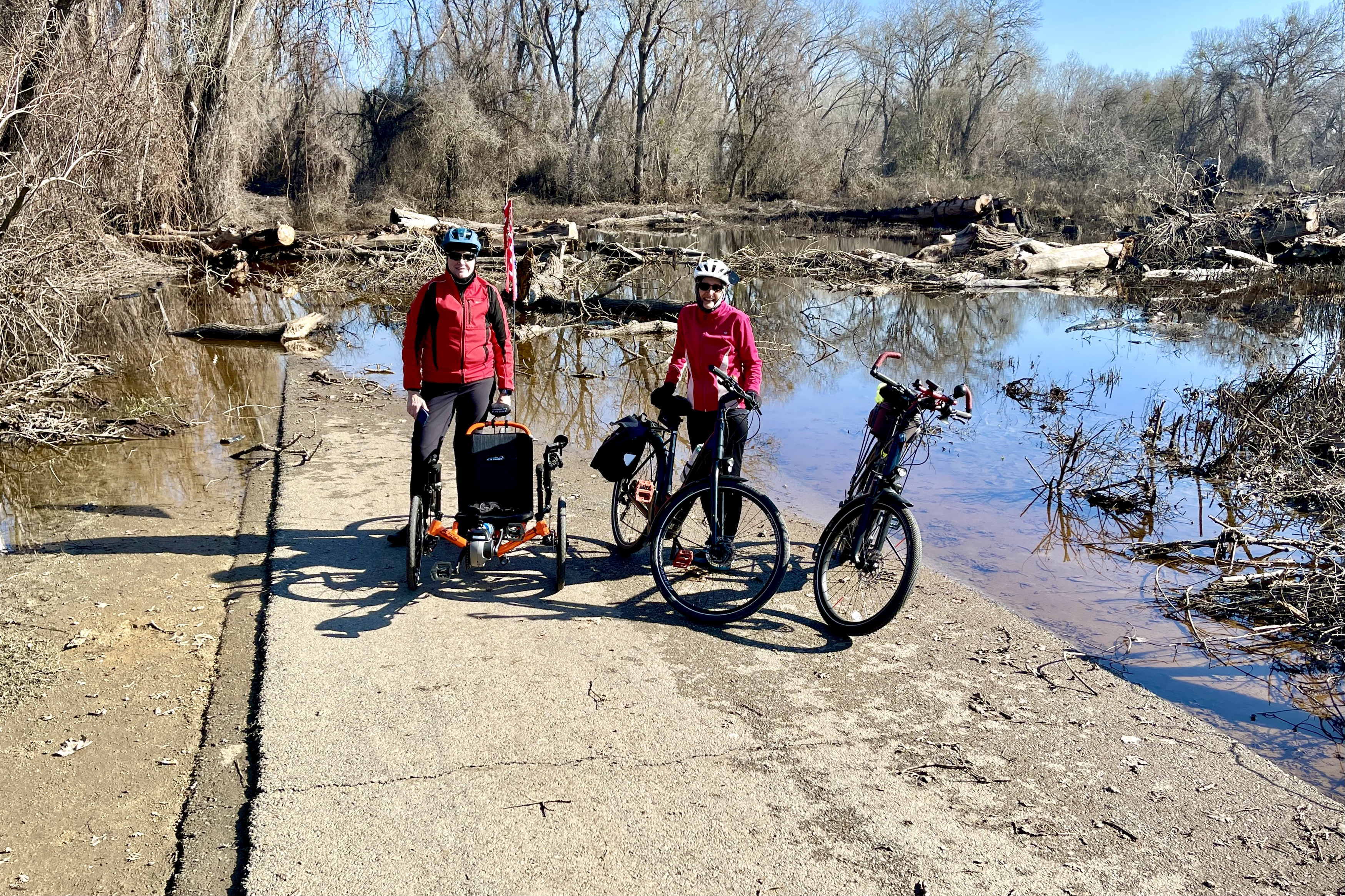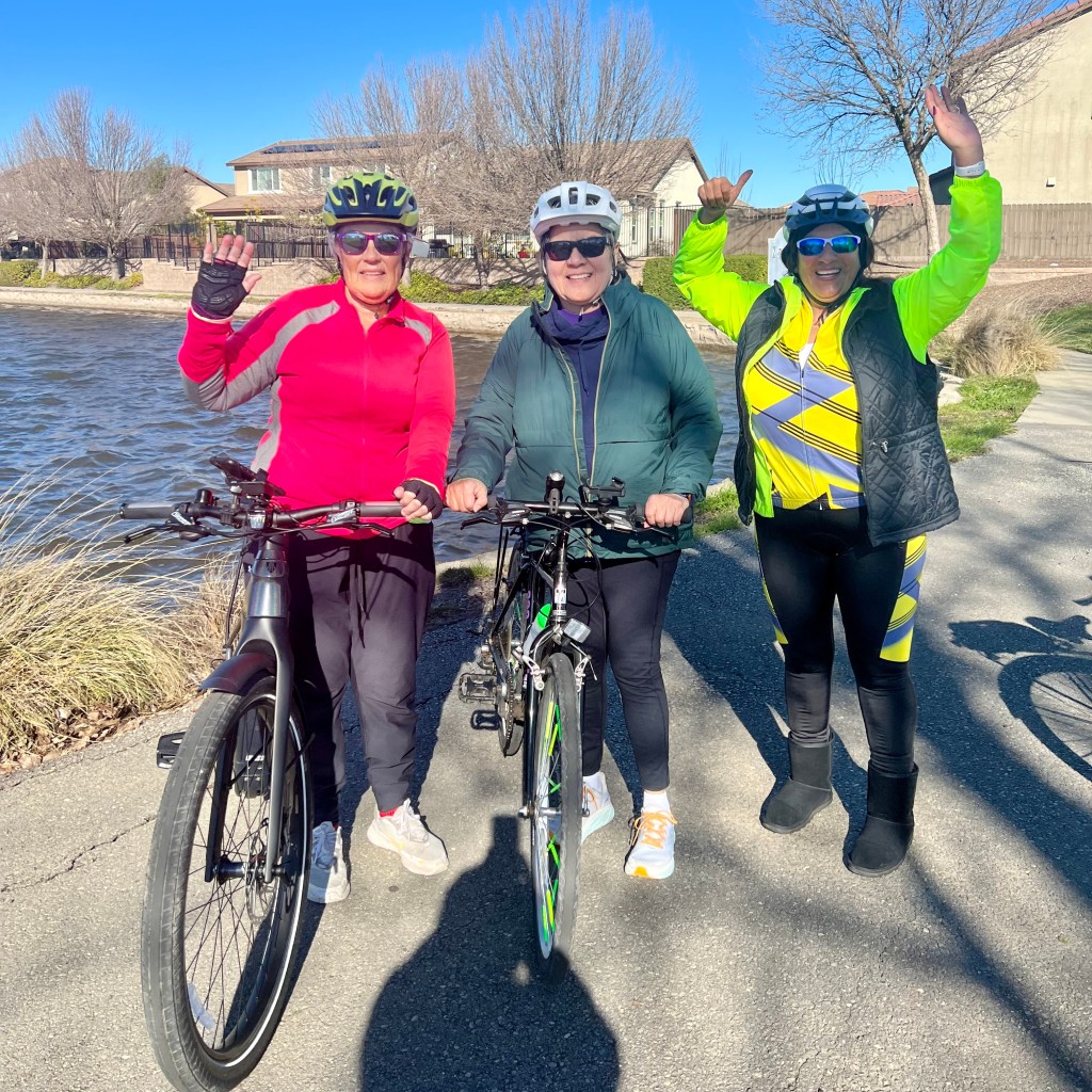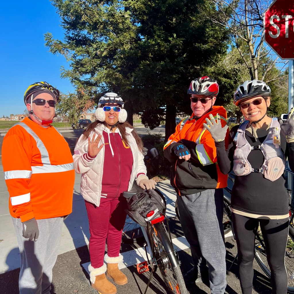 Thanks for riding today: Brenda, Minerva, Yingce, Rachel, Jim, and Carol for riding today. After the main ride, a few of us rode over to the E Levee Rd to check out the flooding from Steelhead Creek and see the Hansen Ranch Park site. Picture taken by the shadow.