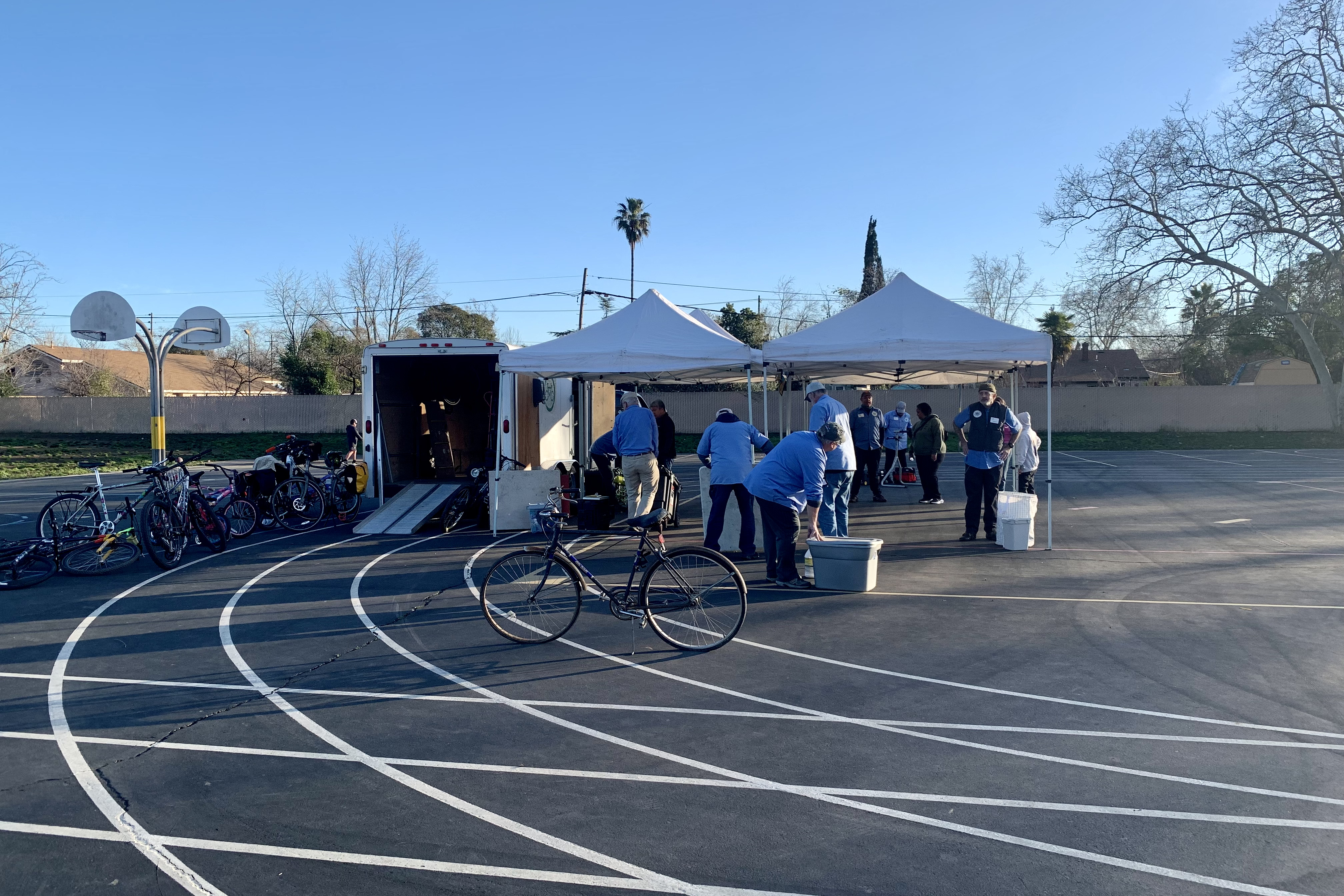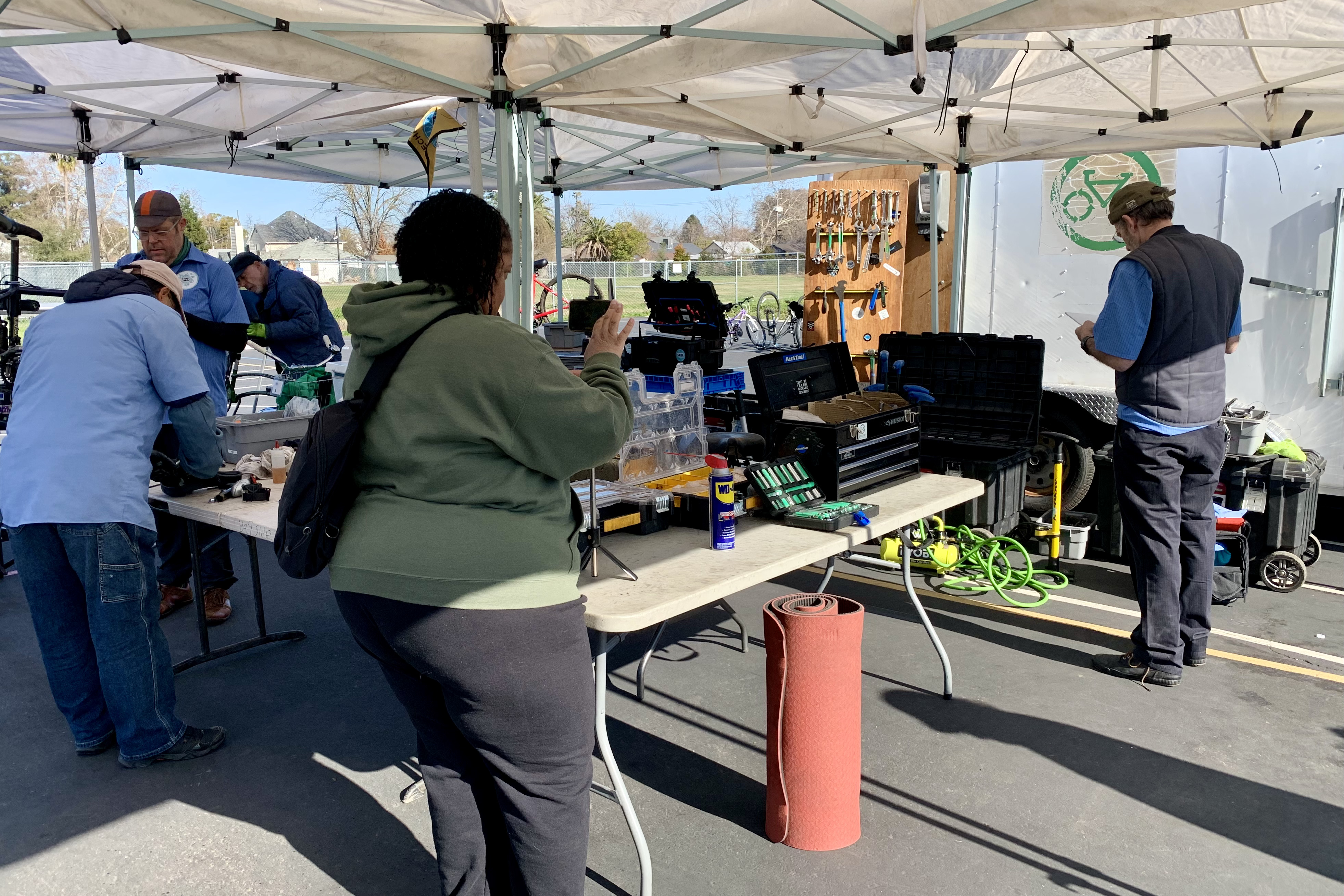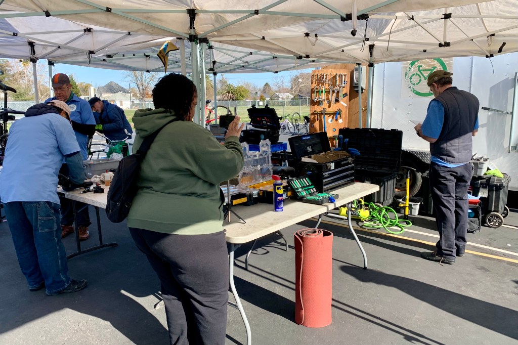 Another favorite moment. Two brothers, Gabriel and Charles, came up early in the day and asked if there were any bikes being given away. In fact, there were. They each tried out a couple and found the bike they wanted the most, they were so happy. We met their dad and found out he had no way to get the bikes back to where they lived in Rancho Cordova. No problem, said one of the mechanics, Dennis. “If you give me your address I’ll bring them to you.” More happiness all around.