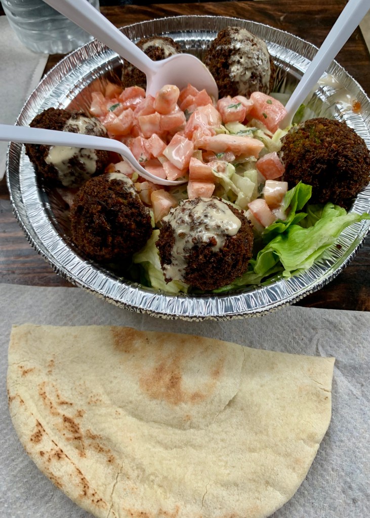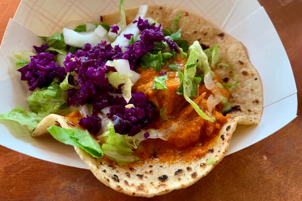 The owner of the next restaurant is a 28-year old woman whose father had a newsstand for 30 years on the same site. When he retired, his daughter opened Taco Mahal. Because her father is Indian and her mother is Puerto Rican, the food she serves is a fusion of the two cultures. We had a delicious tikka masala taco: