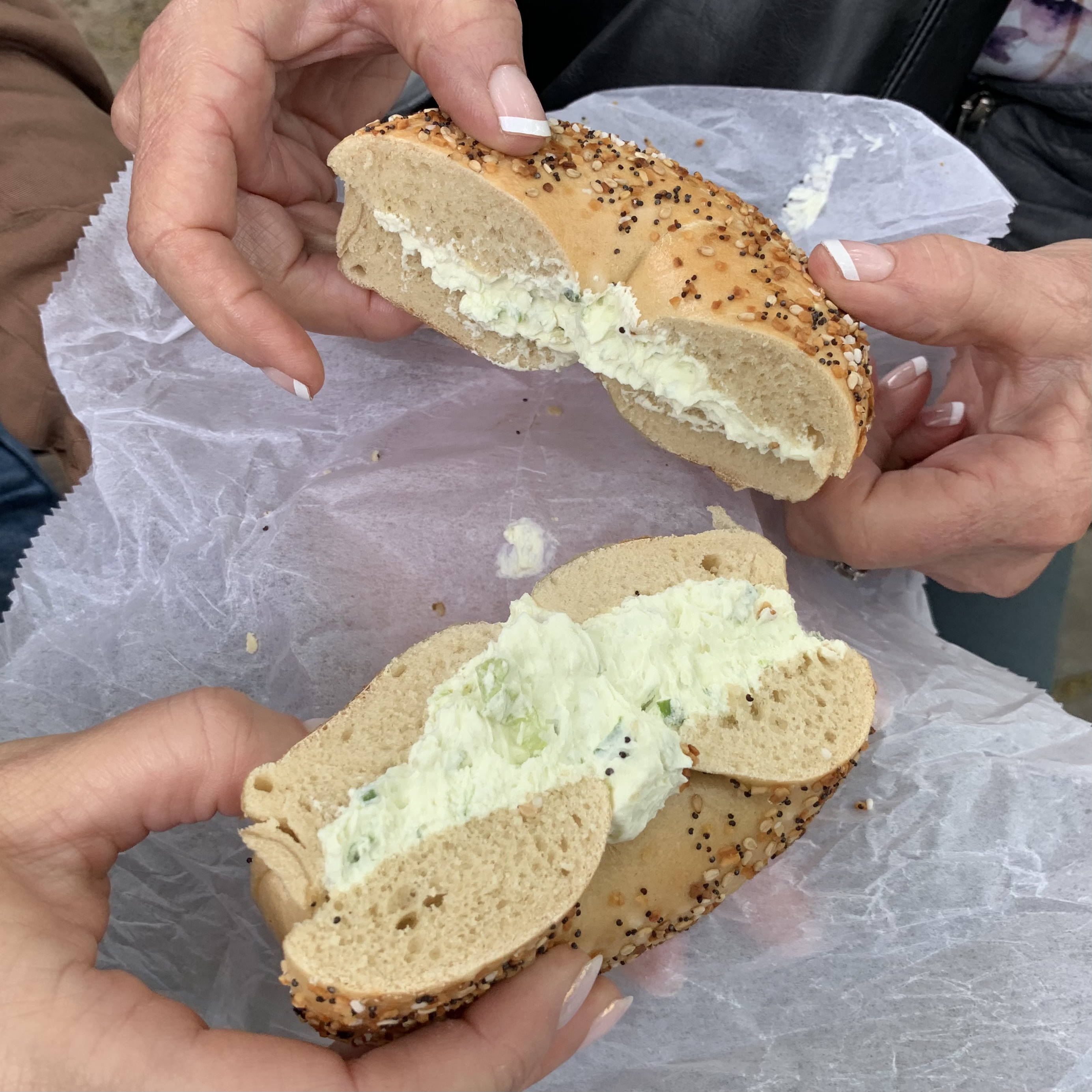 Bagel with cream cheese and scallions from Bagels on the Square: