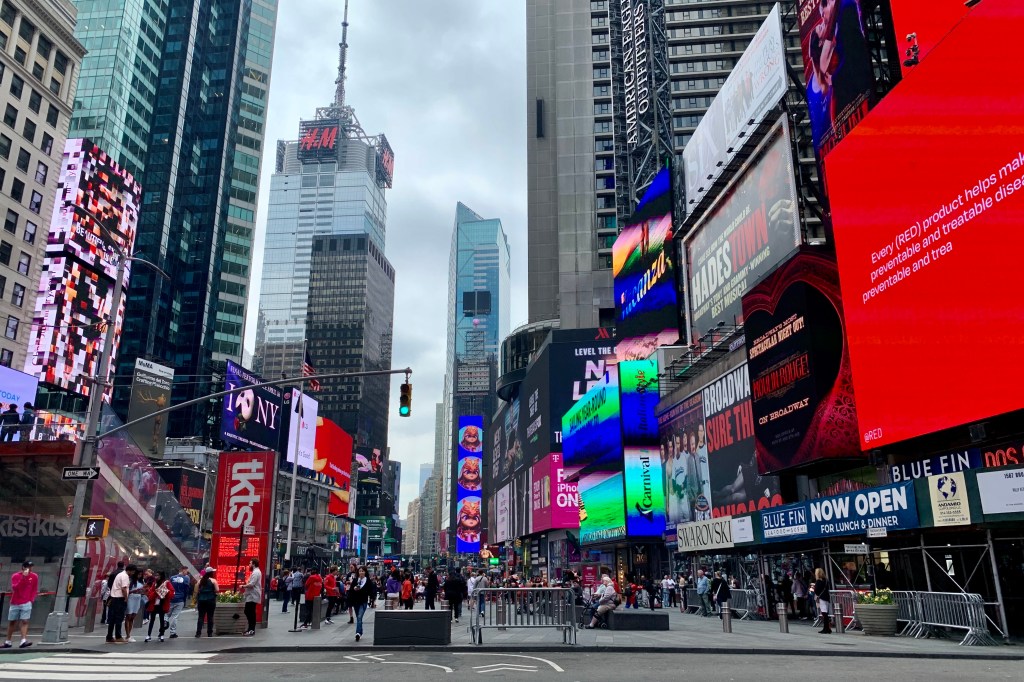 Times Square. At lower left in the picture where sign says “tkts” was a list of Broadway shows with seats available. We got in the long line where Maria began a conversation with an oceanography high school teacher and his wife from Connecticut (btw, this happens wherever we go) which made the time go by quickly.