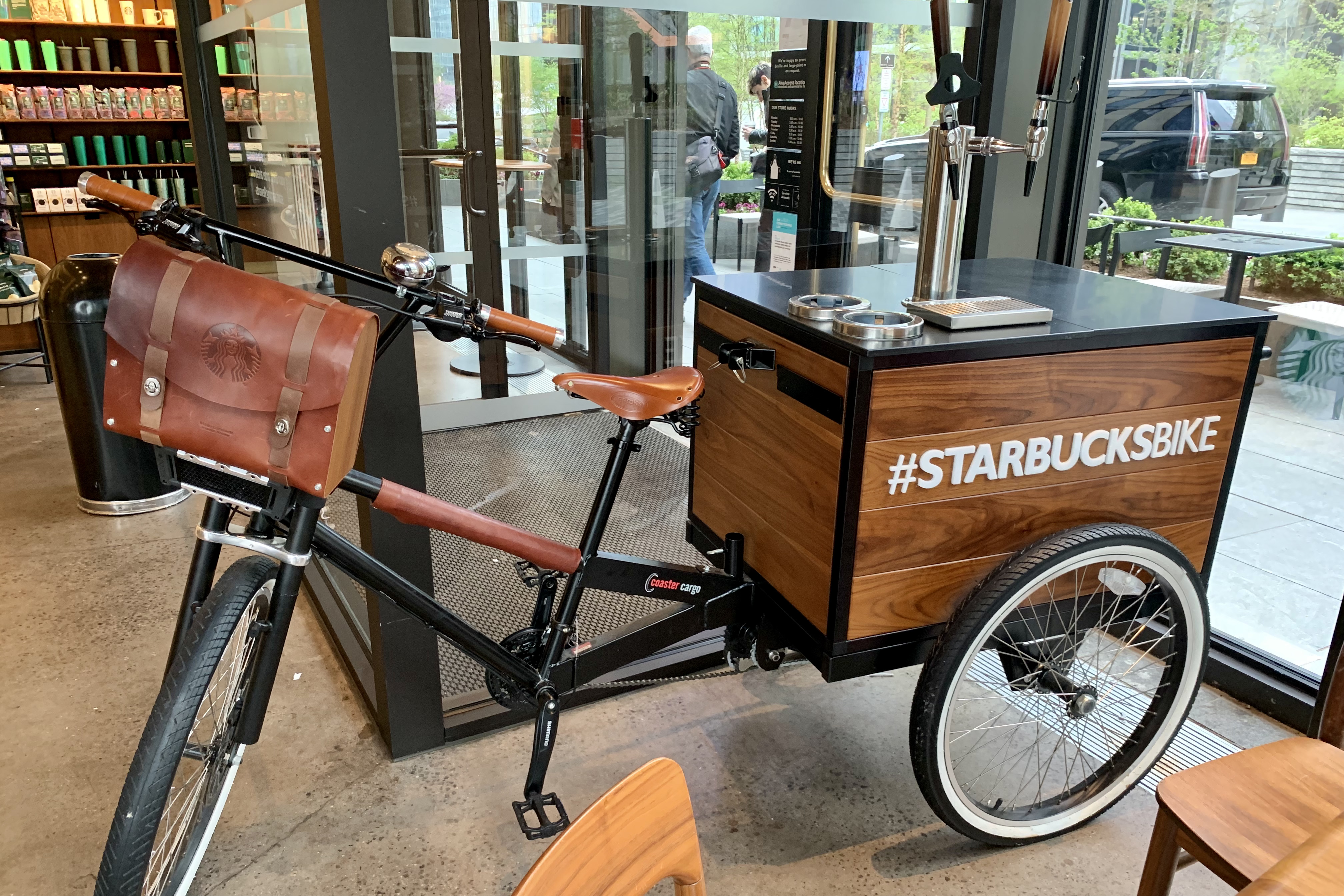 This area of the city is called Hudson Yards. When we exited by way of a couple of really long escalators going up, we were shocked to be greeted by strong cold wind. Walking High Line Park would not be pleasant in any way. We found a Starbucks, had breakfast, warmed up and came up with plan B. Great idea: a Starbucks bike: