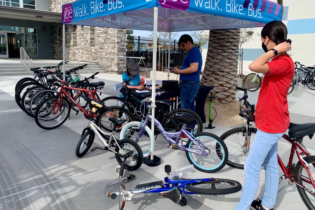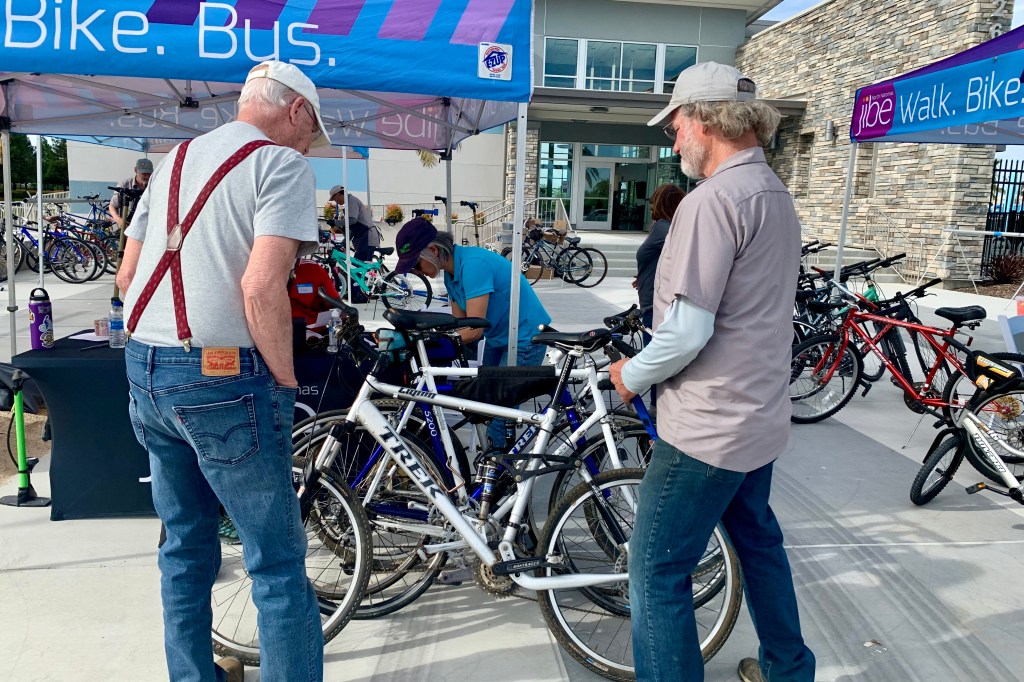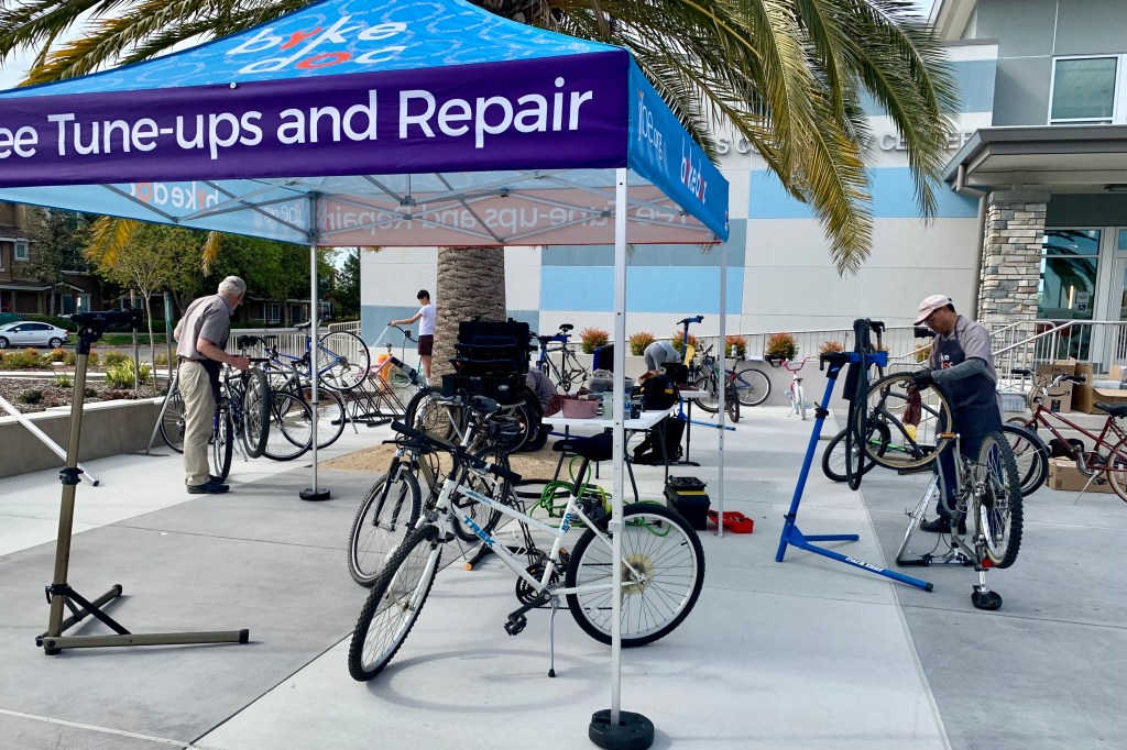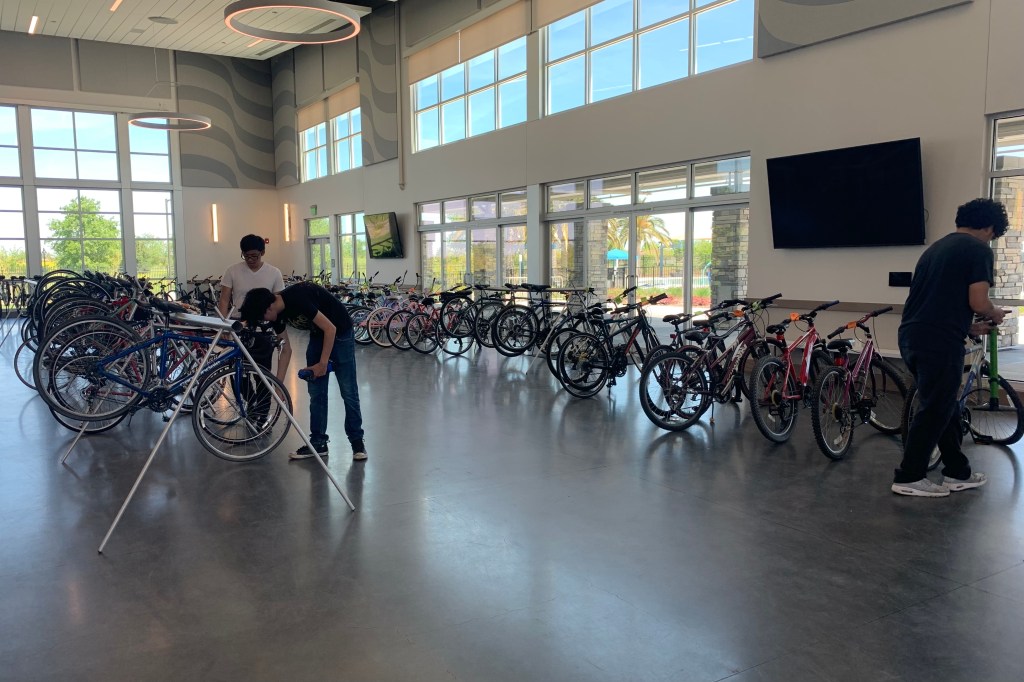 Bike Doc mechanics were available to repair bikes that were donated. In the background, students from the Bike Tech program at Inderkum HS cleaning bikes before repair.