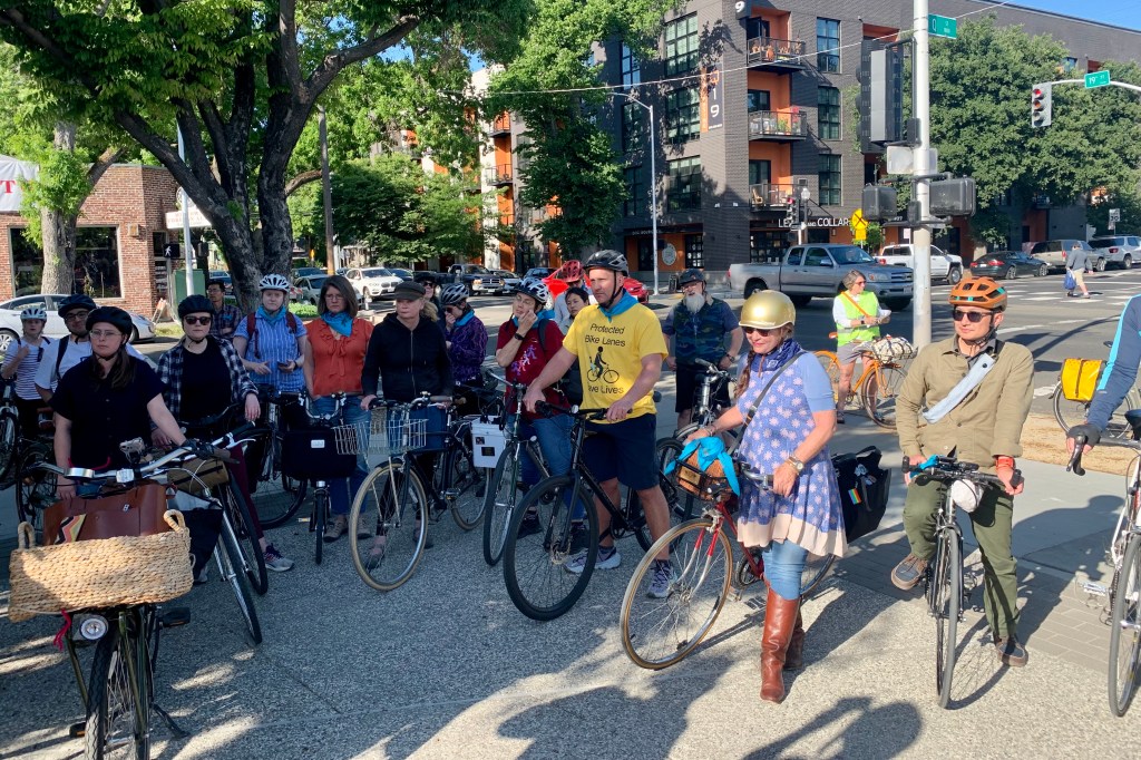Jennifer Donlon-Wyant organized this ride with City engineers and planners to tour bicycling infrastructure in Downtown Sacramento. 91 people signed up however only half that number showed up – whew, managing 90+ people on a downtown ride would have been challenging. Thanks to Deb and Rob from SABA for providing help at major intersections.