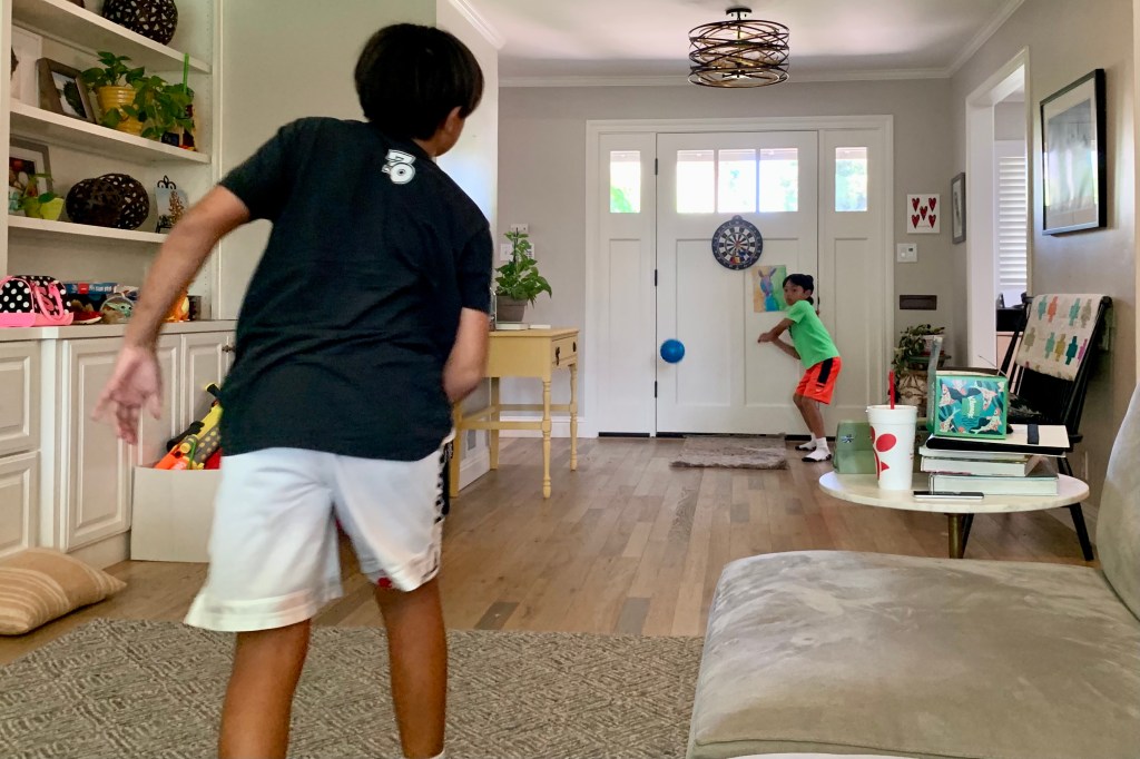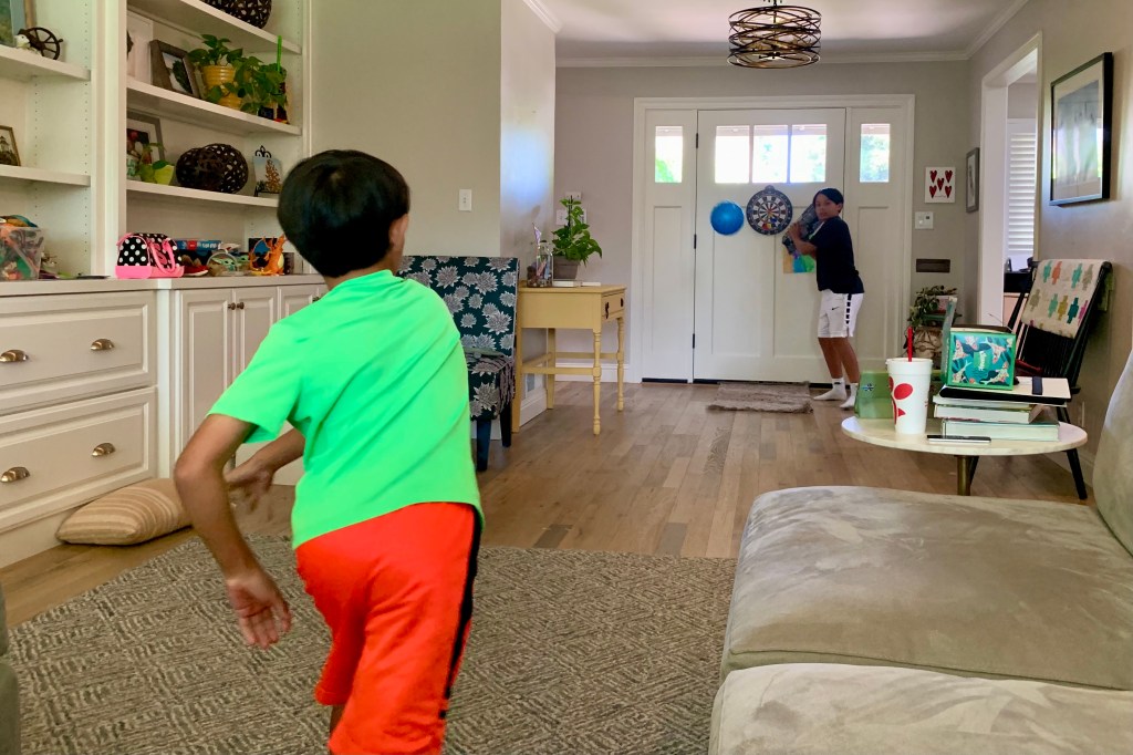 After games of pick up sticks, tiddly winks, and Chutes and Ladders, it was time for some livingroom baseball. This game was different. Thais came home but had an online meeting. I was sitting on the couch, Thais’ desk is behind me.