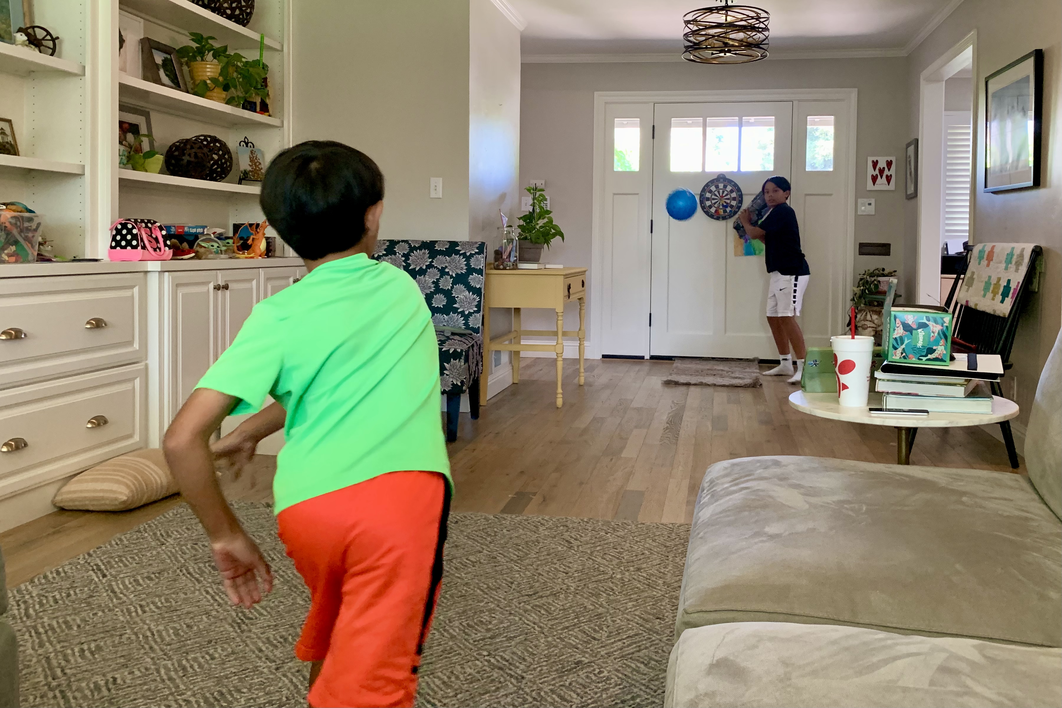 After games of pick up sticks, tiddly winks, and Chutes and Ladders, it was time for some livingroom baseball. This game was different. Thais came home but had an online meeting. I was sitting on the couch, Thais’ desk is behind me.