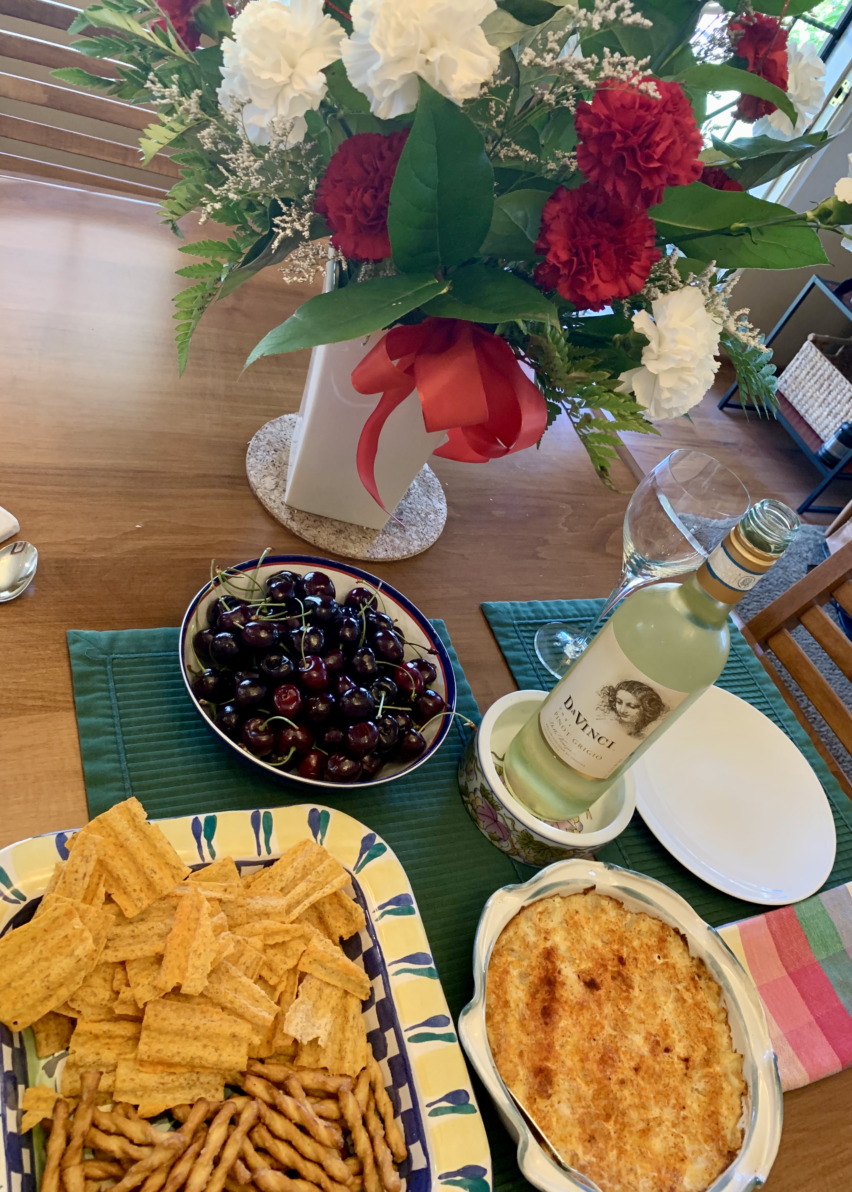 on Saturday. I came home yesterday (Friday) to a warm refrigerator and a thawing freezer. Within 15 minutes of sending texts to 3 neighbors, the meat was at Gerald and Viki’s, everything else was split between Elaine and Terri. I have the best neighbors and friends! This meant that I had to take the easiest-possible snack to Merrilyn’s: cherries and cheddar-flavored chips. Phyl brought Dot’s pretzels. Merrilyn made an artichoke dip.