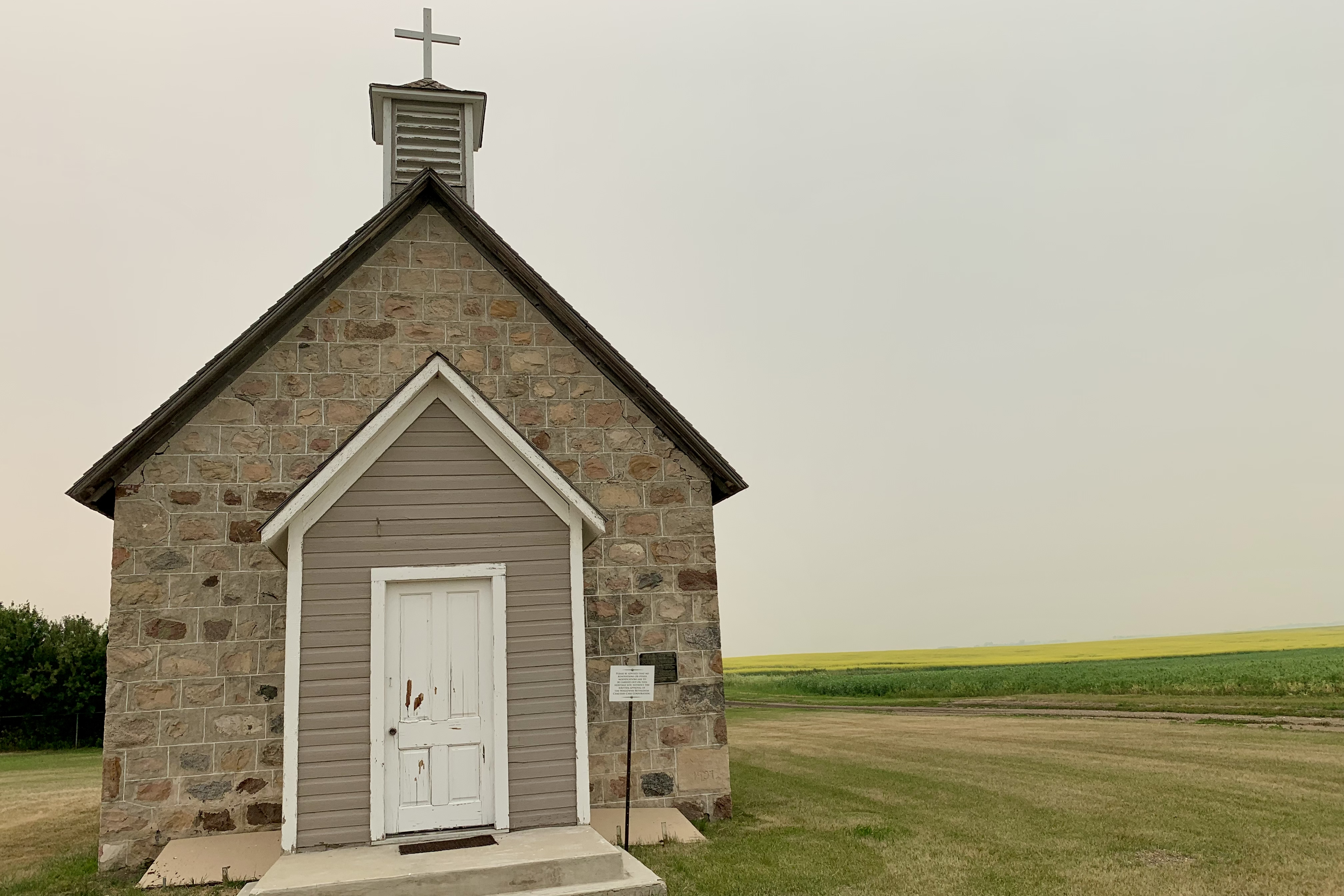 Wheatwyn Church where Glenn went to Sunday school and where both my parents were confirmed. The yellow field is canola, the green is field peas.