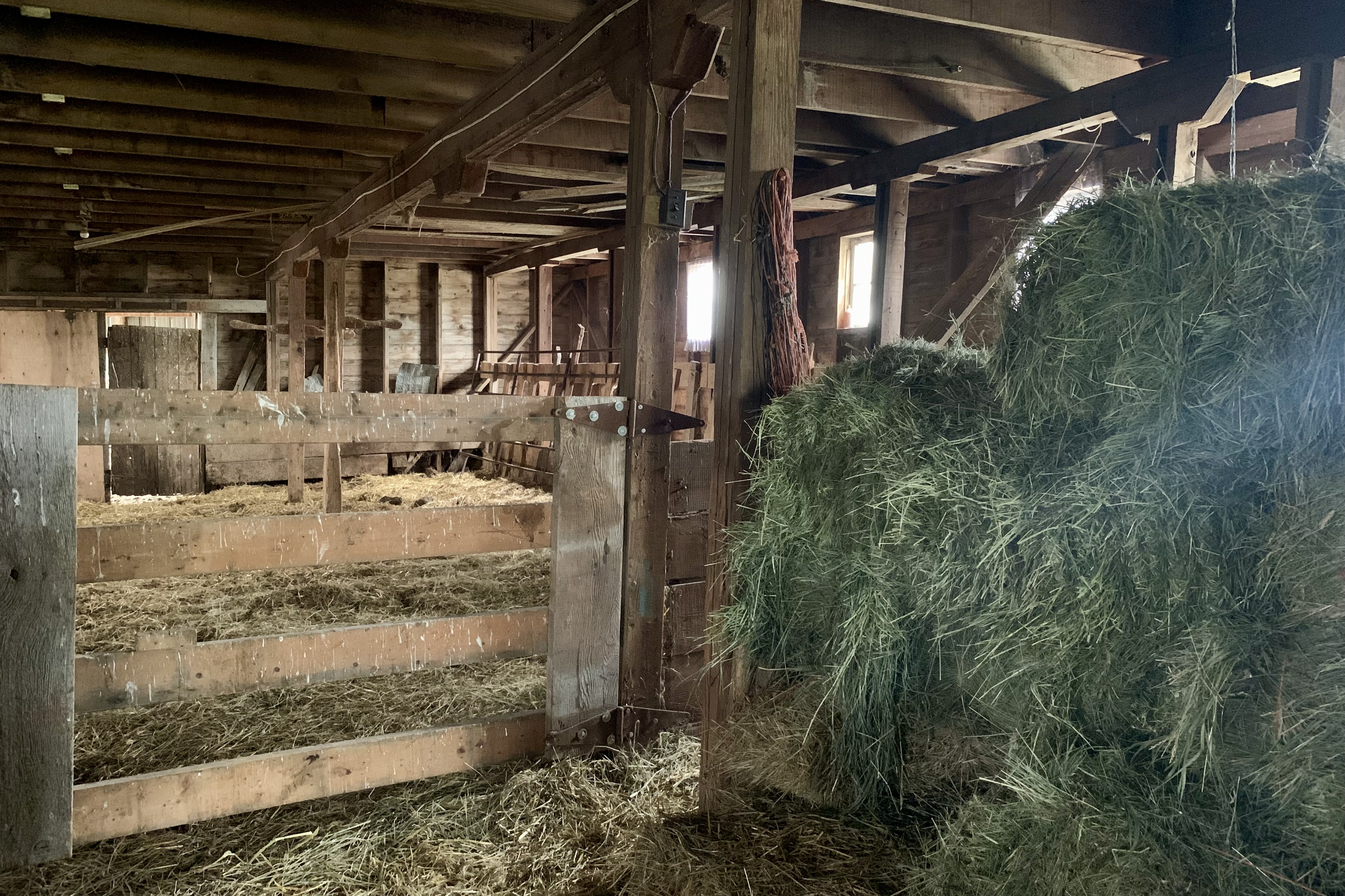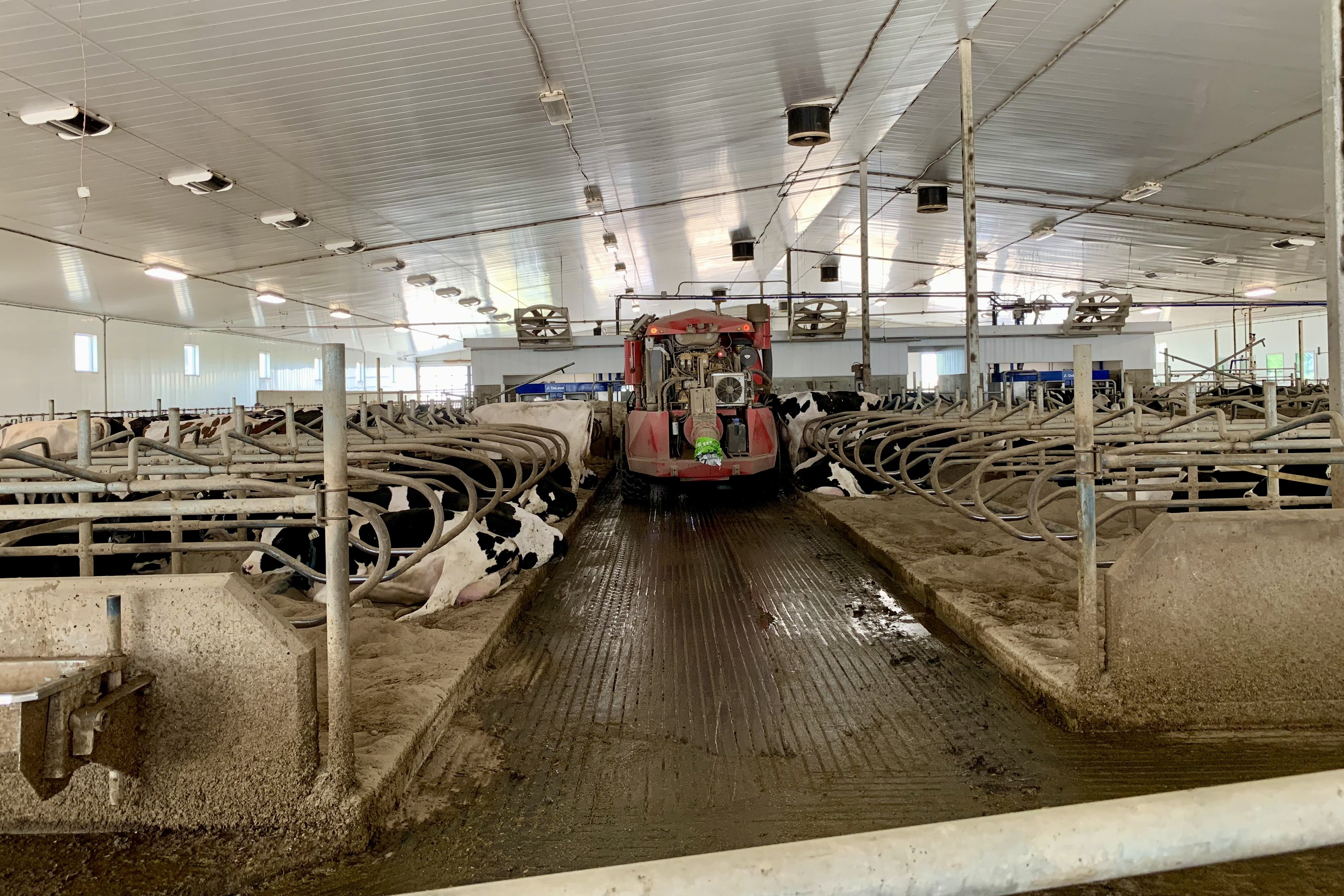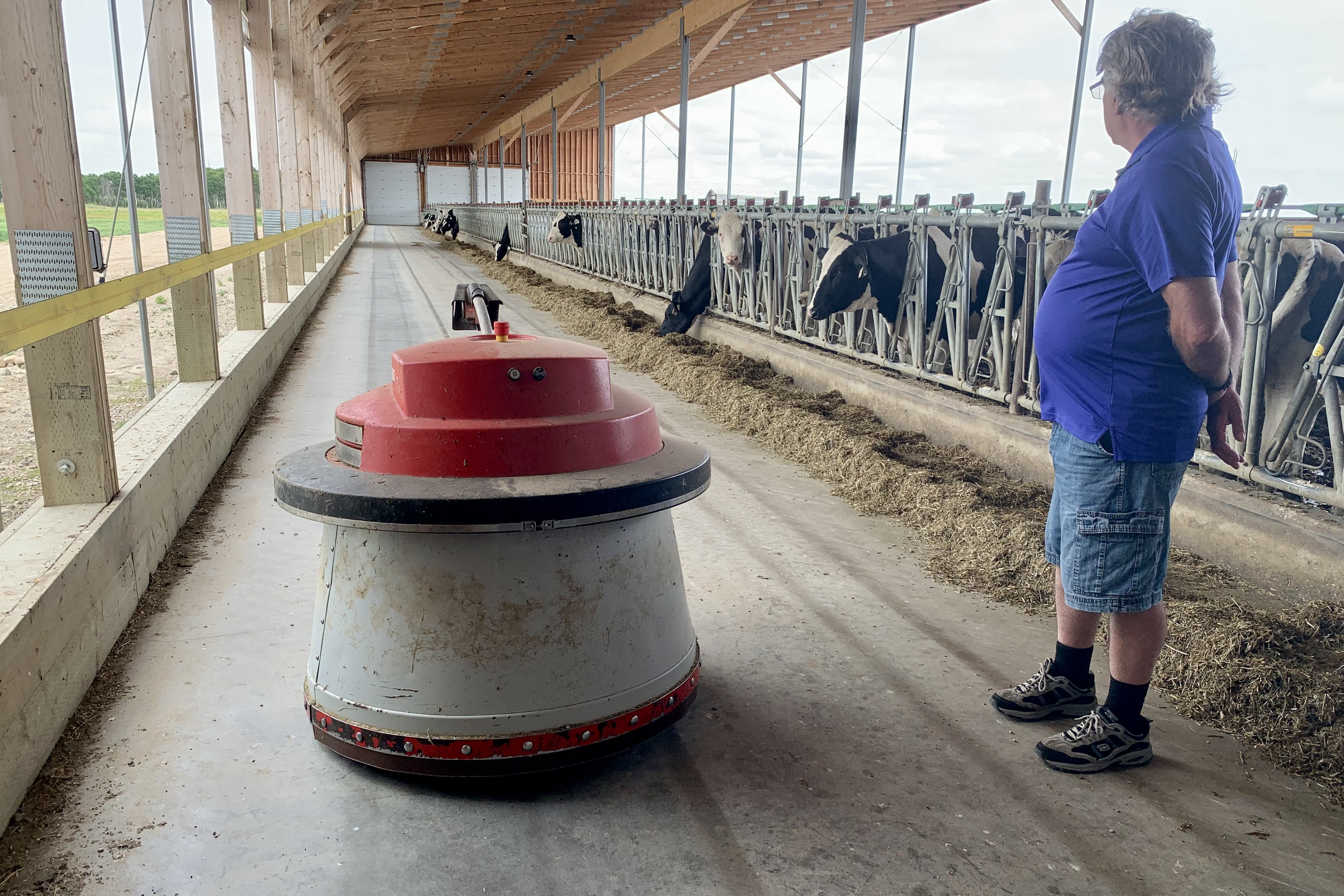 In a different barn, the next stage in the progression to becoming a milk cow. As these cows reach forward to eat their specialized mix of food, some of the food is pushed forward and out of reach. Periodically, this robotic machine leaves its charging station to slowly follow a magnetic path to the end of the building then turns back and begins spinning, pushing the feed closer to the cows.
