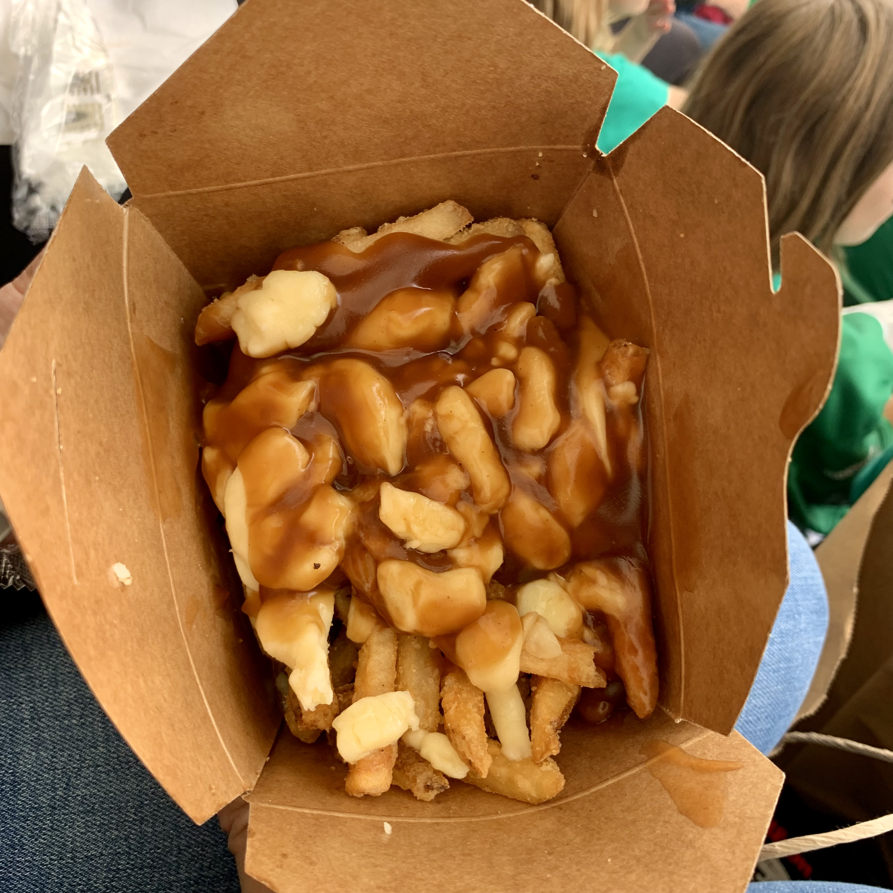 A stadium favorite: poutine. French fries, topped with gravy and cheese curds.