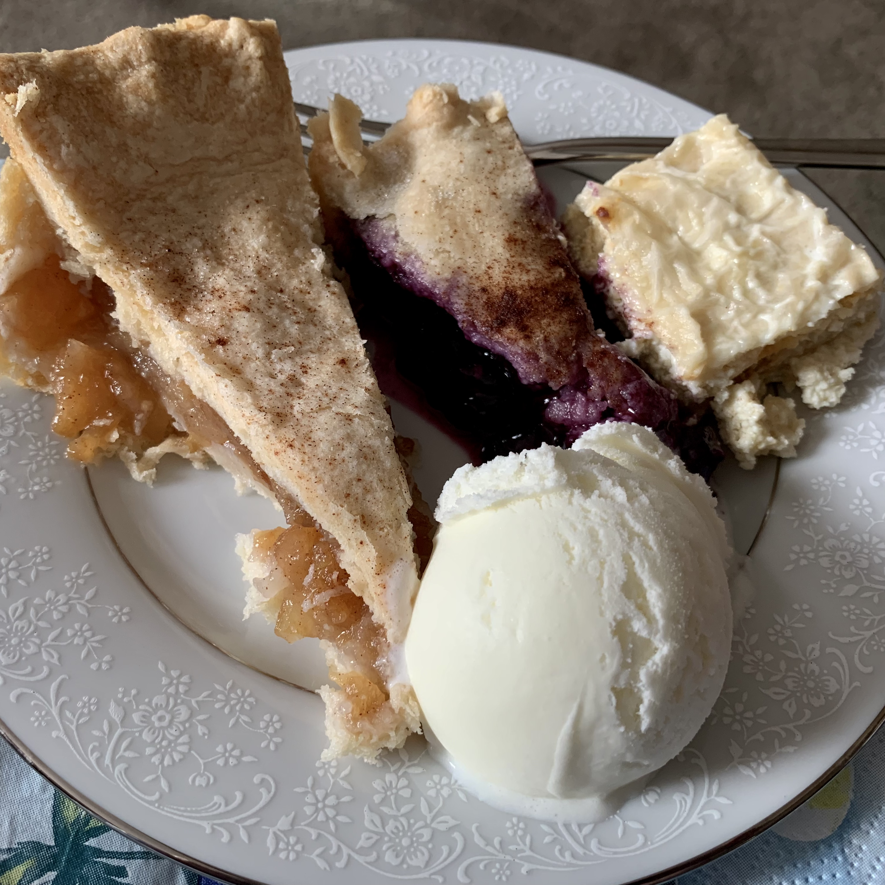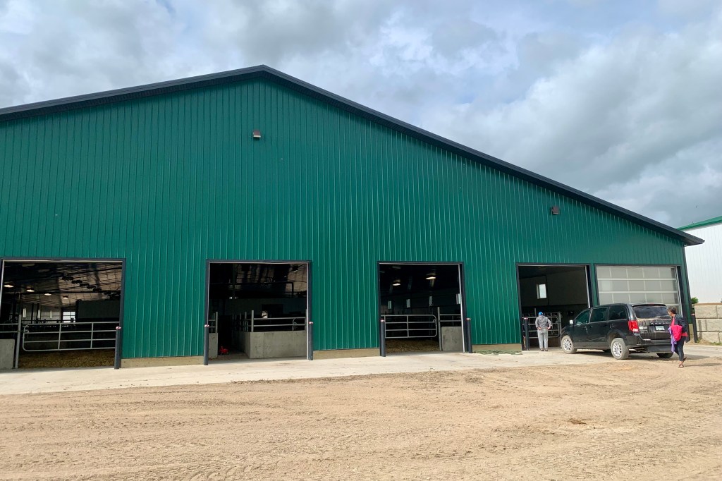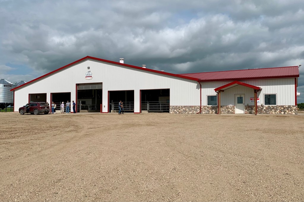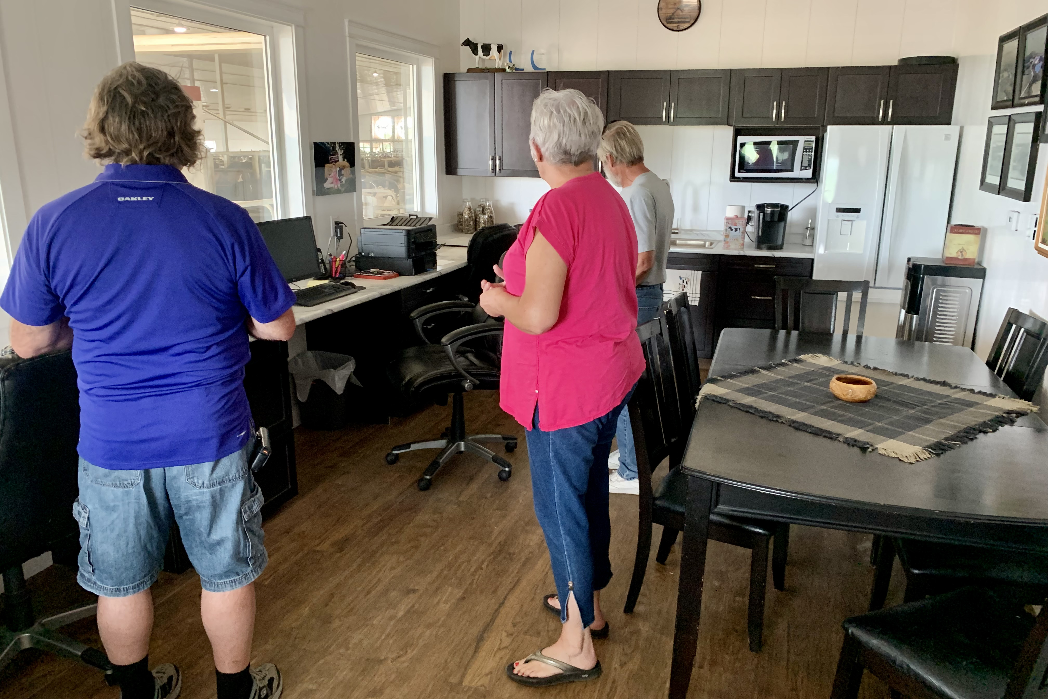 After breakfast with Jeanette and Steve (from Red Deer Alberta), we all droveto Balgonie to Joy and Brian’s dairy farm, Broyhill Holsteins. We started out at the house with drinks and dessert. Delicious dessert! Homemade apple pie, Saskatoonberry pie, and cheese strudel. And ice cream.