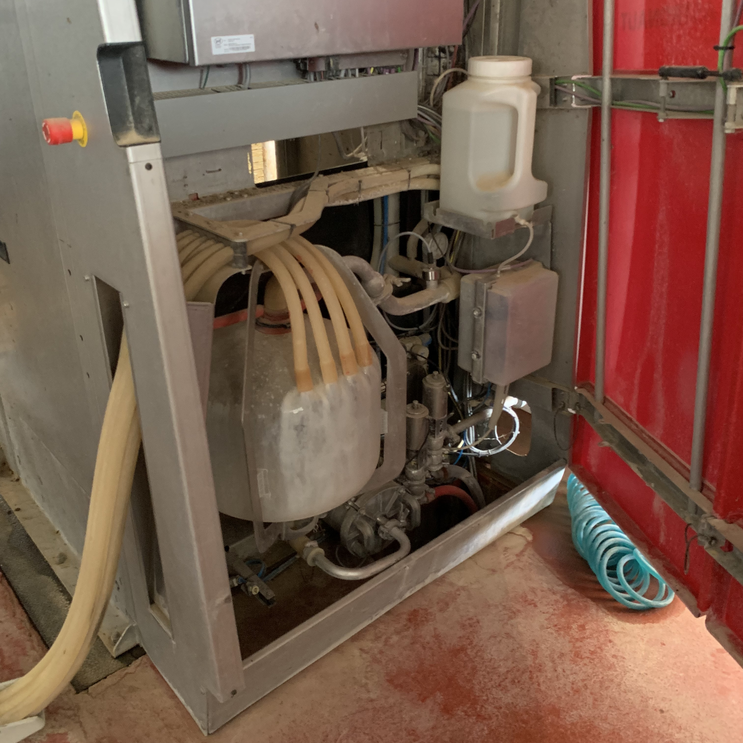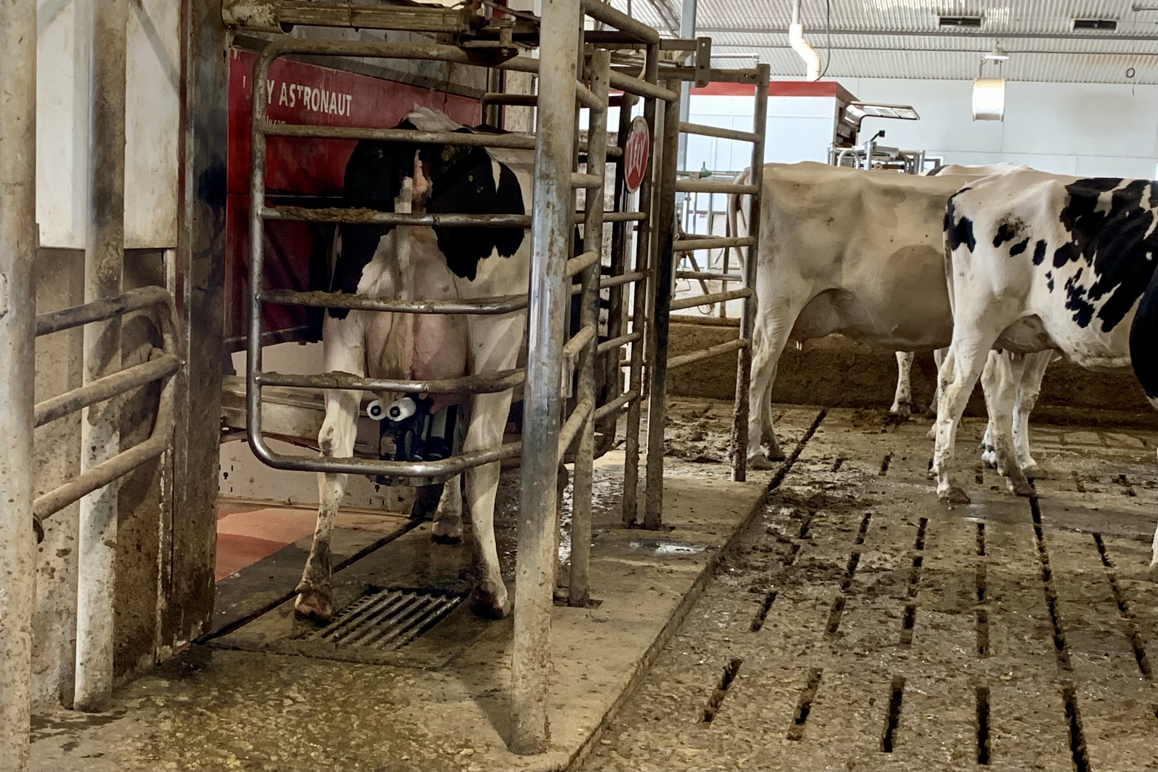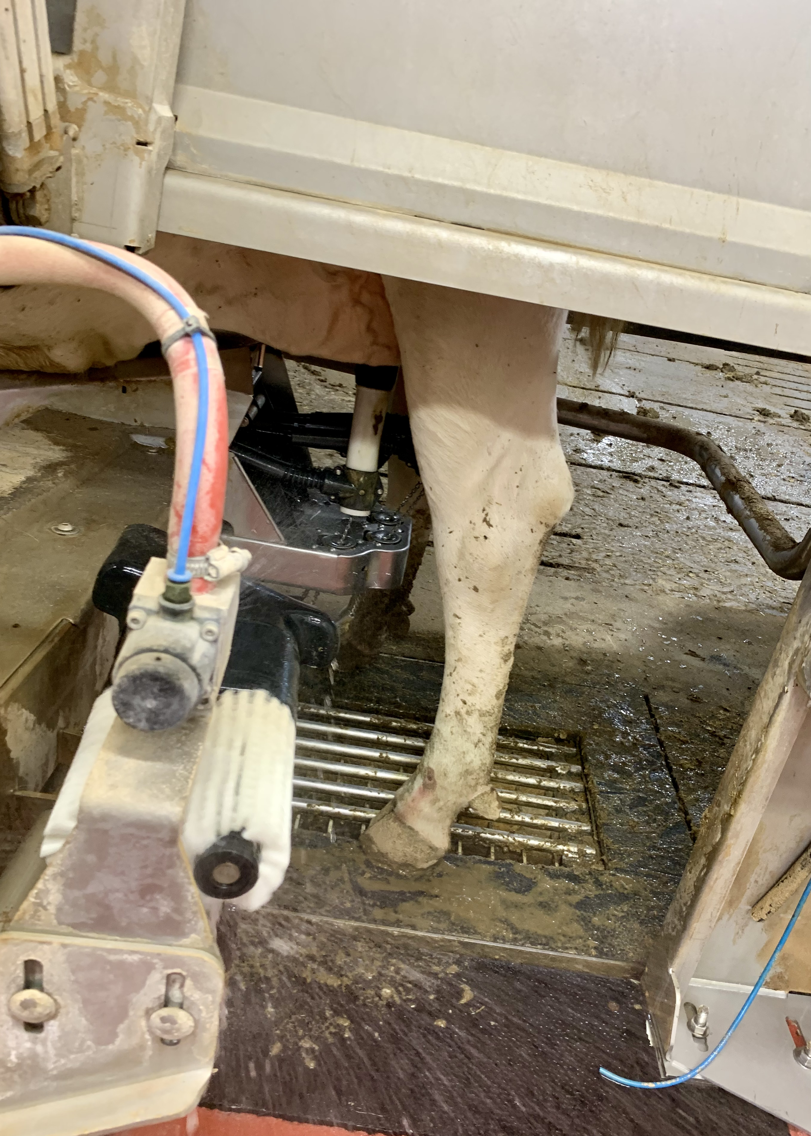 Each cow is easily recognized, her udder has already been mapped. The white brushes have swung away and milking tubes find the teats one at a time and attach. Then the machine quiets and the milk begins to flow.
