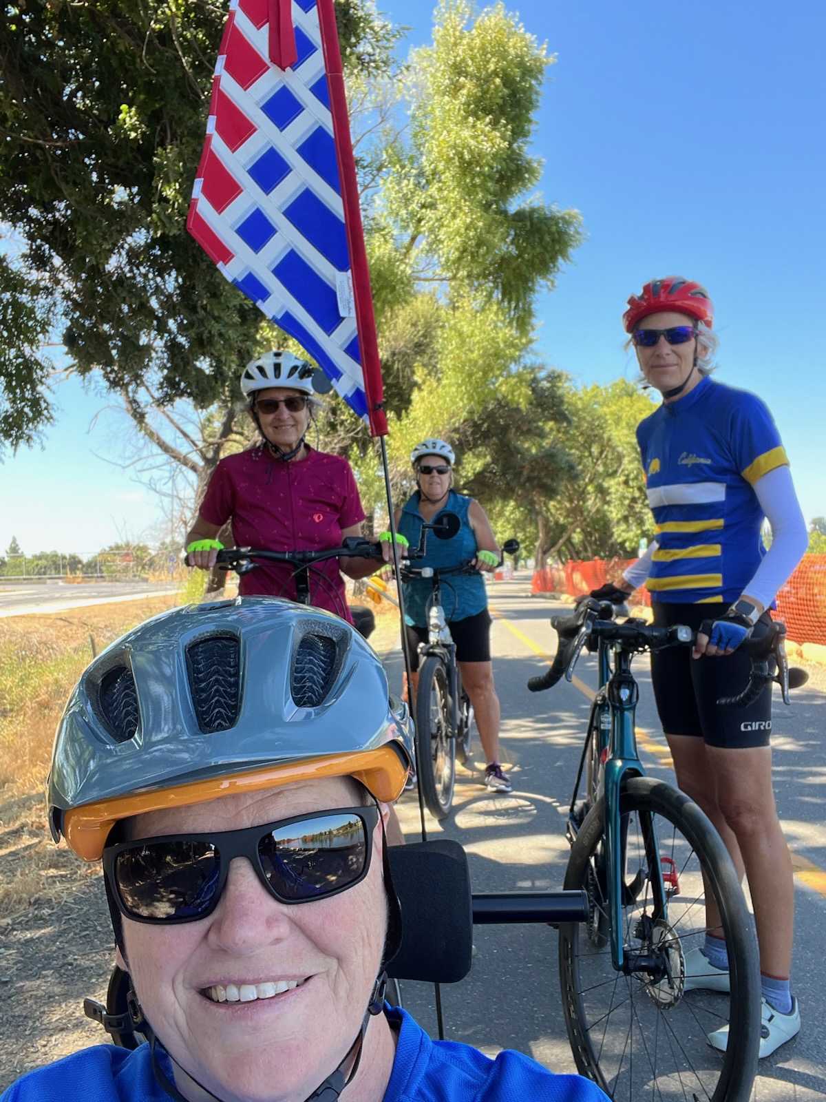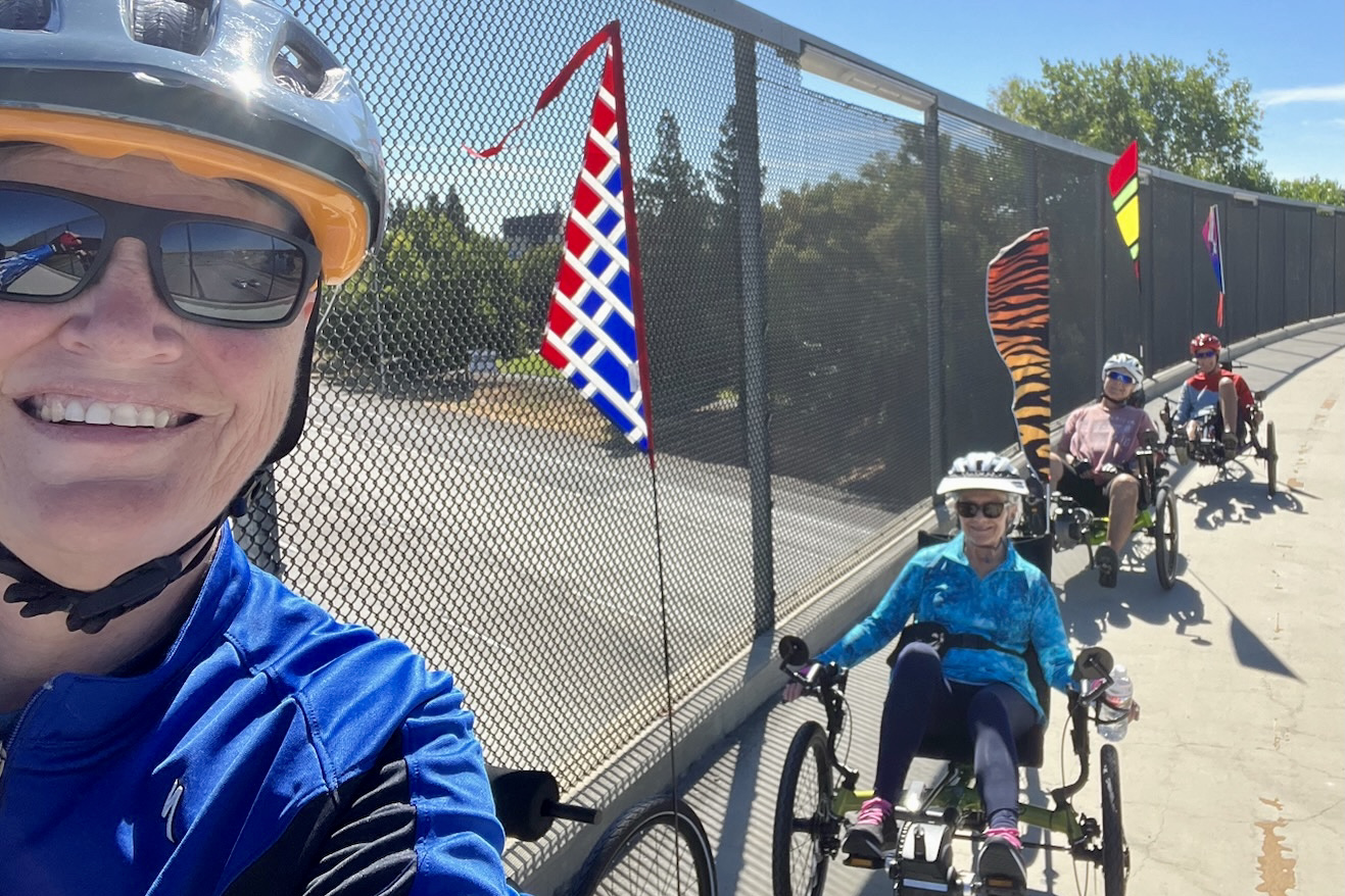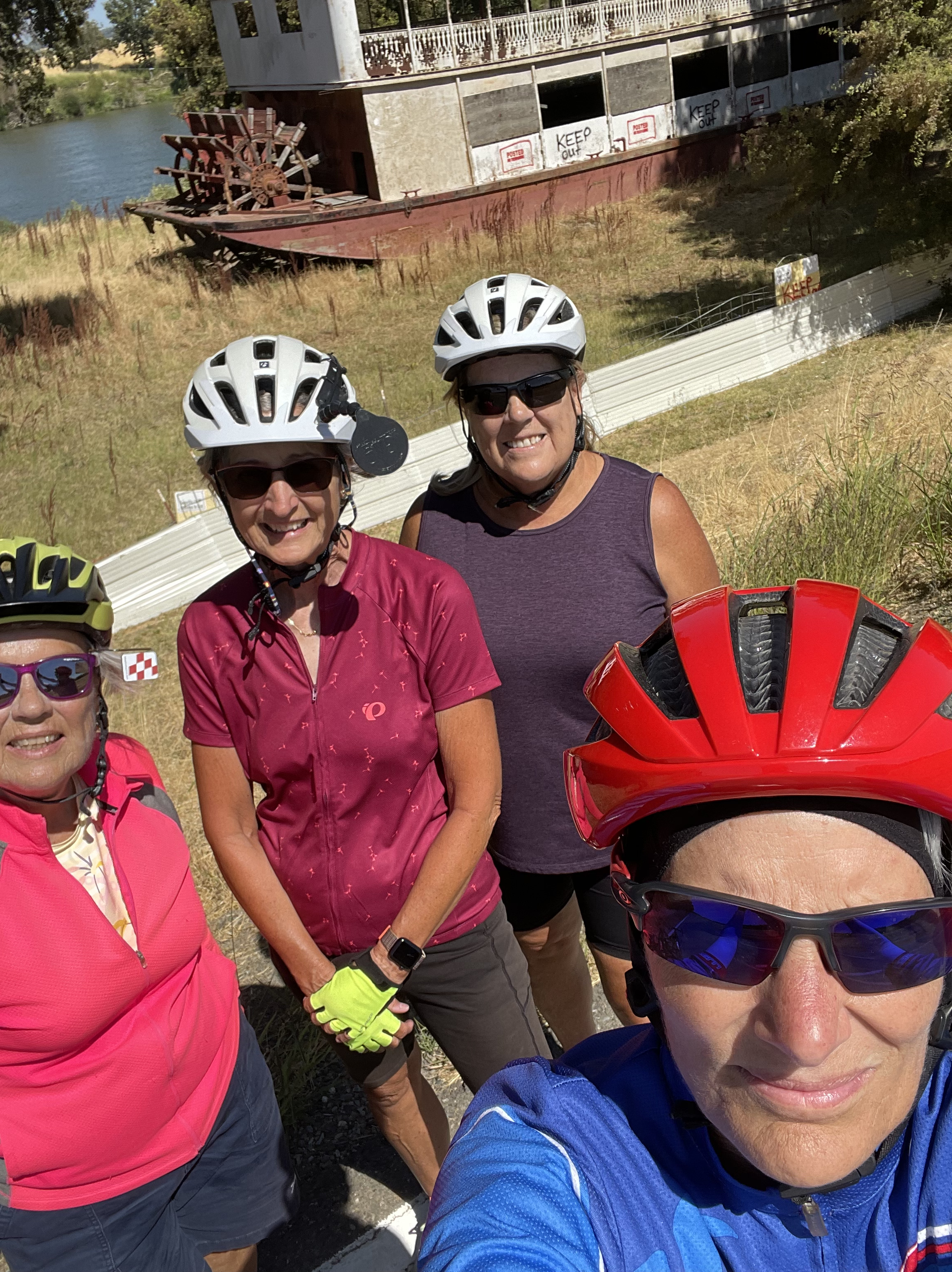 Thursday August 3. Me, Cheryl, Jane, Kathy on the Garden Highway – a very big paddlewheeler sitting and decaying on the bank of the Sacramento River just south of Riego Rd. It was once owned by John Wayne.