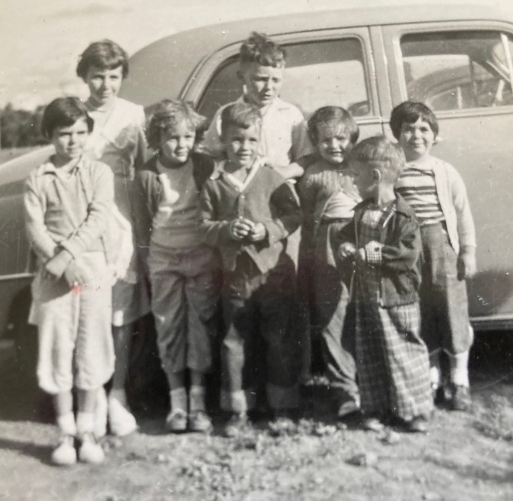This was our play group when we visited Saskatchewan in 1957. Back row: Kathy and Wade. Front row: Jeannette, me, Doug, Ruth, Gordon, and Sandra