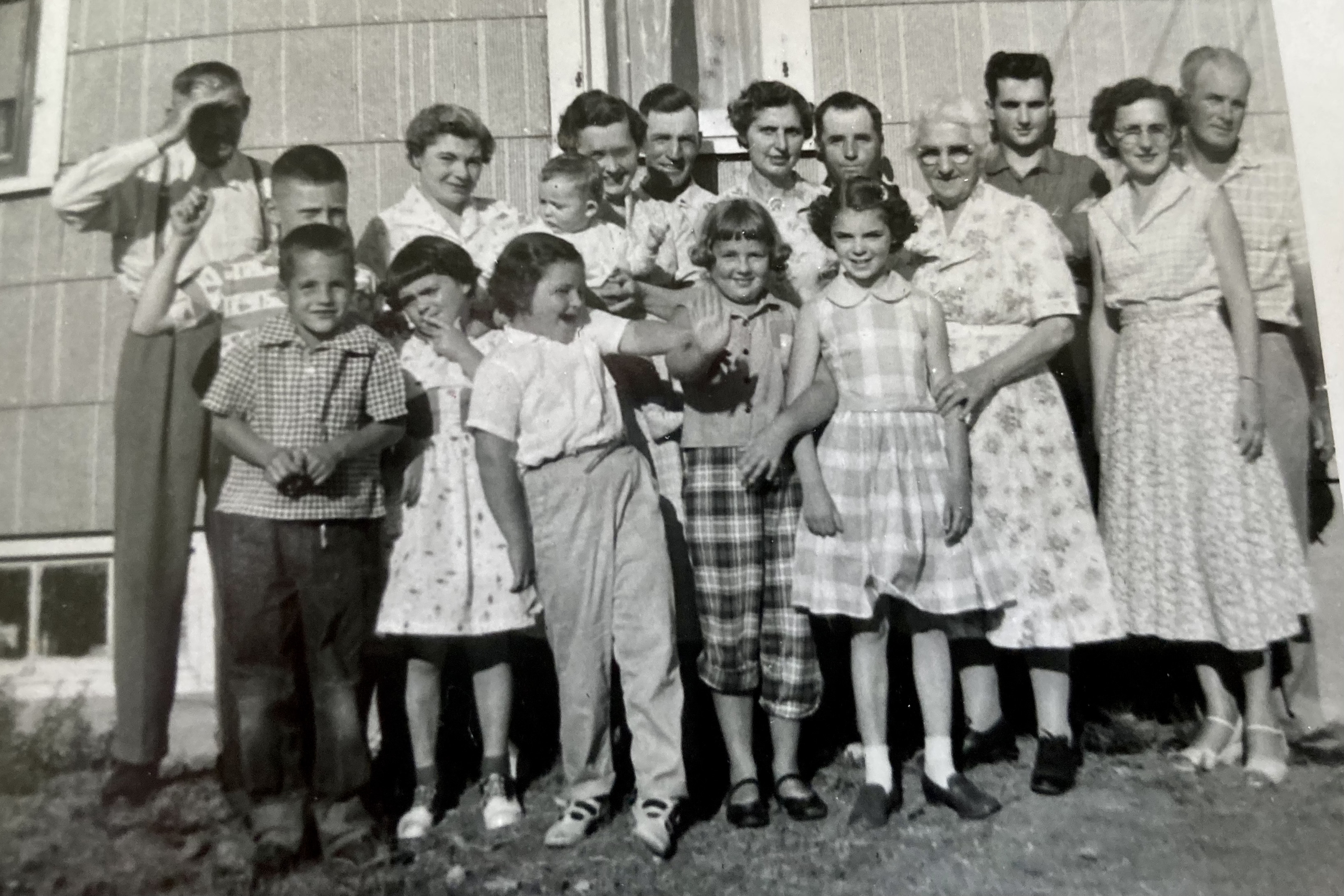 1959. Back row: Grandpa Manz, Ardyth, Joy held by Eleanor, Norman, Olga, Fernie, Ronnie, and my dad Ed. Front row: Doug, Sandra, Ruth, me, Jeannette, Grandma Manz, and my mom Alma.