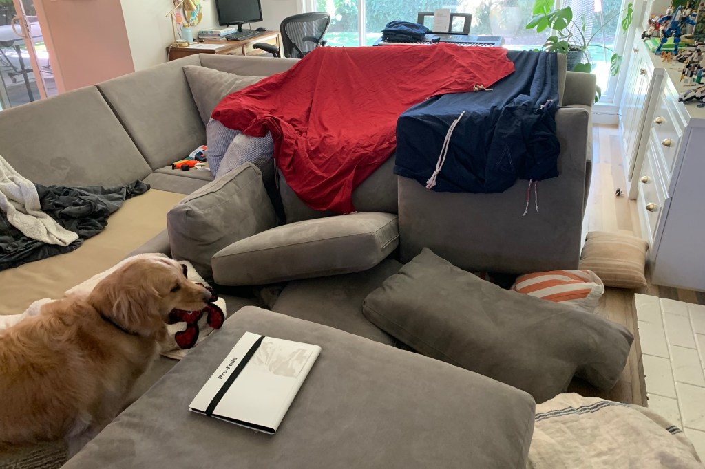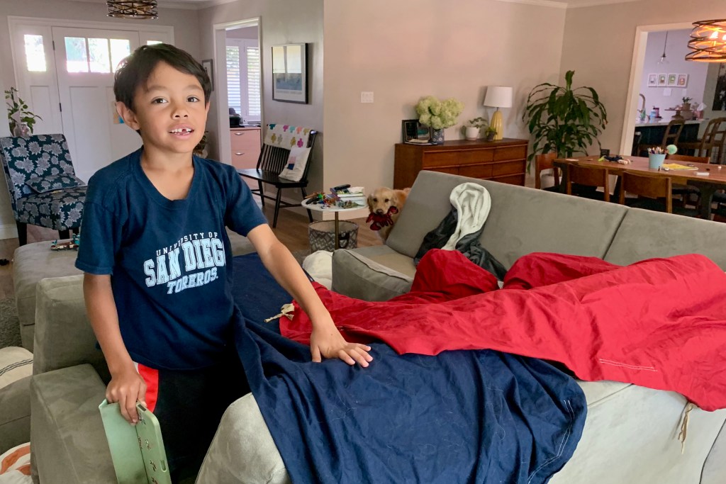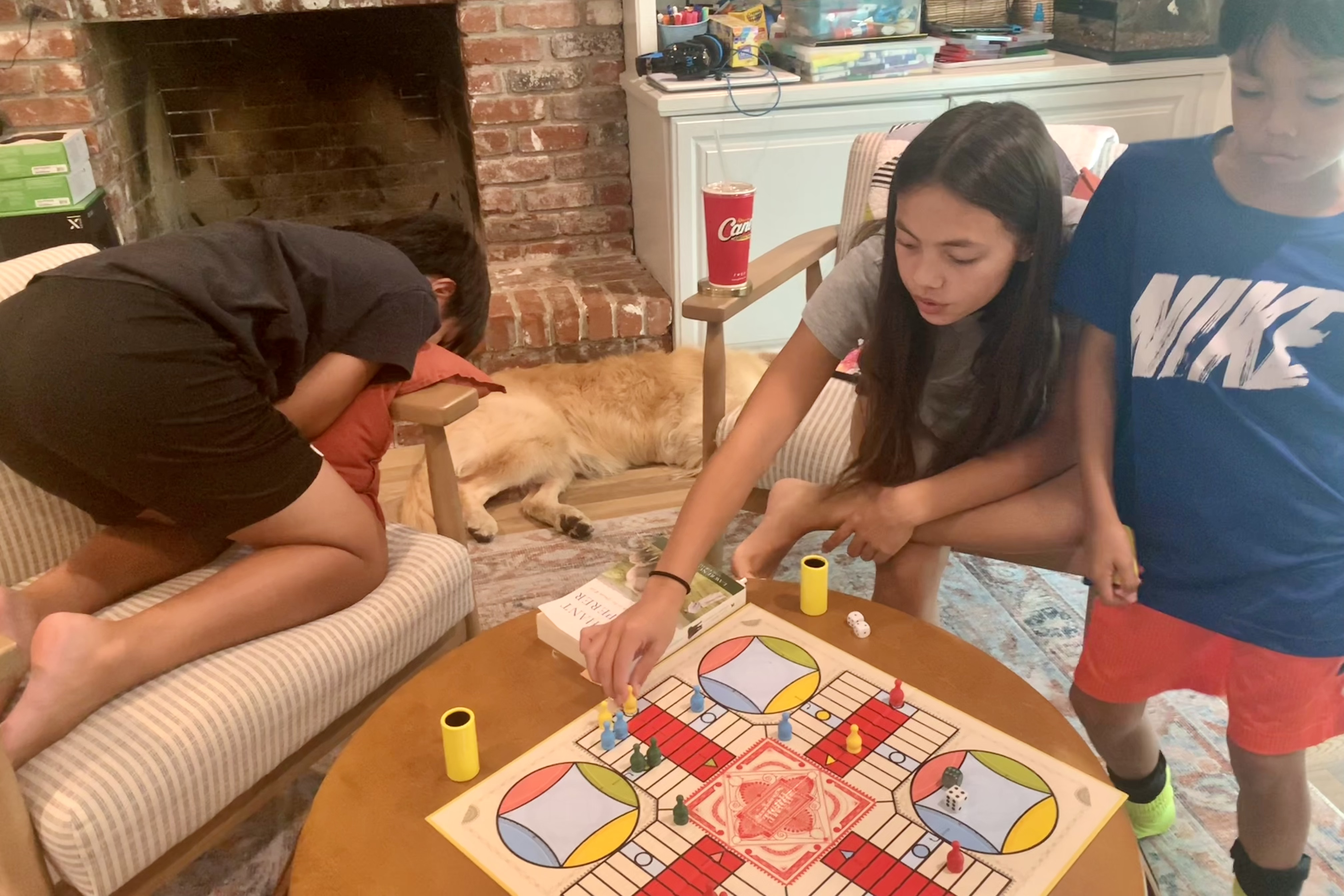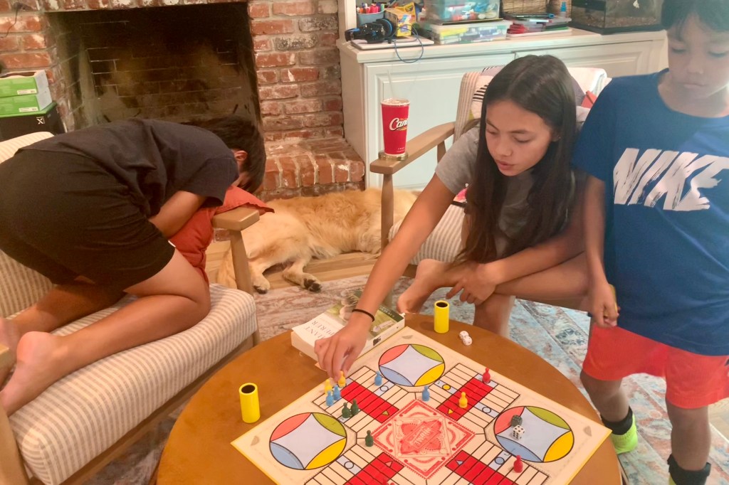 At last, four players. The player to the left sensed he was behind and began to lose interest. Sophia, the eventual winner. Carson, busy dancing to a song playing in his head, waiting for his next turn. Grandkids are so much fun.