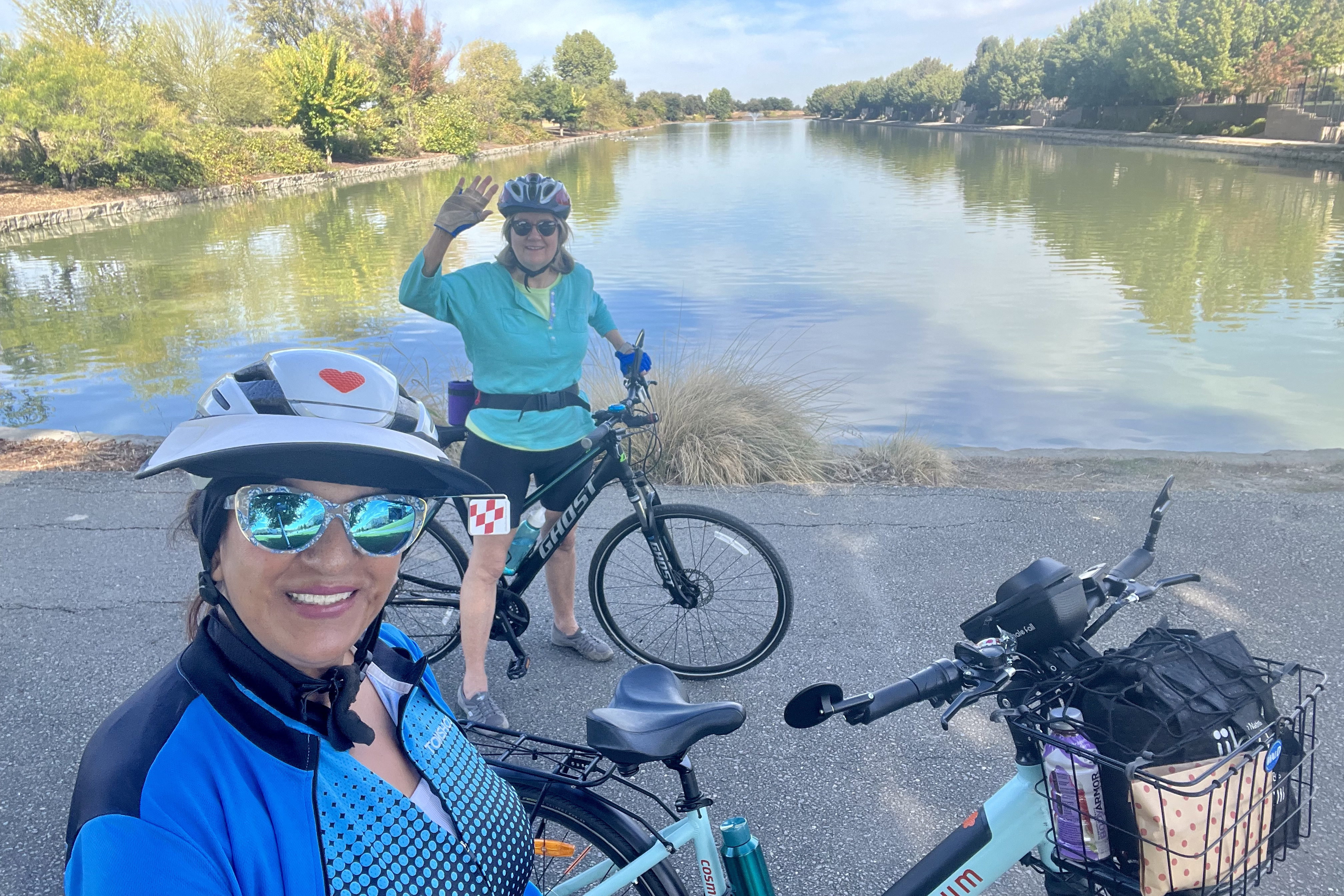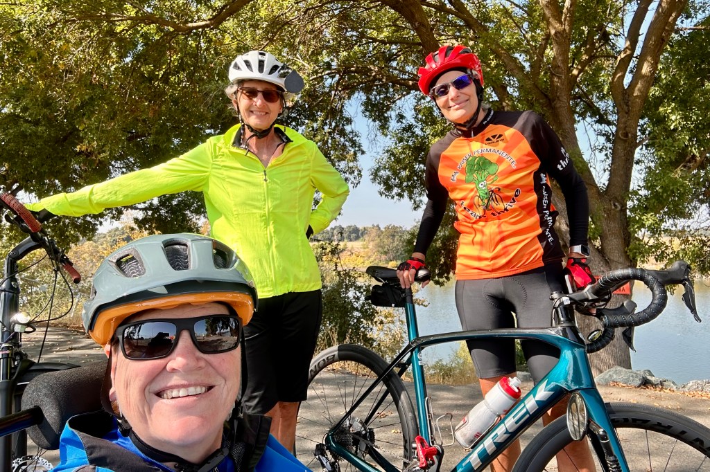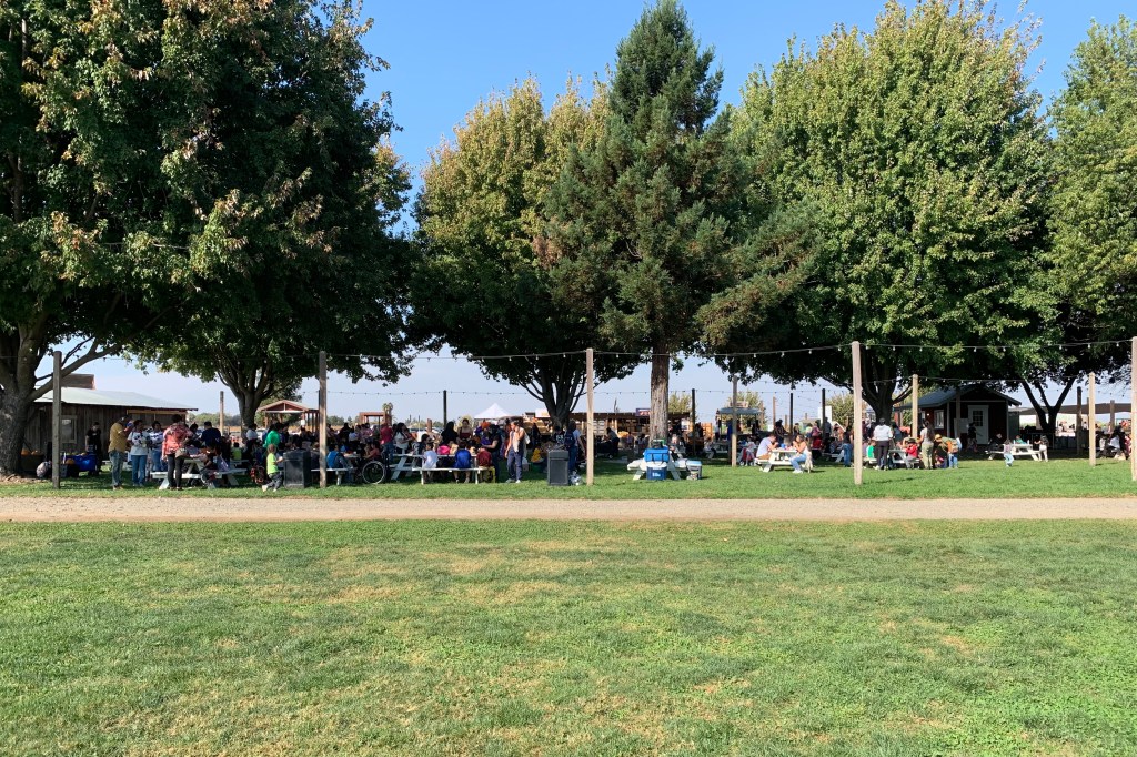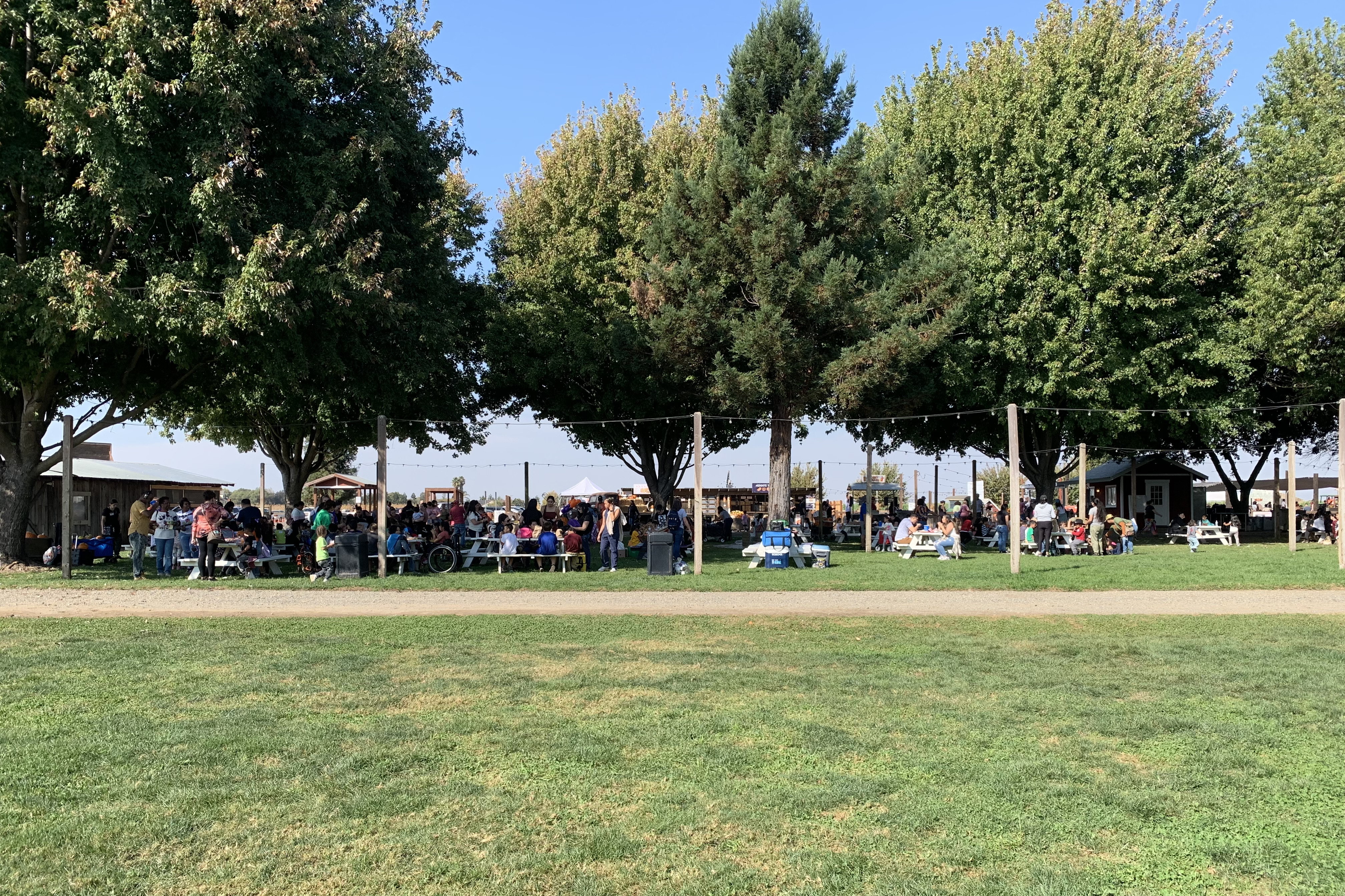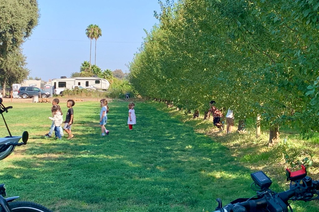 Above: Me, Cheryl, Barbara, Terri, Dani, Rosalyn. This morning we rode about 16 miles to Dave’s Pumpkin Farm in W Sacramento … just in time for MANY school buses of school children on field trips having their lunch. Every table was taken except for one far away from the crowd in the shade of a row of trees. Perfect. I watched the bikes while the others found and bought lunch. This was my viewpoint …