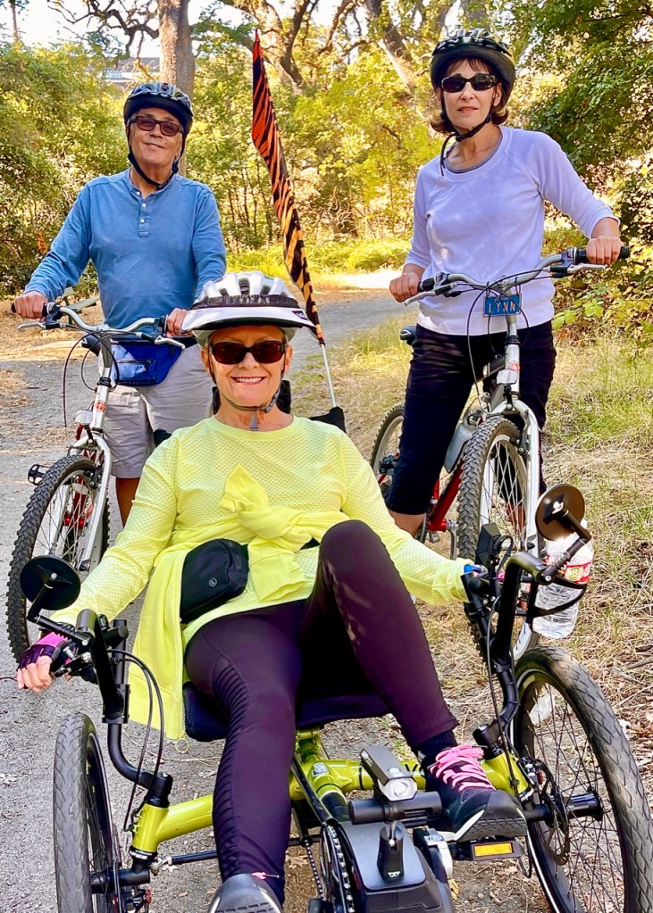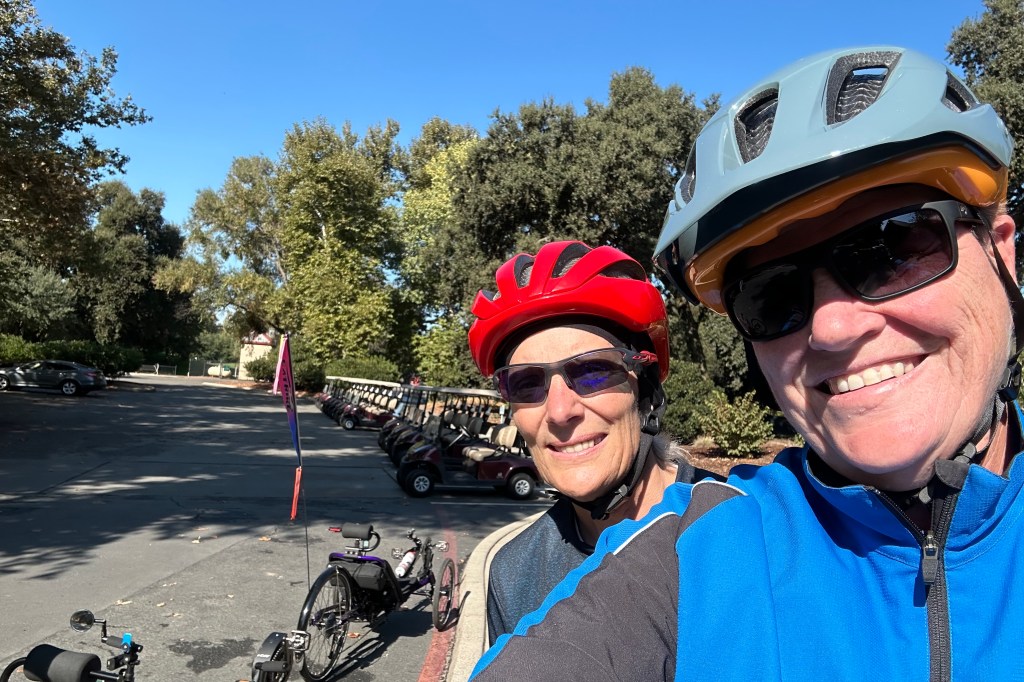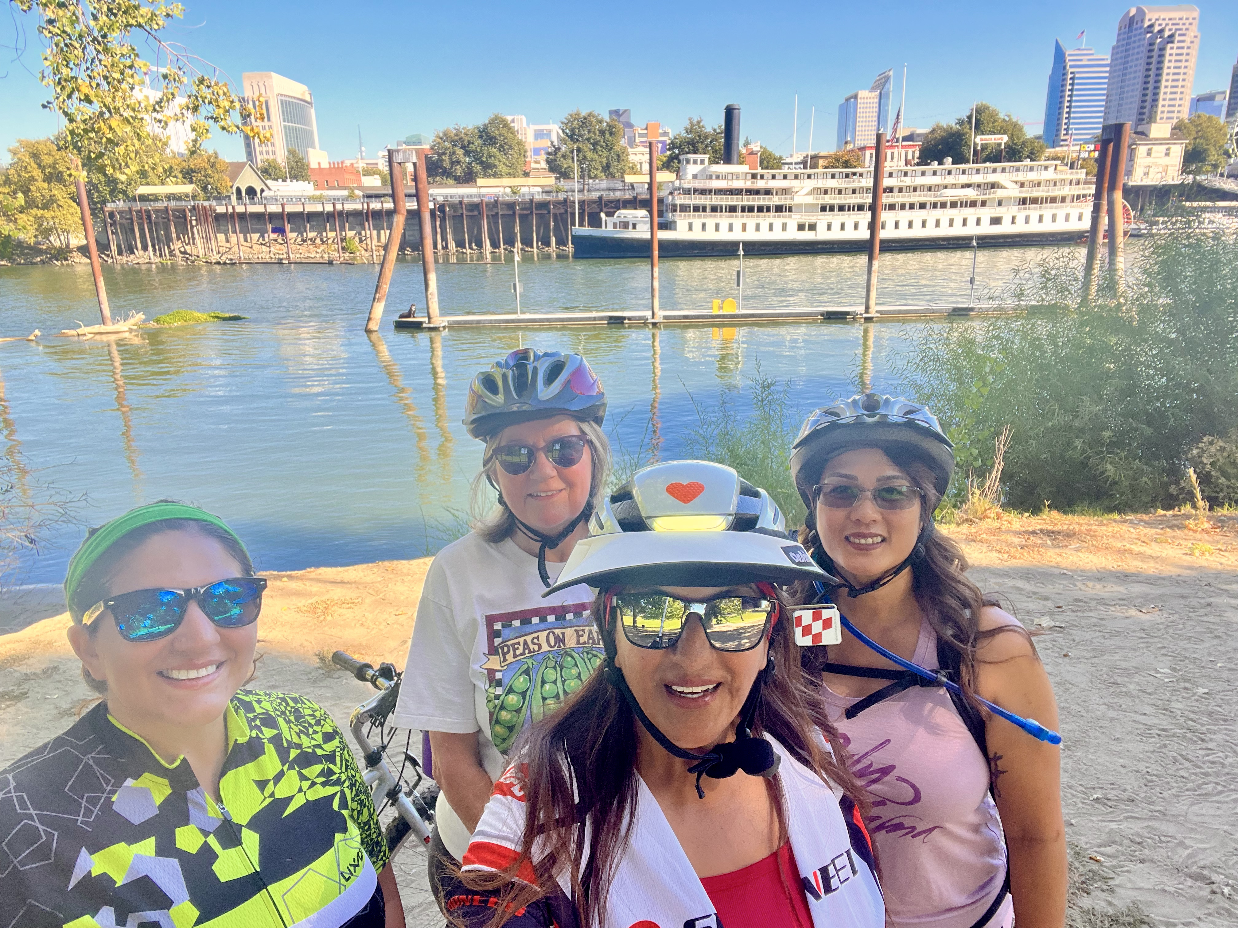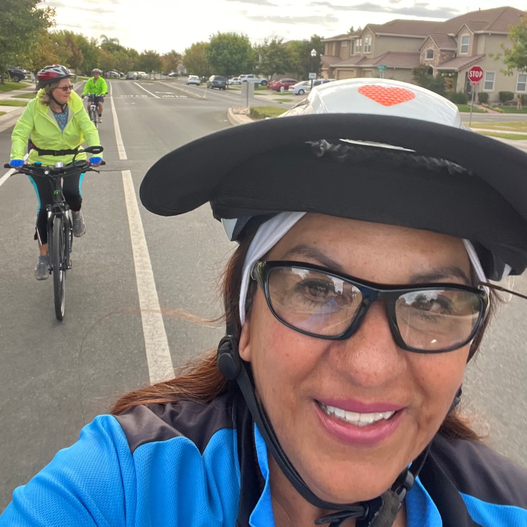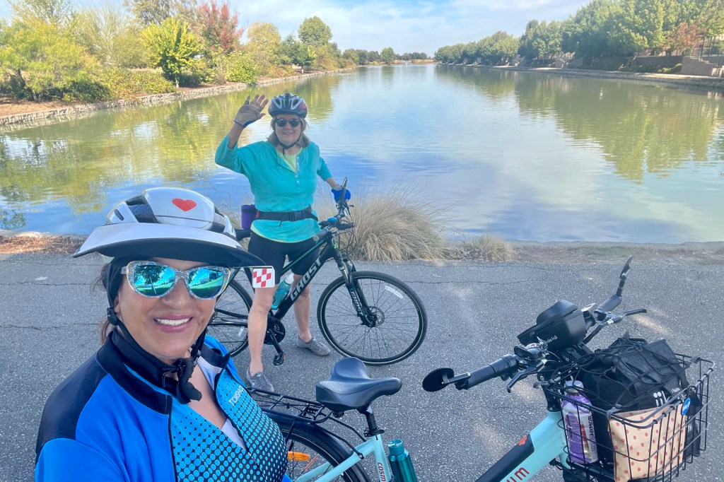 Above: Me, Cheryl, Barbara, Terri, Dani, Rosalyn. This morning we rode about 16 miles to Dave’s Pumpkin Farm in W Sacramento … just in time for MANY school buses of school children on field trips having their lunch. Every table was taken except for one far away from the crowd in the shade of a row of trees. Perfect. I watched the bikes while the others found and bought lunch. This was my viewpoint …