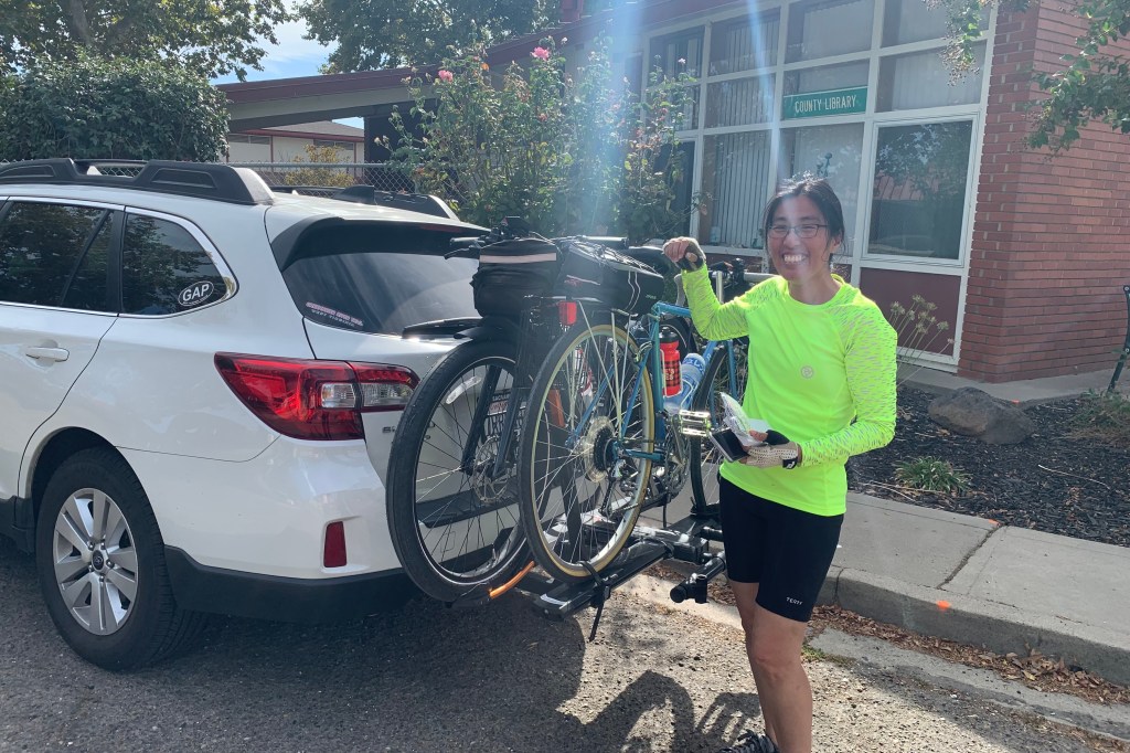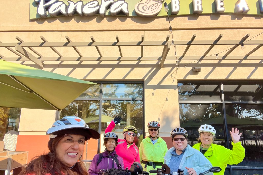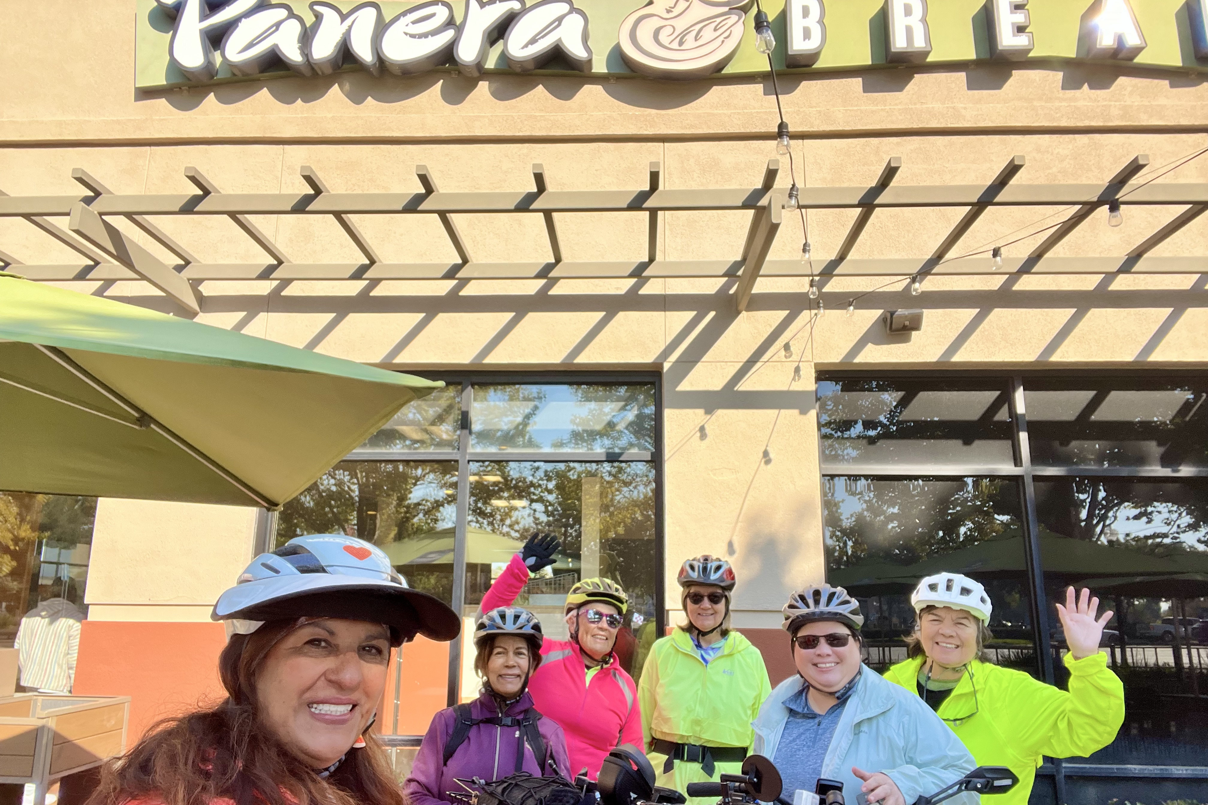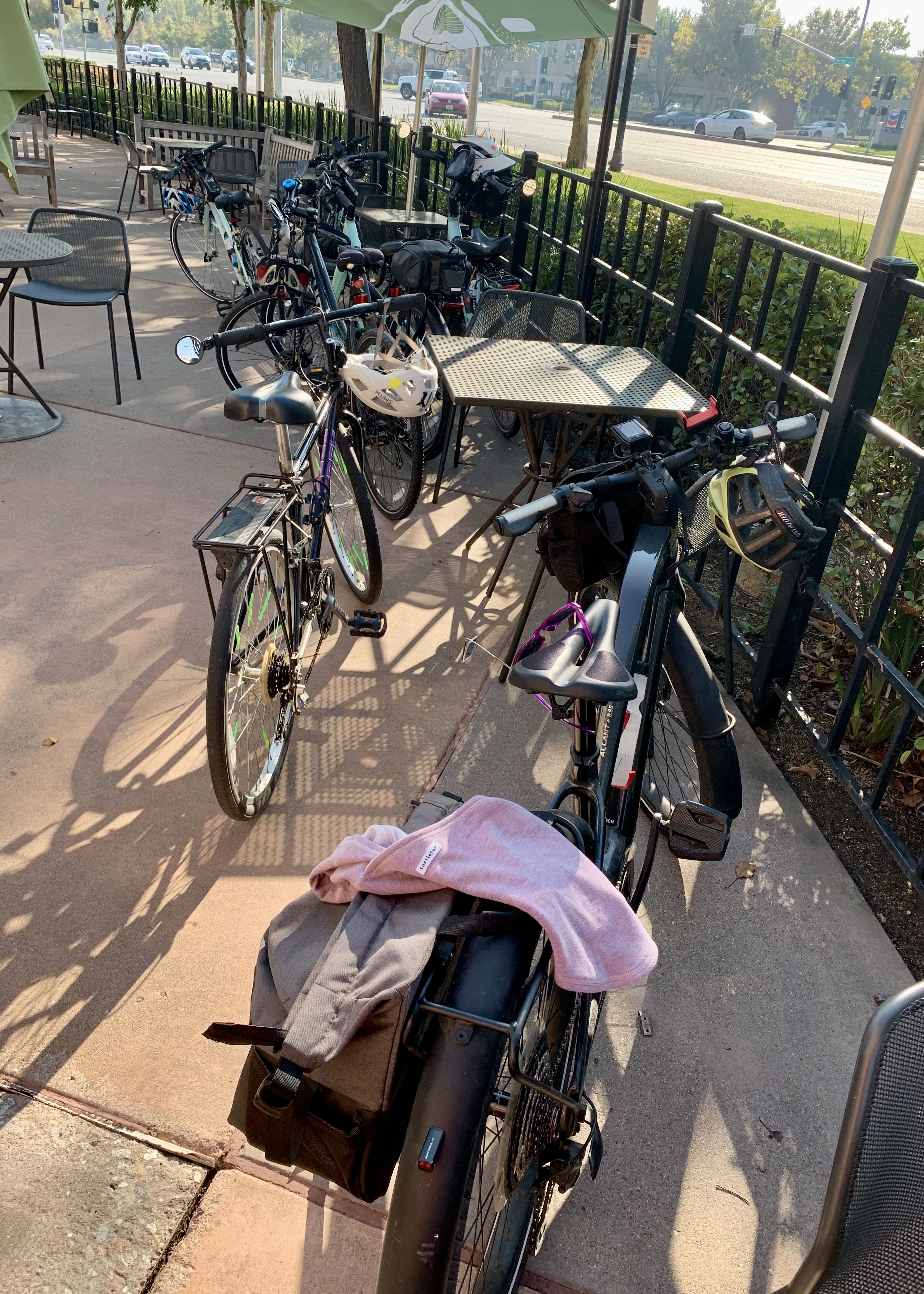 The last one for this Jibe promotion. Brenda, Agueda, Lennore, Minerva, Rachel, Laurie and I all rode and met at Panera this morning. Great bike parking: