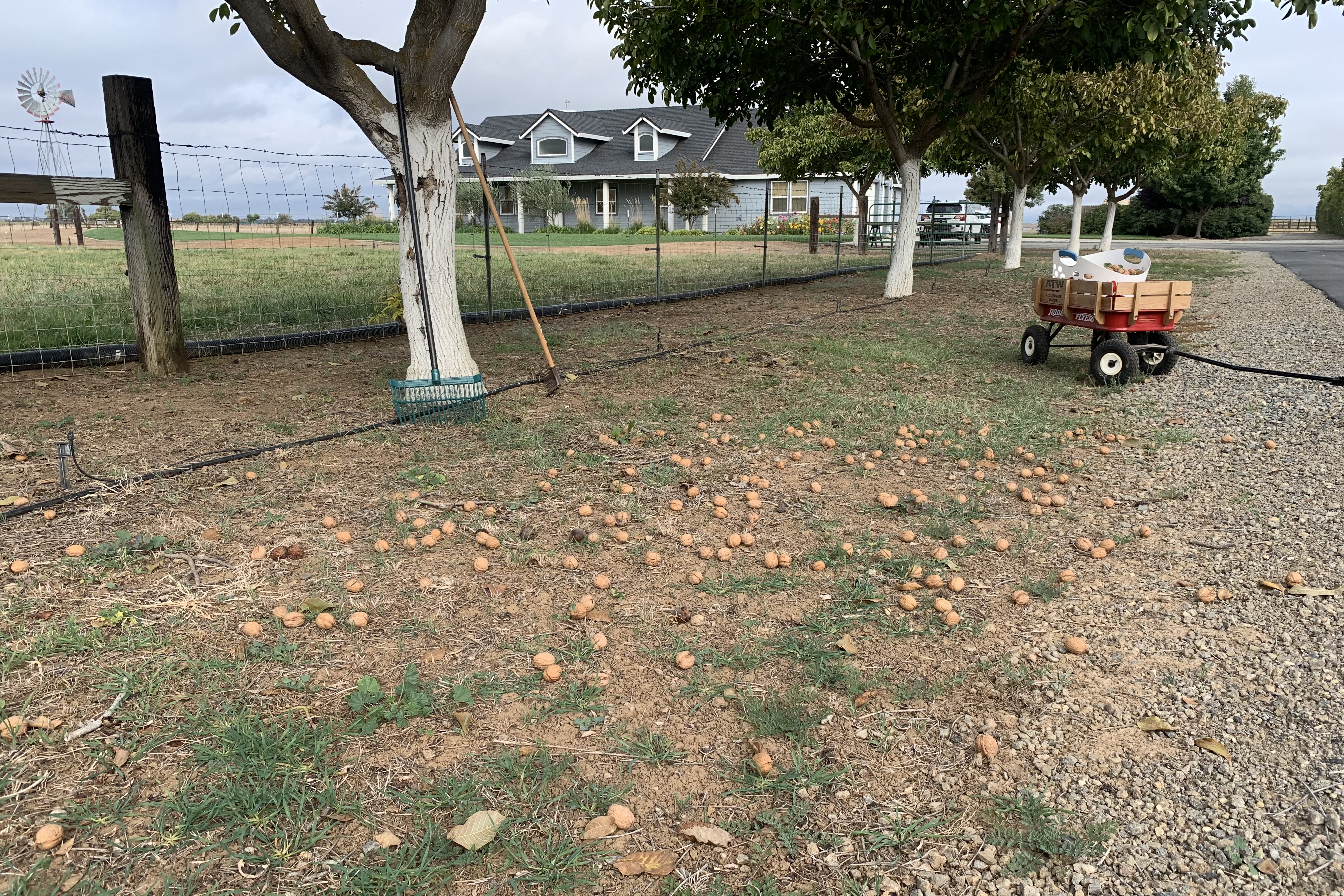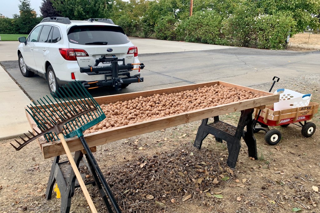 On Sunday morning, I bagged the walnuts that had been drying and managed to rake and gather from 10 trees before capacity was reached on the drying rack and my body begged me to stop.