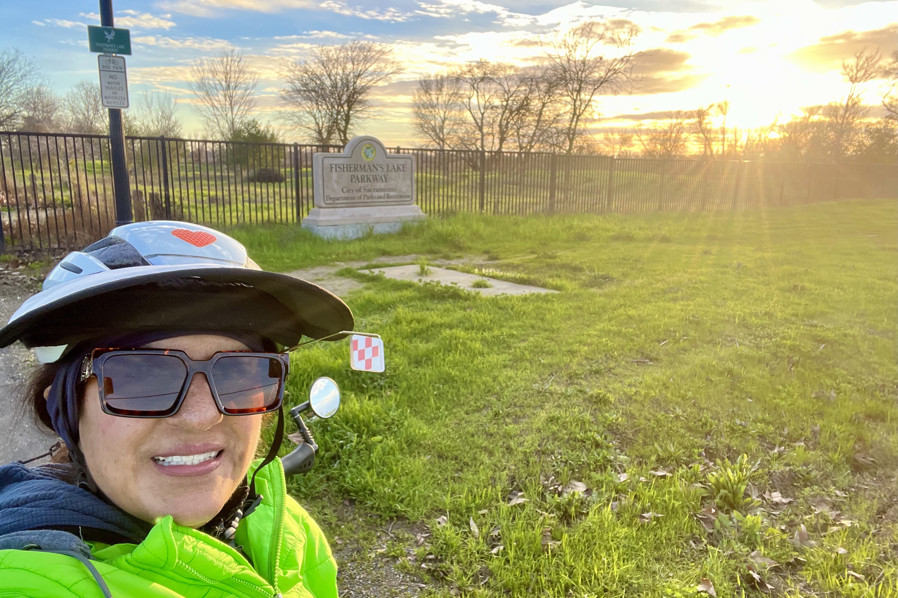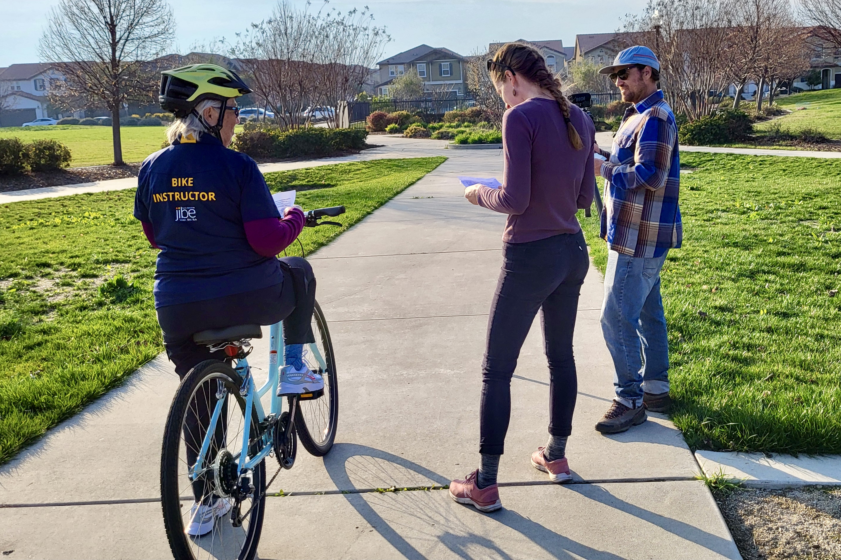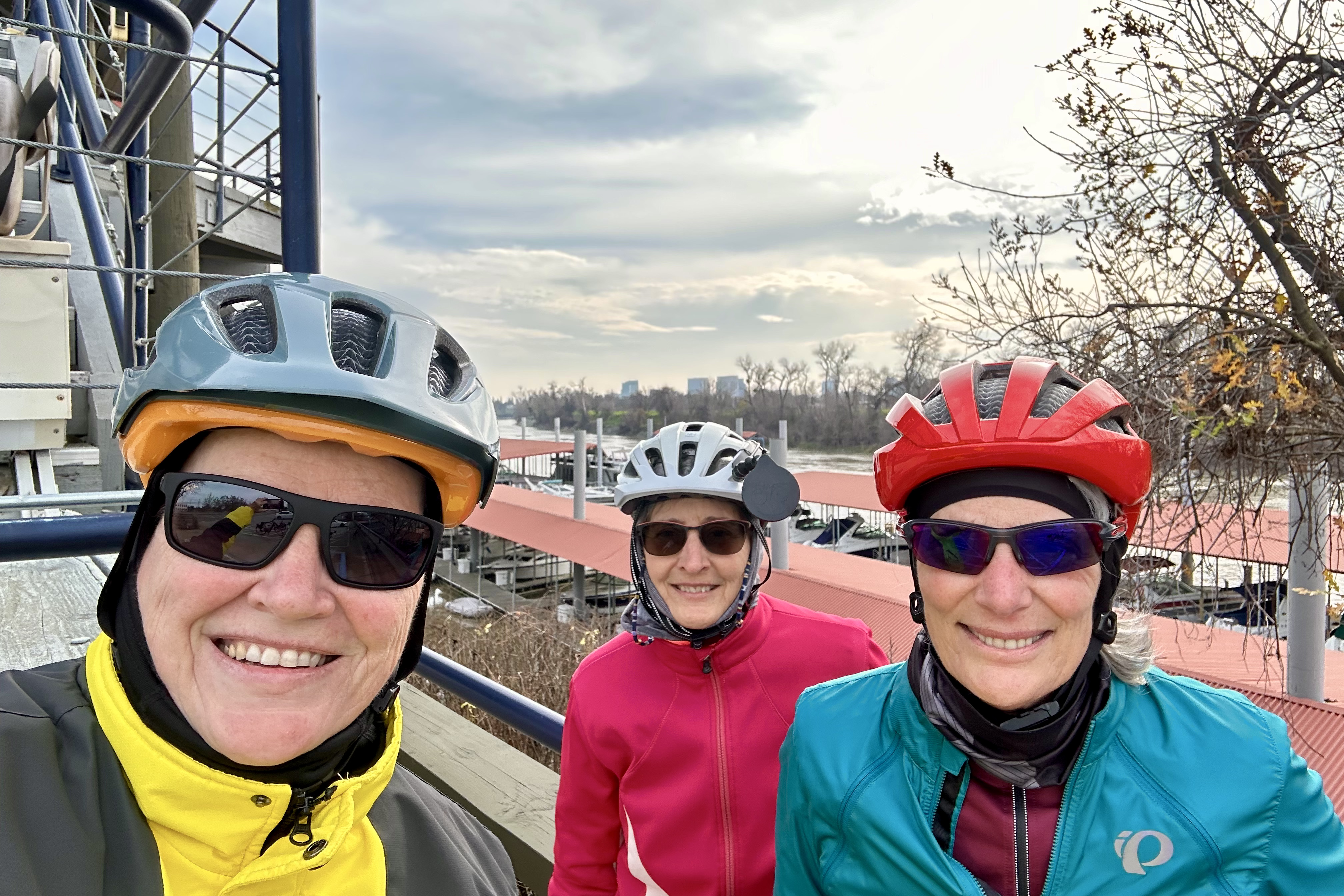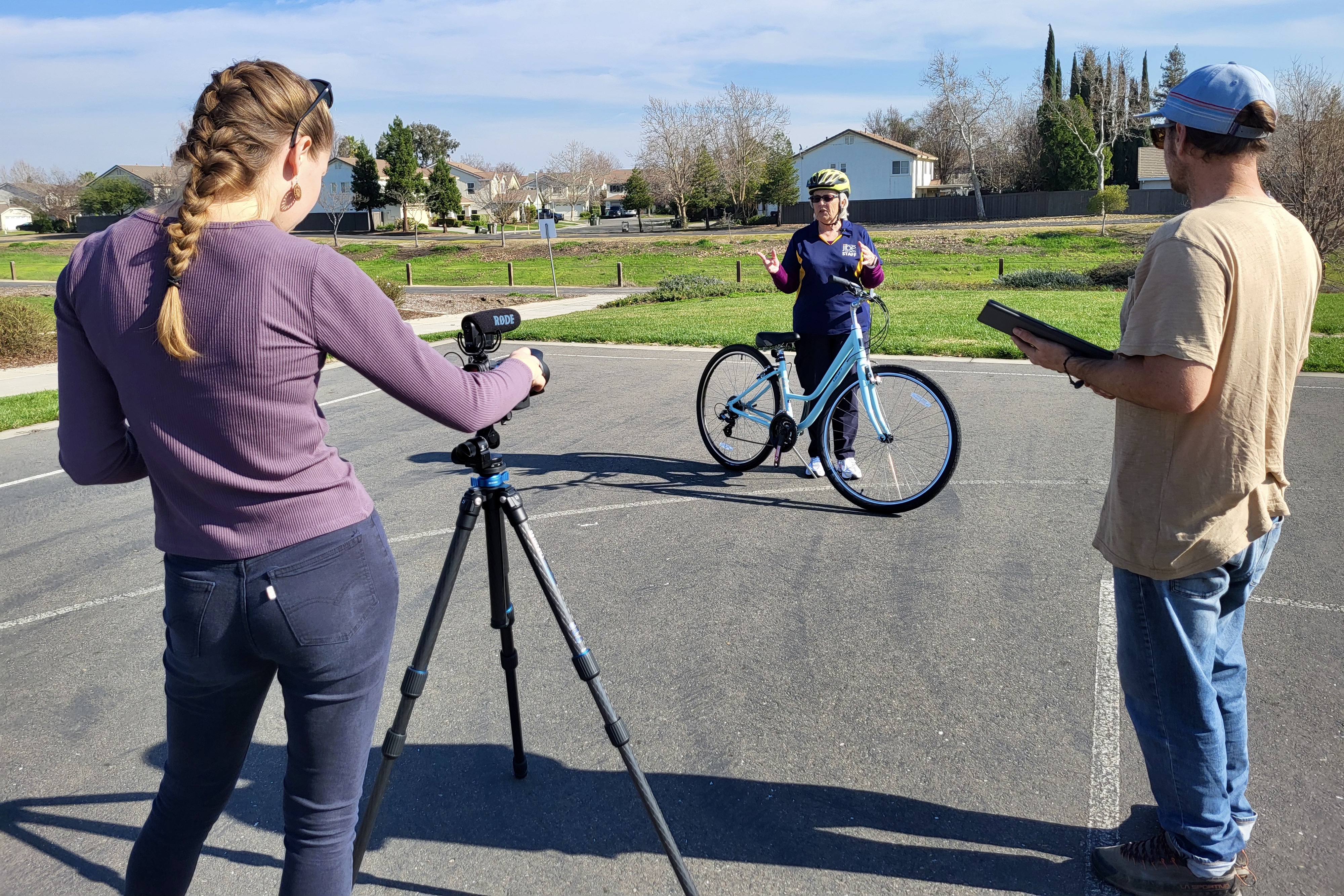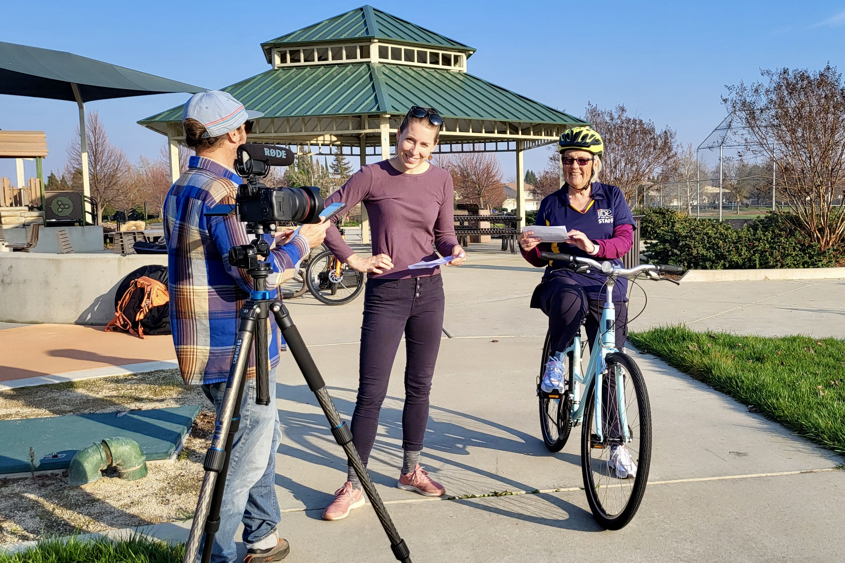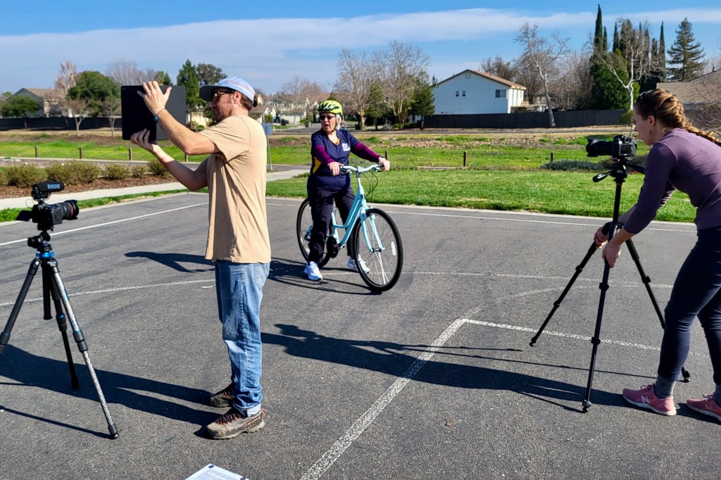 Jibe wanted to create a set of videos which demonstrated all the basic steps to teach an adult how to ride a bike. It’s different with kids - generally, you provide minimal instruction, run alongside for a while, and boom, they’ve got it. Adults are different. First you need to respect their concerns: past experience, health concerns, cultural norms. Then break everything down into logical comfortable steps. Anya, Deanna and I have taught several in-person rounds of Adult Learn to ride and think we’ve got a really good teaching strategy. We have a very high success rate. Anya wrote draft one of the script. We edited together for a couple of weeks. In the end, the words had to sound like they were coming from me. After delays due to my cold, then the weather, this Tuesday had to be the filming day. A series of storms would begin on Wednesday. We met at Wild Rose Park. Ellen/filmmaker and Sean/assistant. Sean is holding the teleprompter – the script was 6 pages long – I did not want to memorize it (was that even possible?).