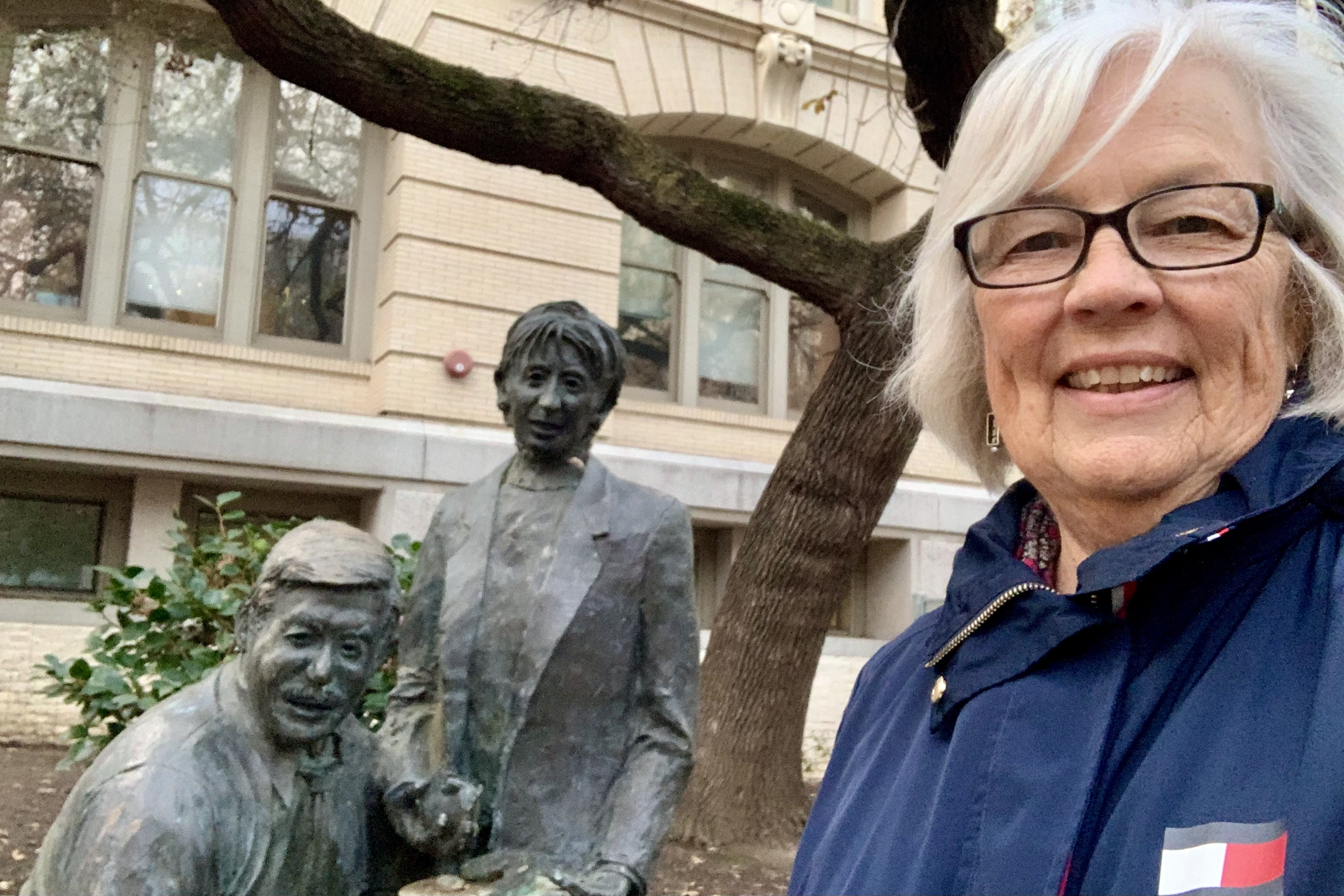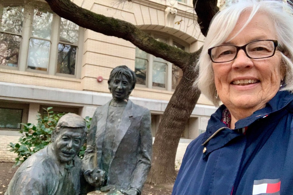 There were unavoidable delays: many planes overhead, pedestrians on paths playing music or talking on phones, 30 minutes for a gardening crew on the other side of the canal to finish mowing and blowing, asking people who want to play basketball “Please be quiet. Thank you so much.” Here, I had to read the teleprompter for one camera then, at a specific point, turn toward Ellen to finish the sentence.
