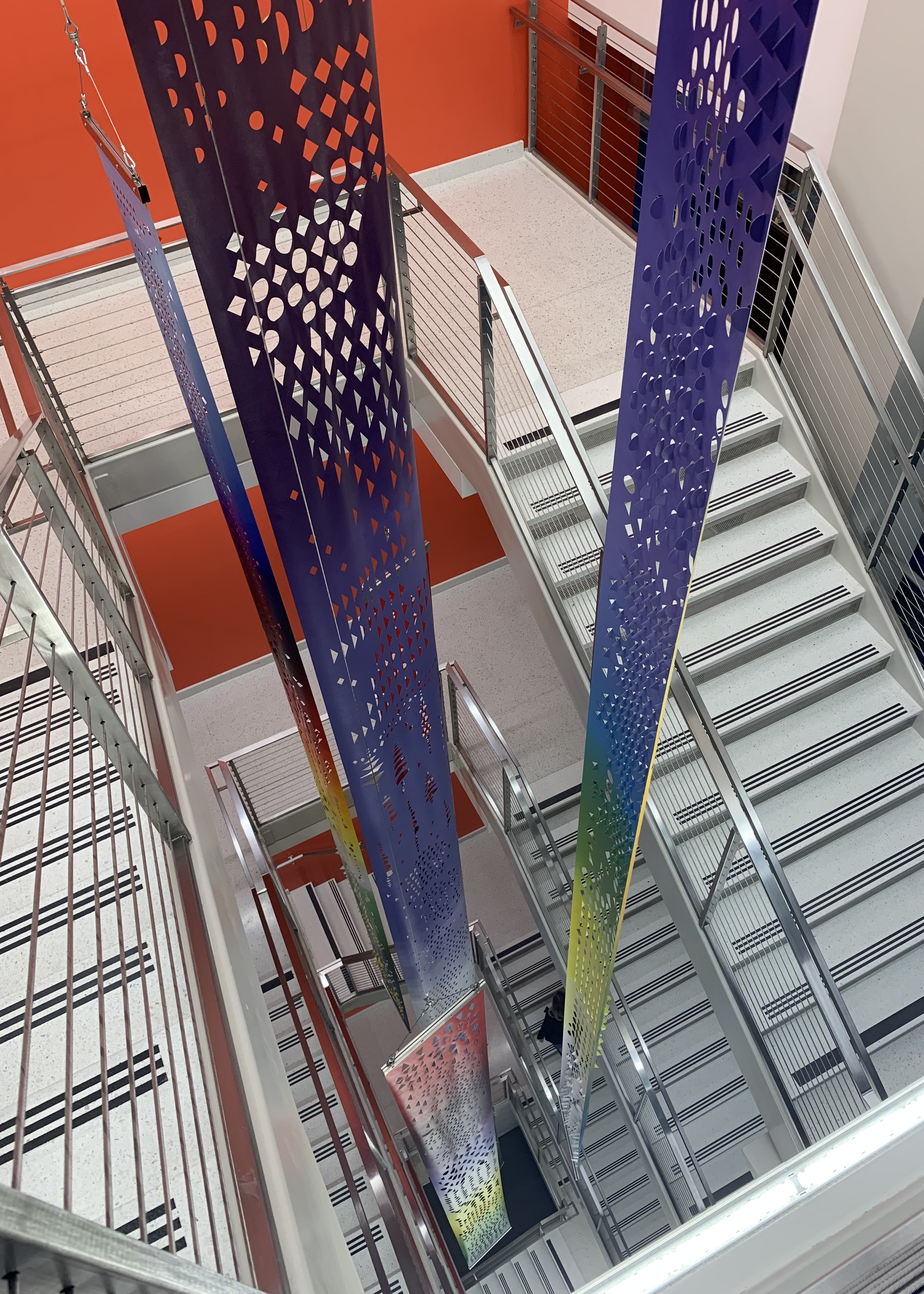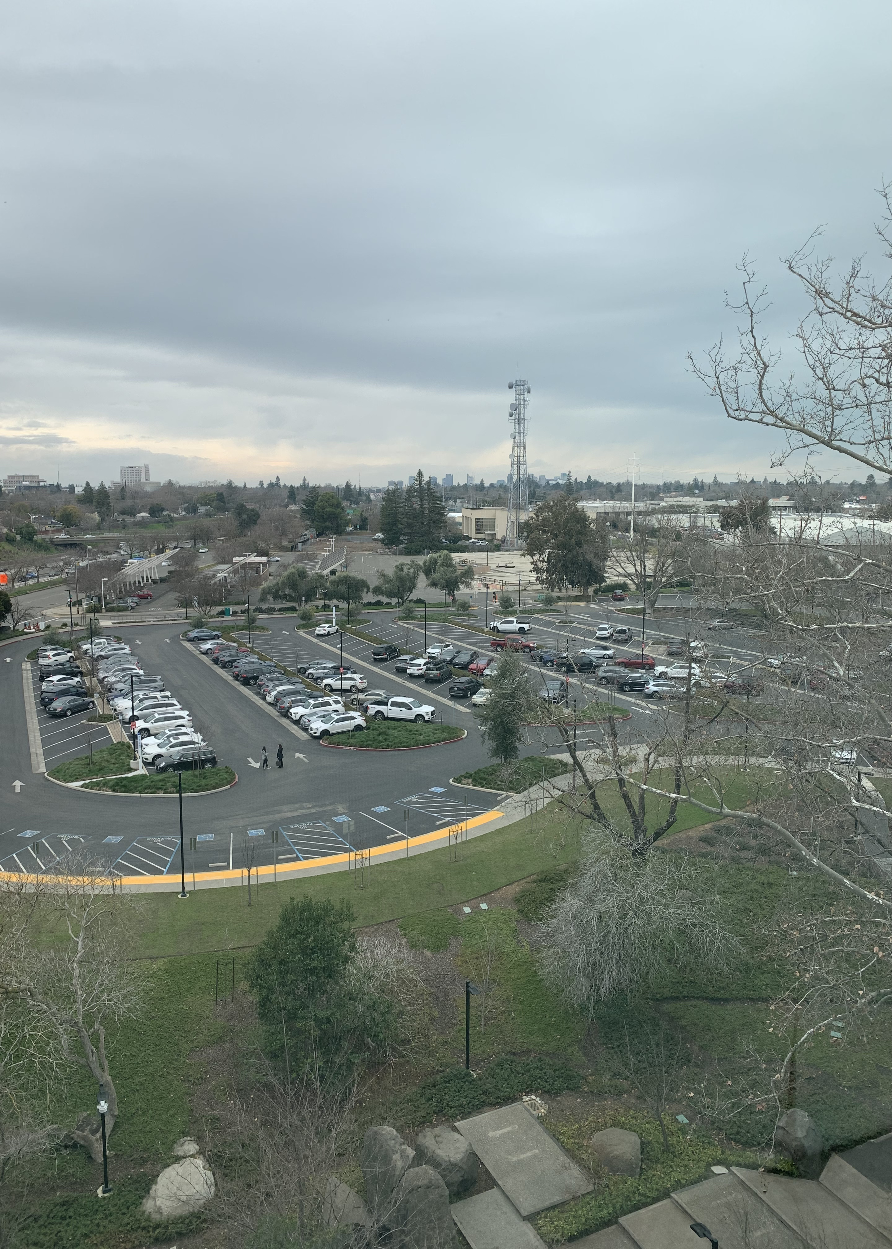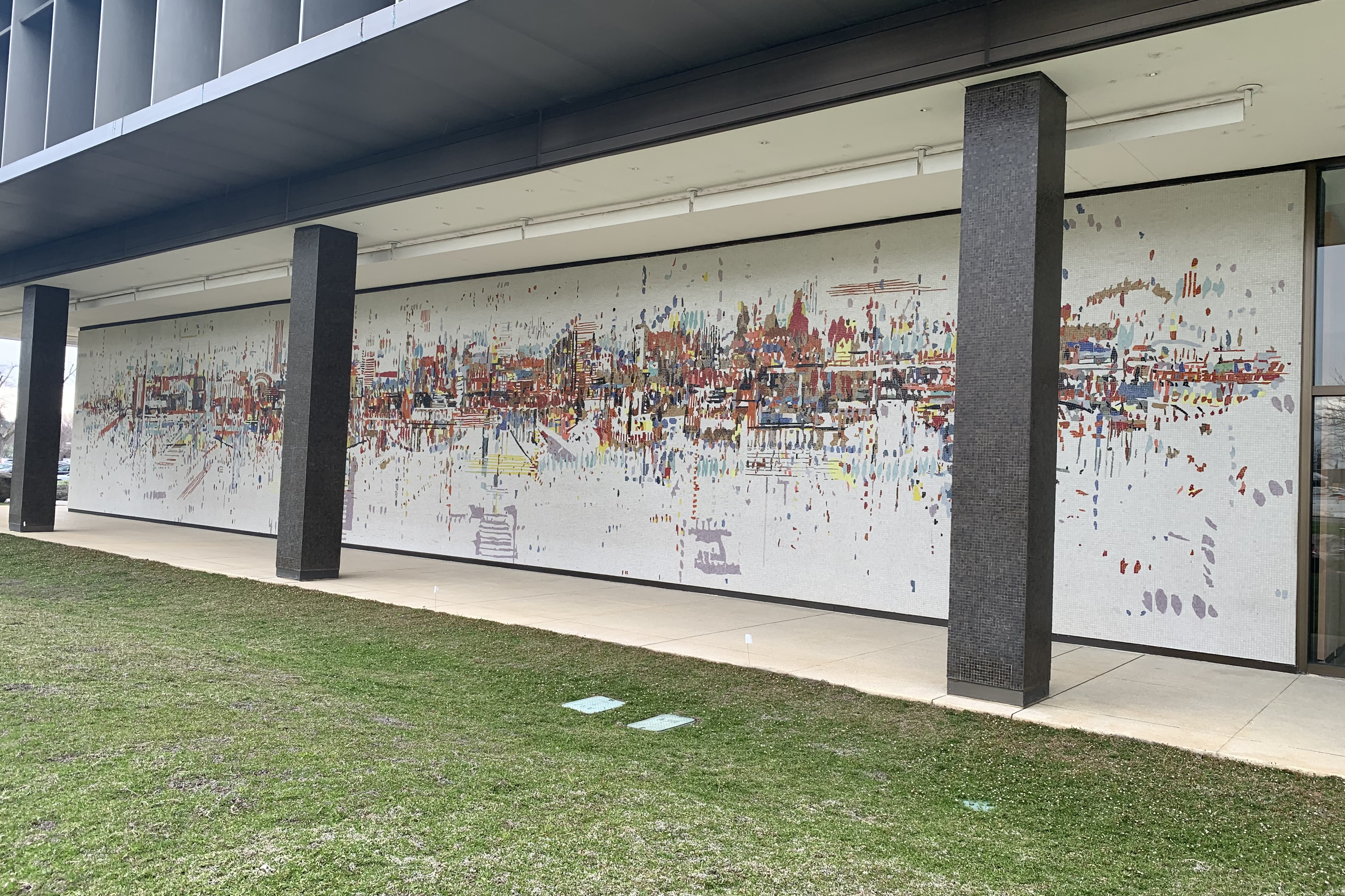 The mural on the outside of the building is an enlargement of “Water City” by Wayne Thiebaud. This art work plus the architecture made SMUD Headquarters an historical landmark.