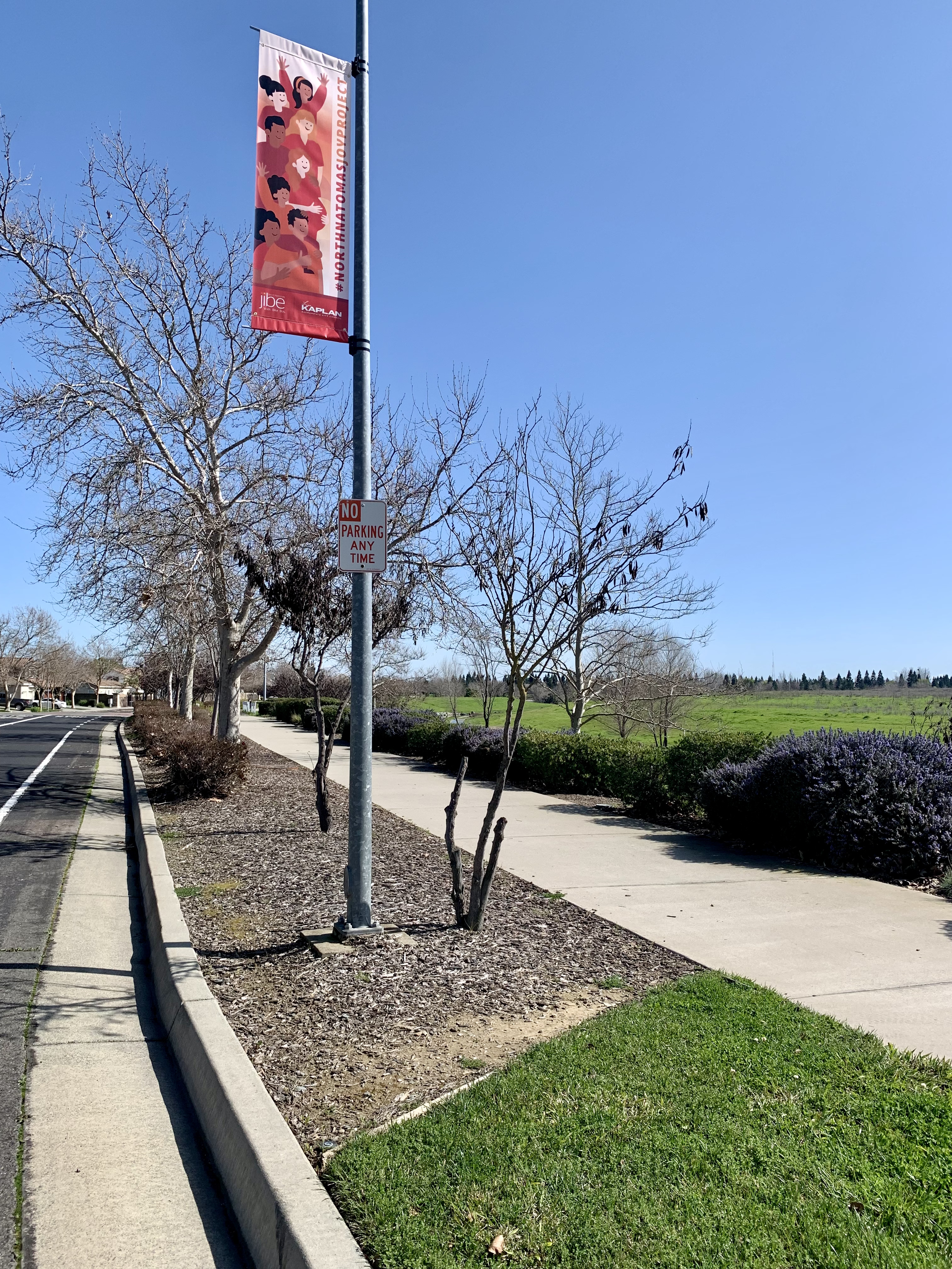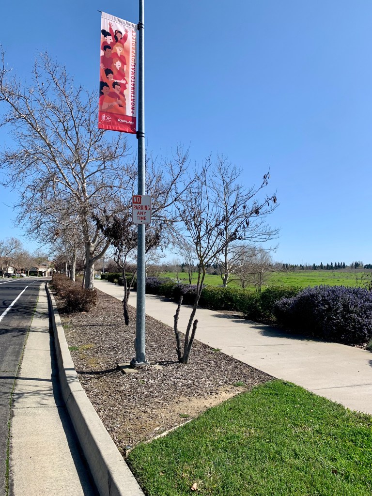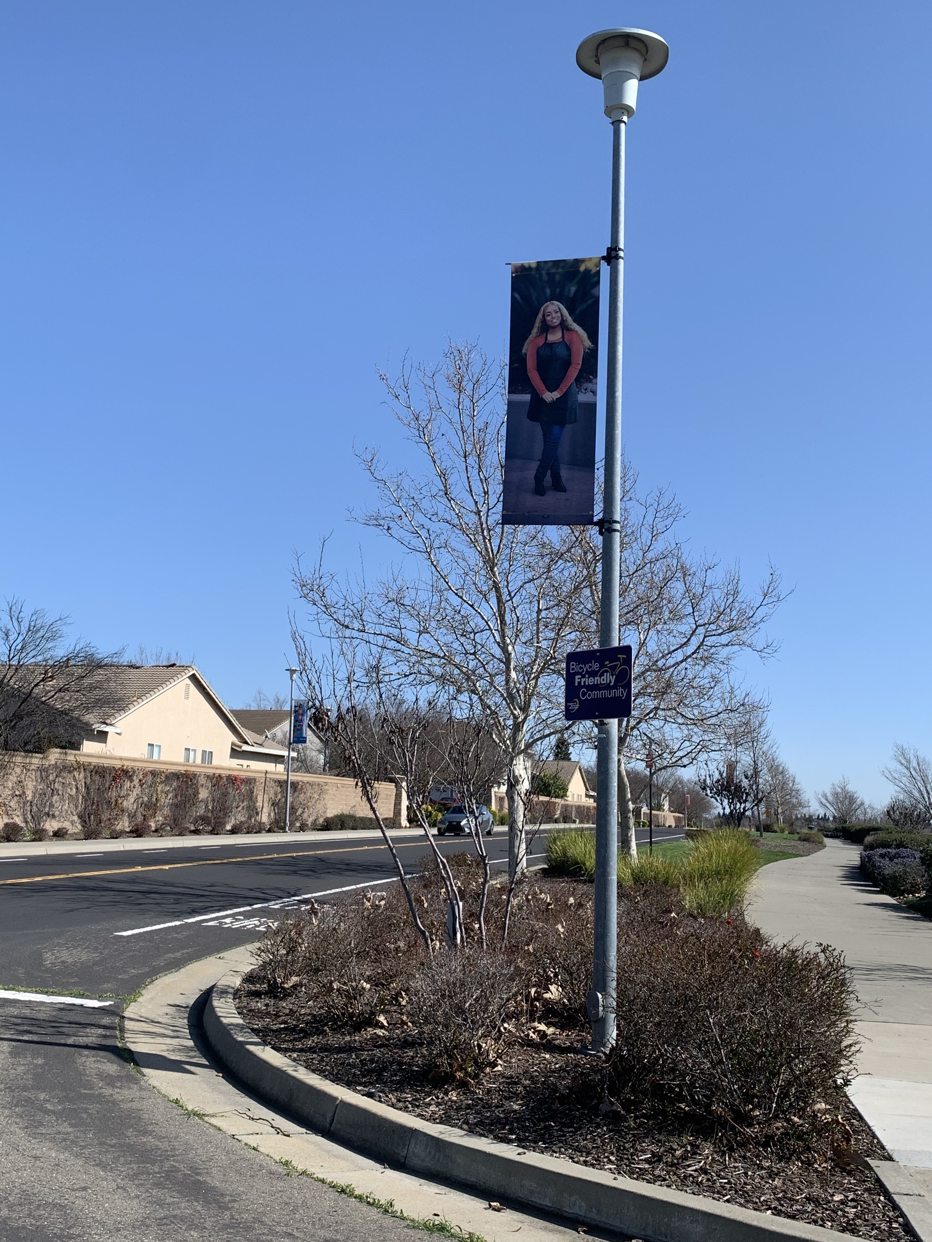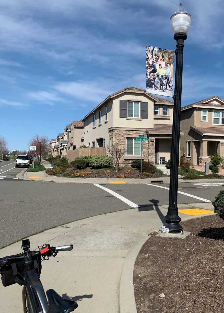 Last year, on November 28, Brenda, BarbaraL and I met a photographer at N Natomas Regional Park for a photo shoot. This was part of the N Natomas Joy project created by Jibe and Councilmember Lisa Kaplan. I received word yesterday that the banners have been installed! I went for a bike ride today to see them. There were 40 submissions. Half of the banners are along N Park Dr, the section that borders the N Natomas Regional Park. Most of the banners are on the park side.