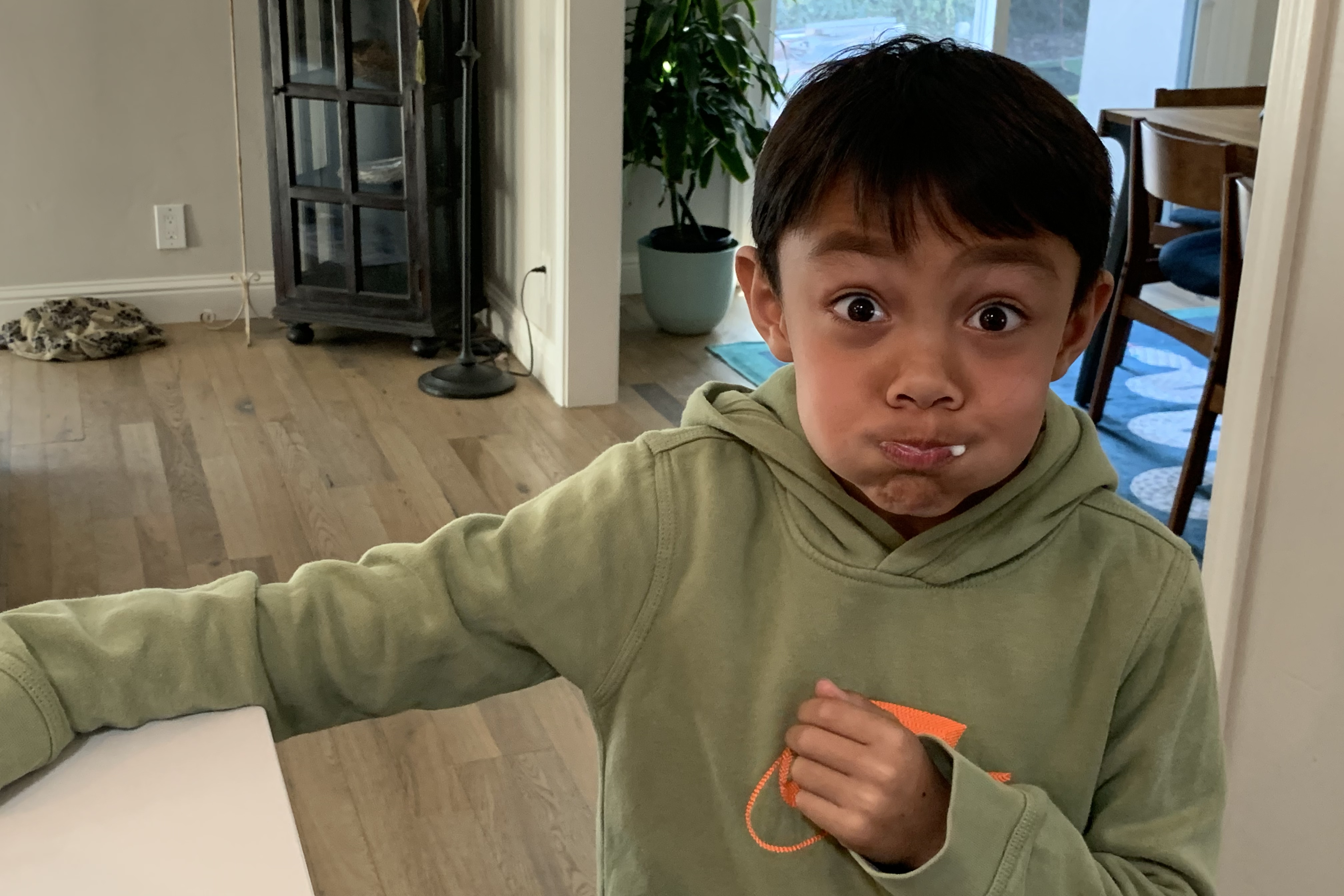 Although encouraged to eat his snack in the car, Carson chose a different solution:
