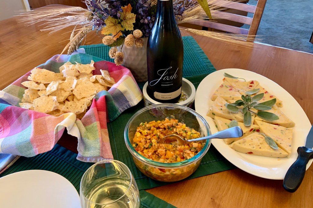 On Friday. Our unplanned common ingredients this month were corn and bell peppers. Creamy polenta triangles and cilantro lime chicken to put in little tortilla cups. And Josh.