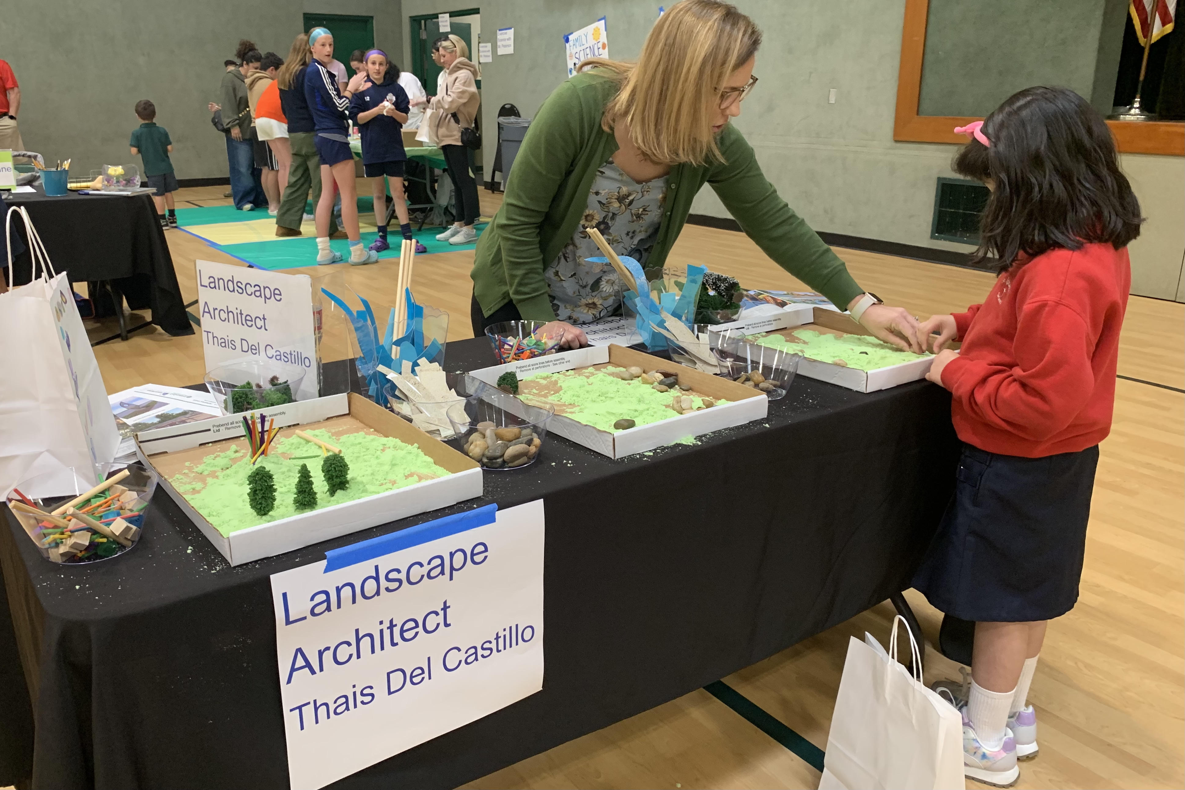 Using kinetic green sand, rocks, water (blue strips), walkways (gray strips), sticks and blocks, small trees and bushes, students were invited to design a park.