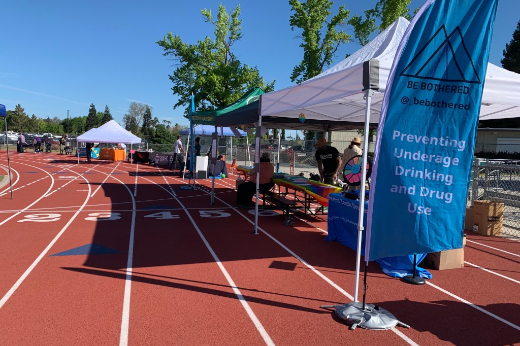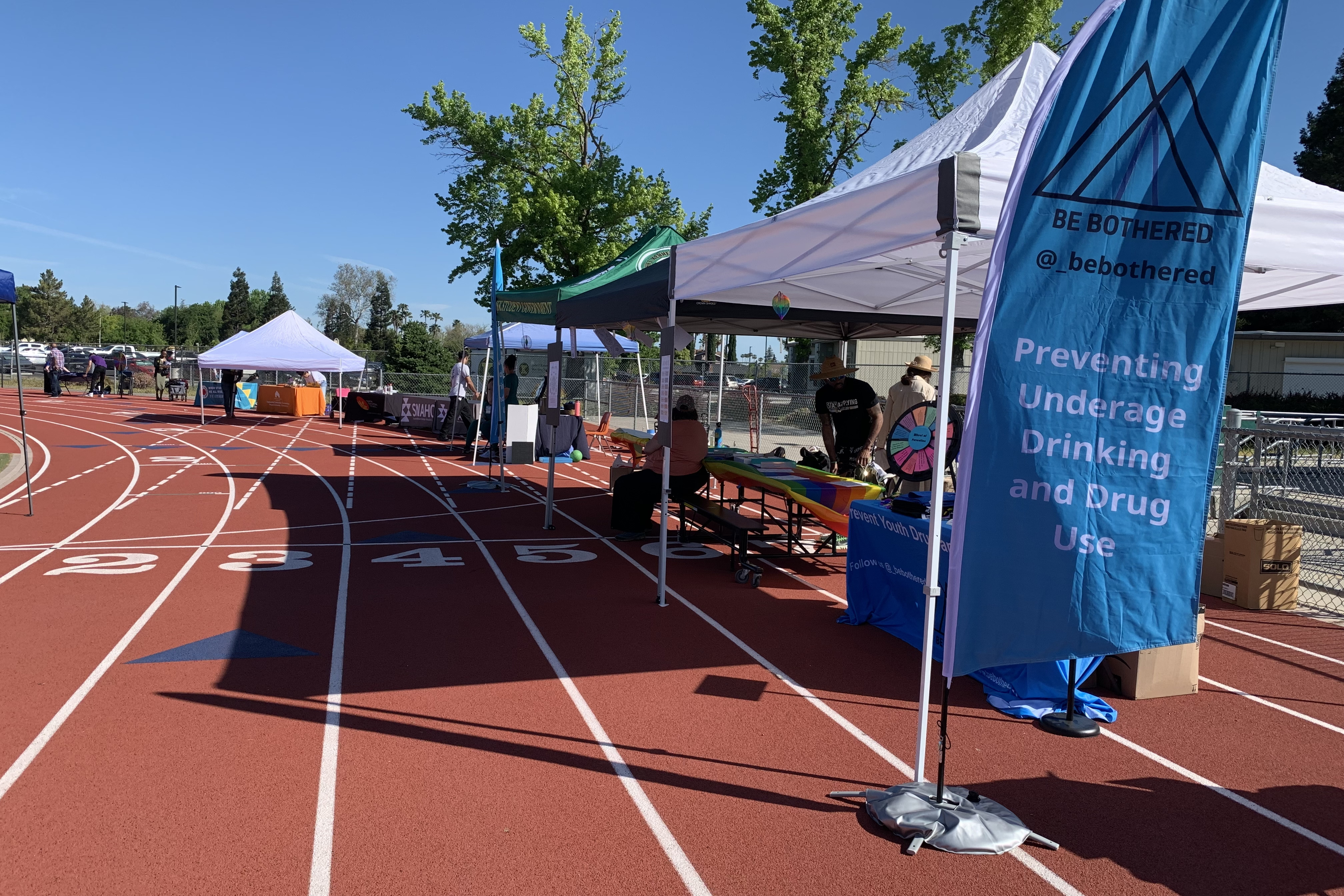 John F Kennedy High School Wellness Fair on Monday morning. Many tents set up on the track.