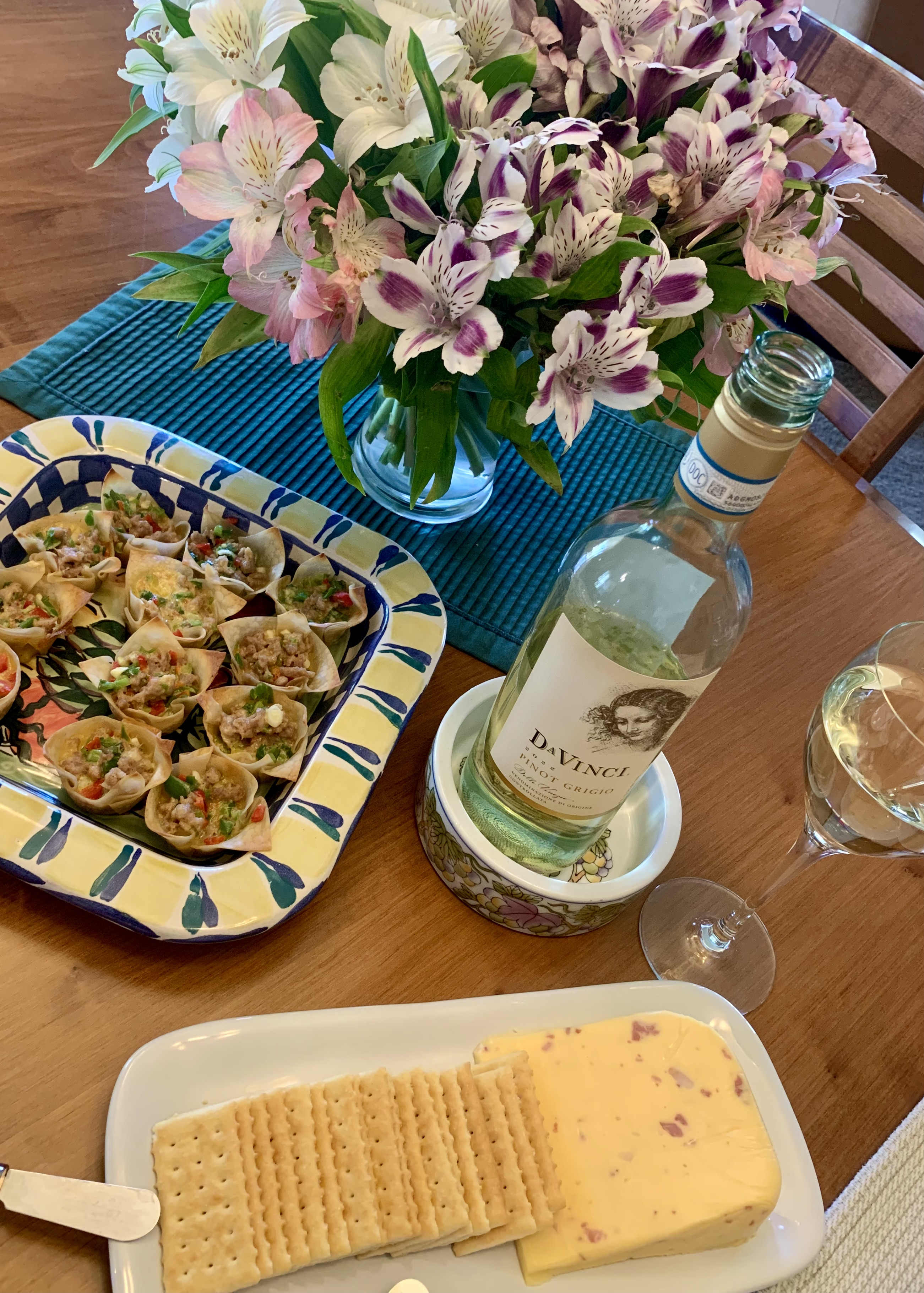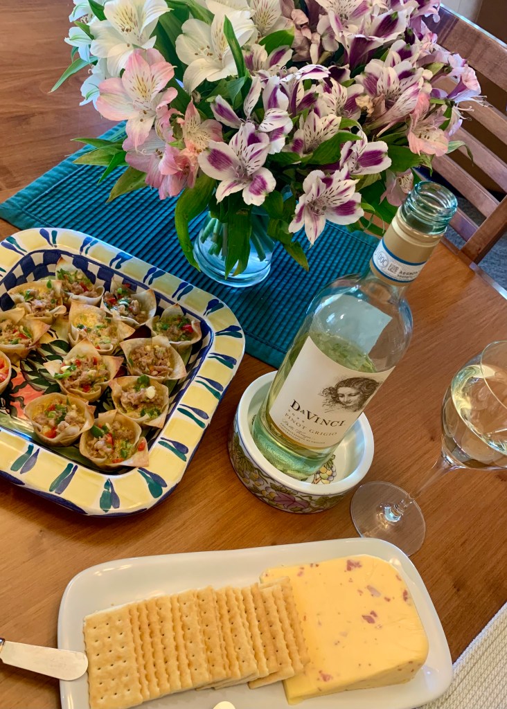 On Tuesday. We did something a bit different this month. I brought two savories – Sausage wonton stars and (super easy) bacon gouda cheese and crackers.