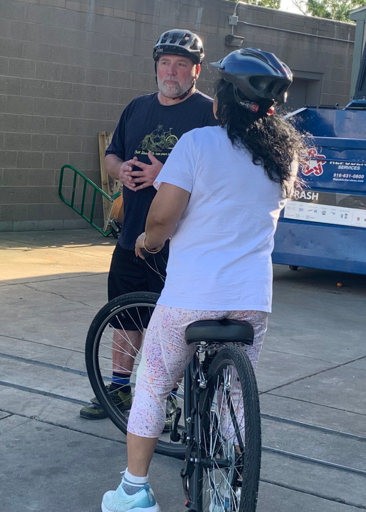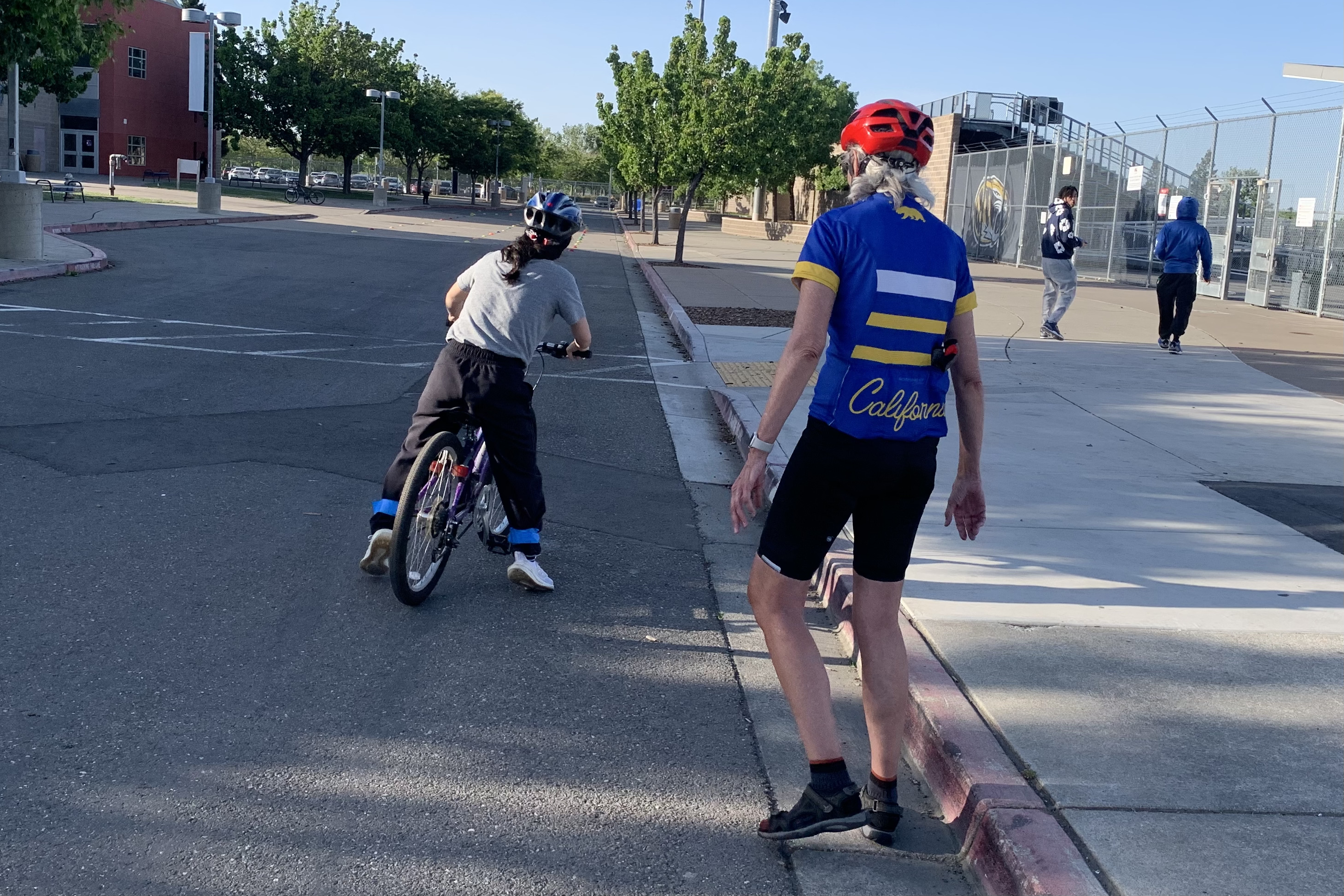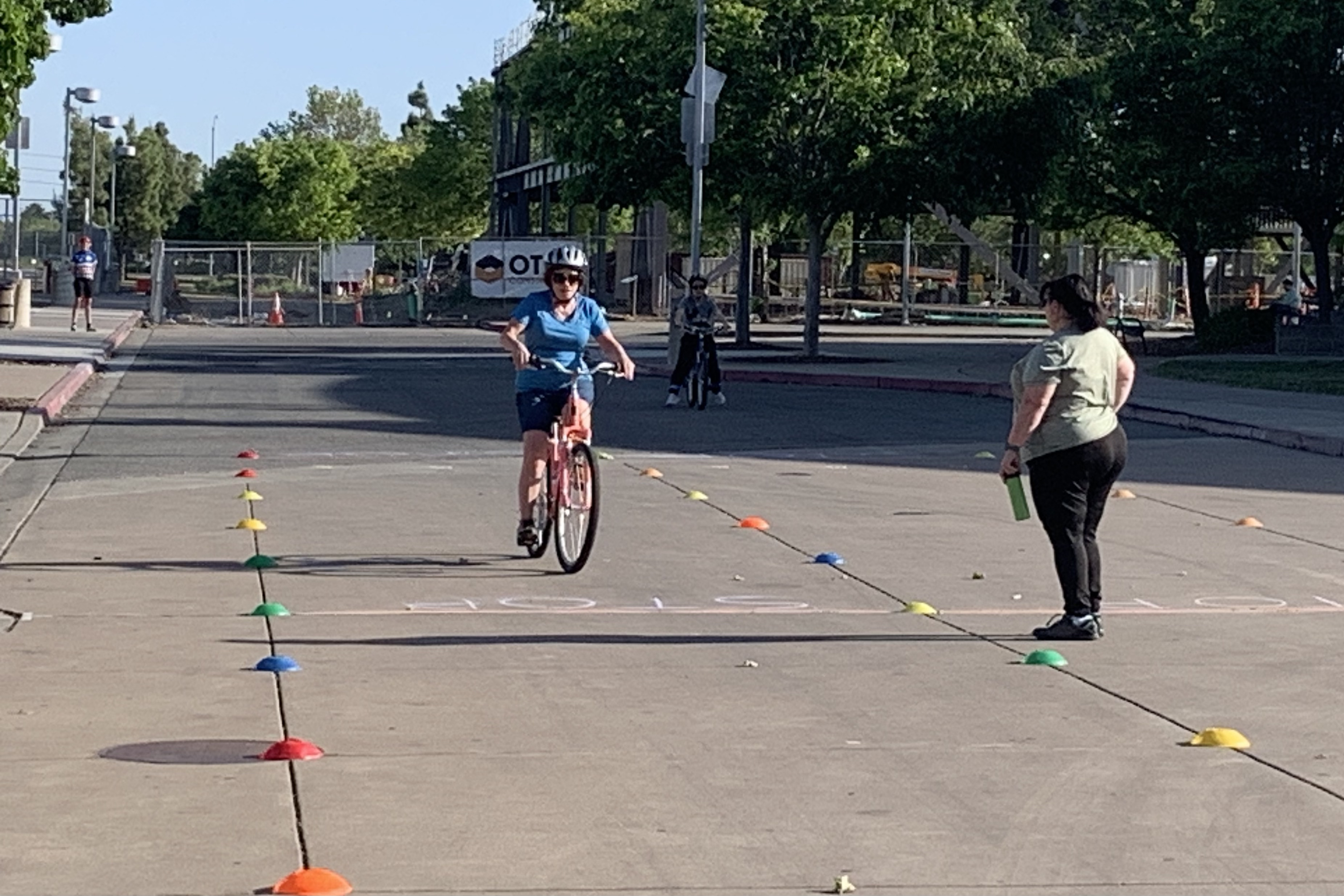 This was a class for two levels of beginning riders. Lennore with an advanced beginner on a bike handling skills course.
