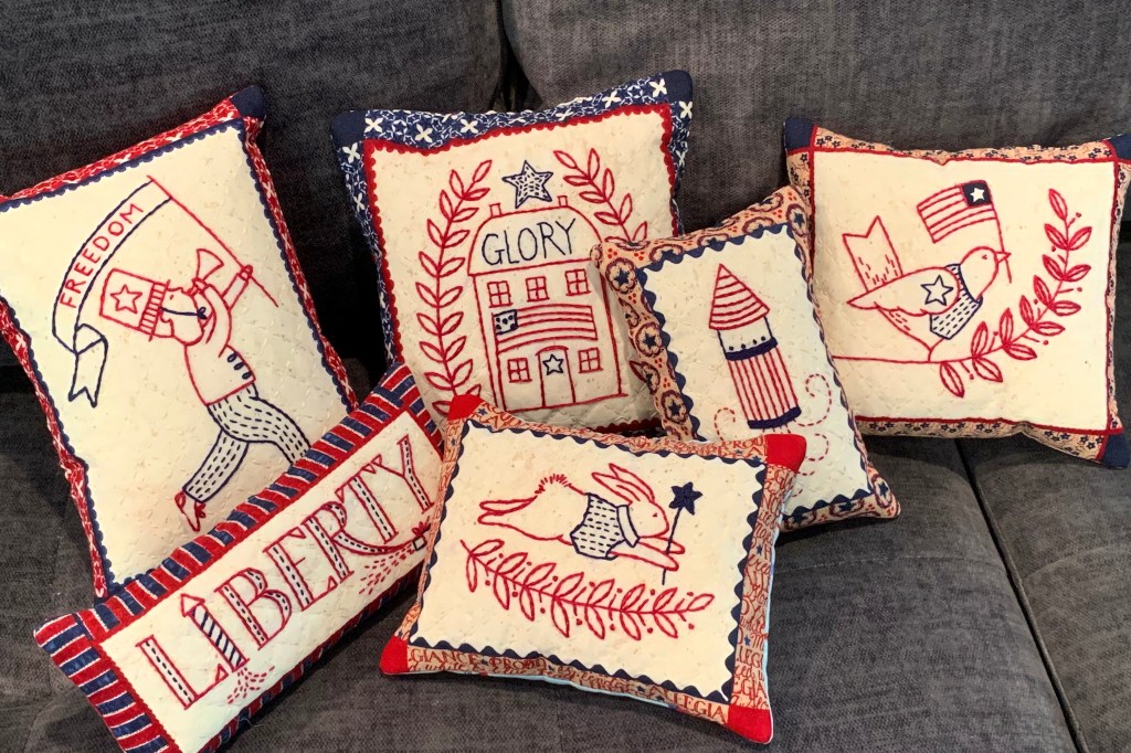 means Works in Progress. I have many. I decided to finish one of them. Six small embroidered and quilted pillows.