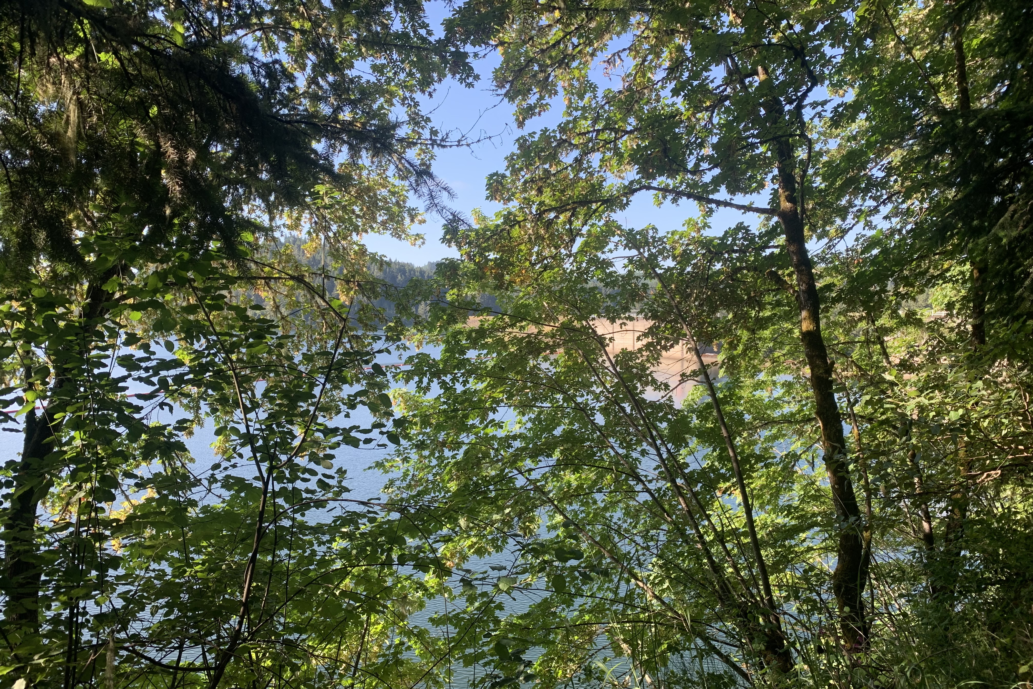 At 7 miles, I came to the first glimpse of Dorena Dam, barely visible through the trees.