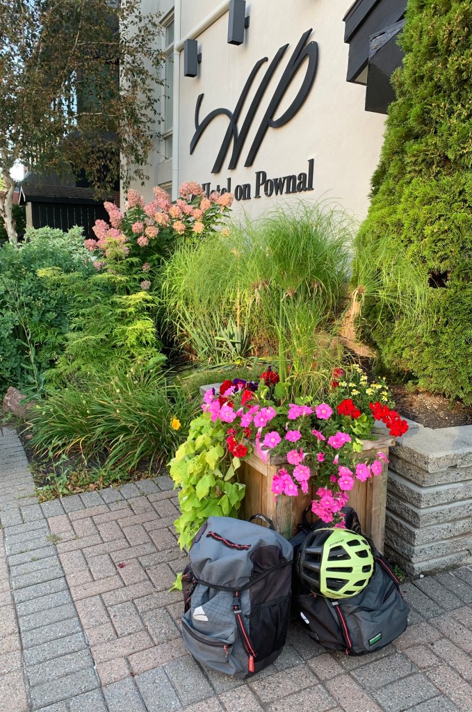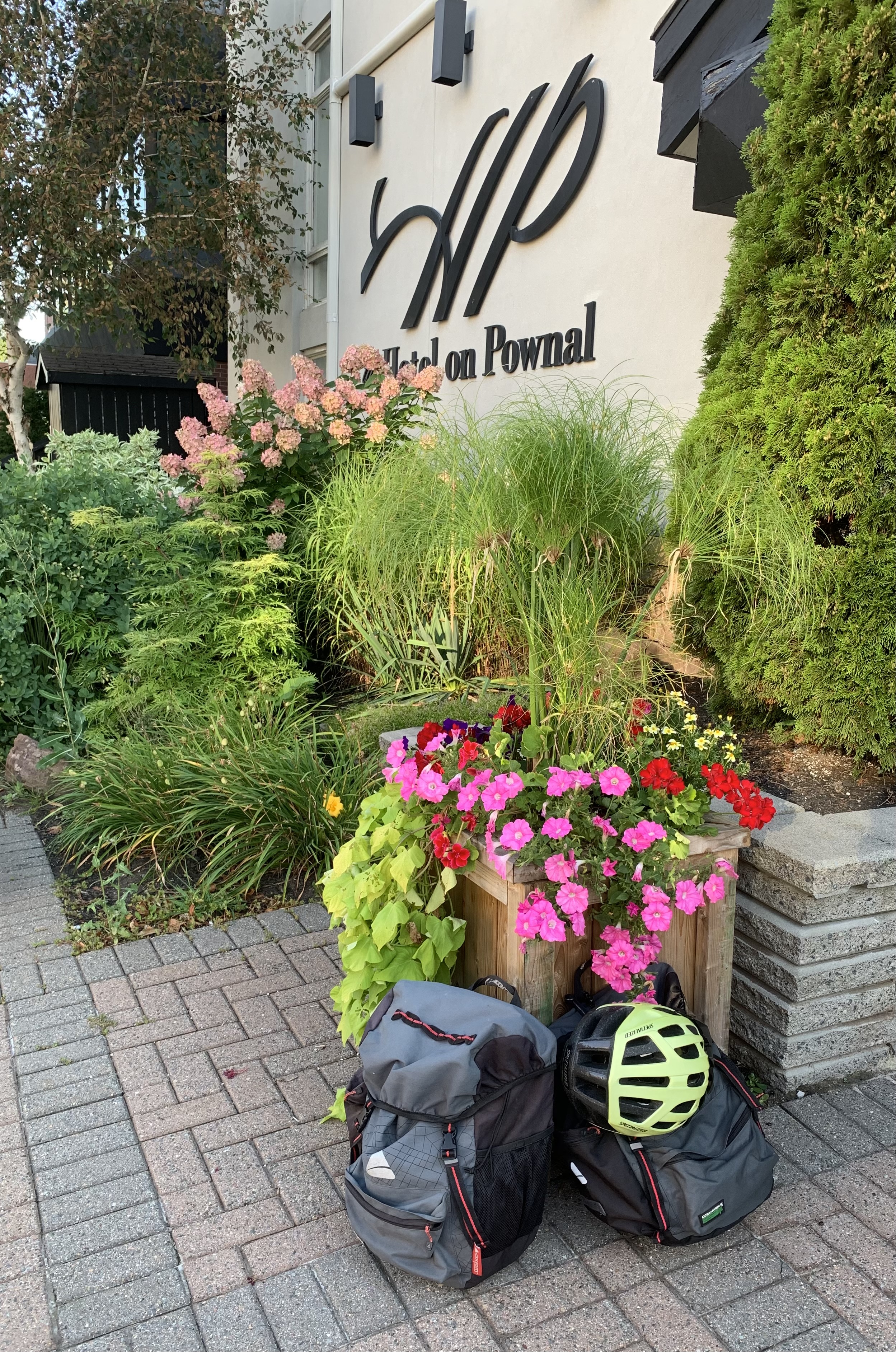Waiting for my ride in front of the hotel. Saddlebags packed.