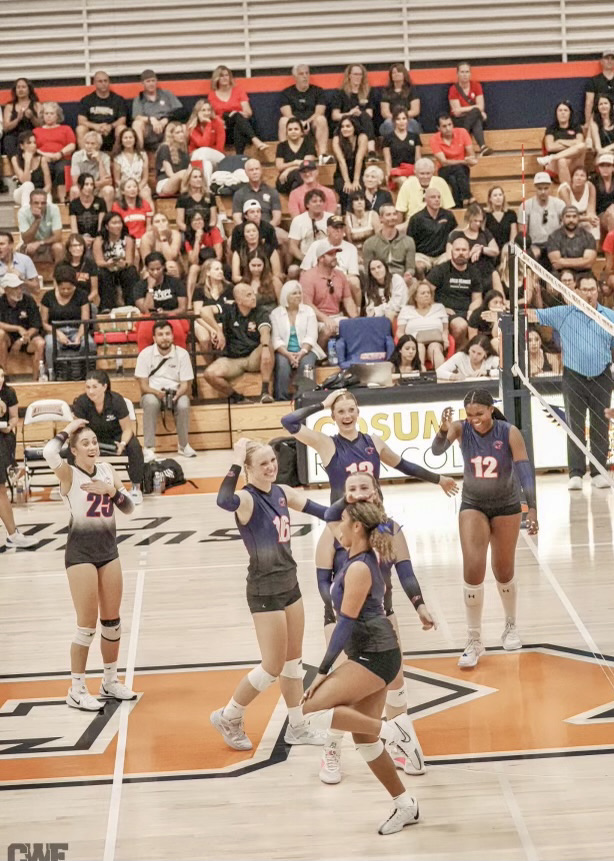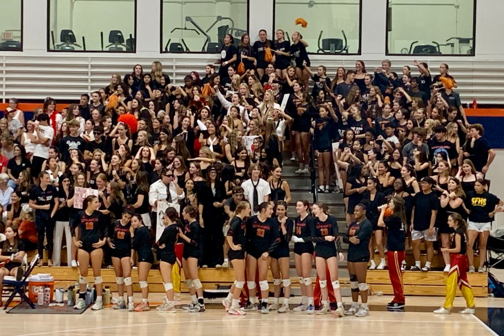 Christian Brothers v St Francis at Cosumnes River College: girls’ volleyball. Crowd support and enthusiasm is about 1000% improved from when I was in high school. There were no girls’ sports in 1966. This is St Francis’ student cheering section, about 1/4 of the seating on their side, always standing, loud in-unison chants, funny exchanges with CB’s student cheering section at the other end.