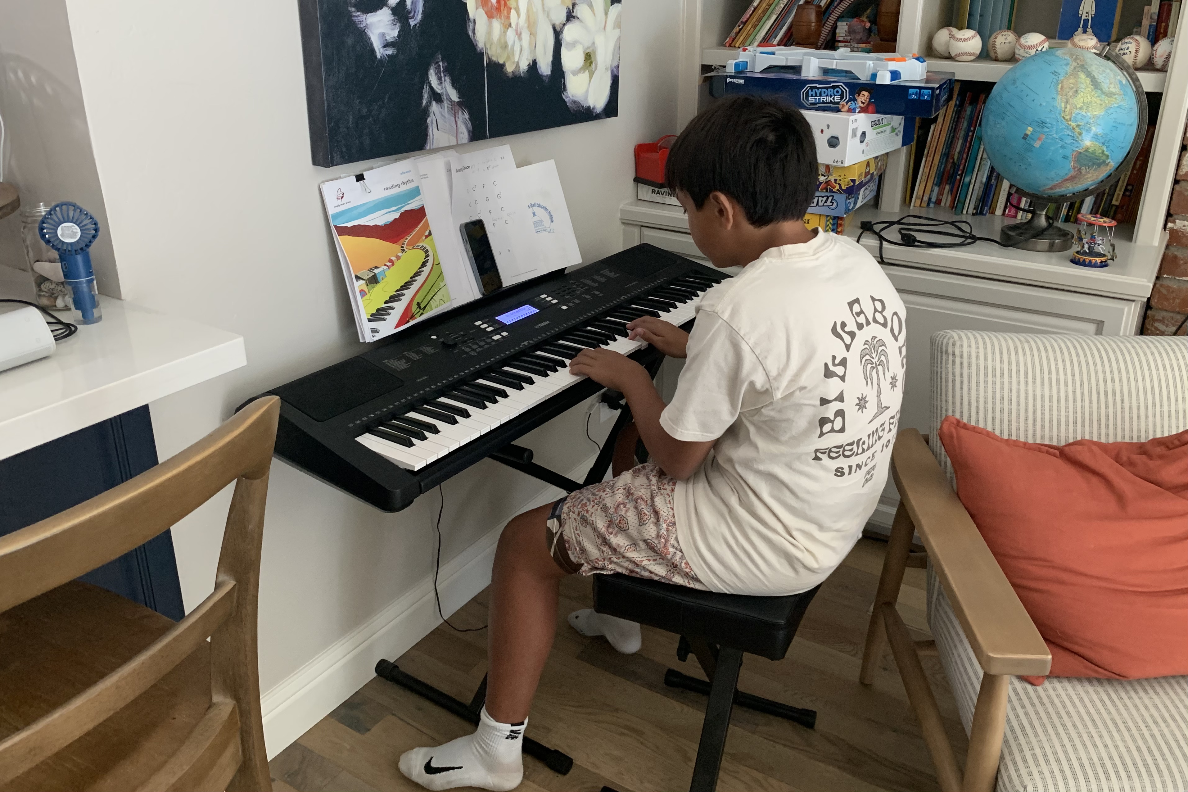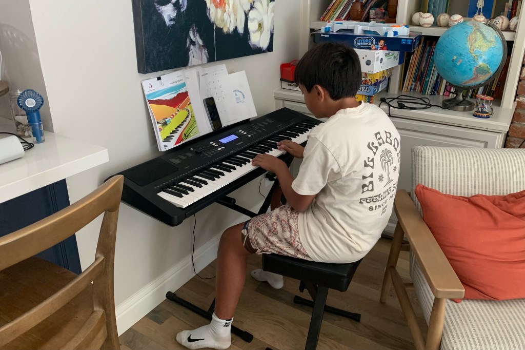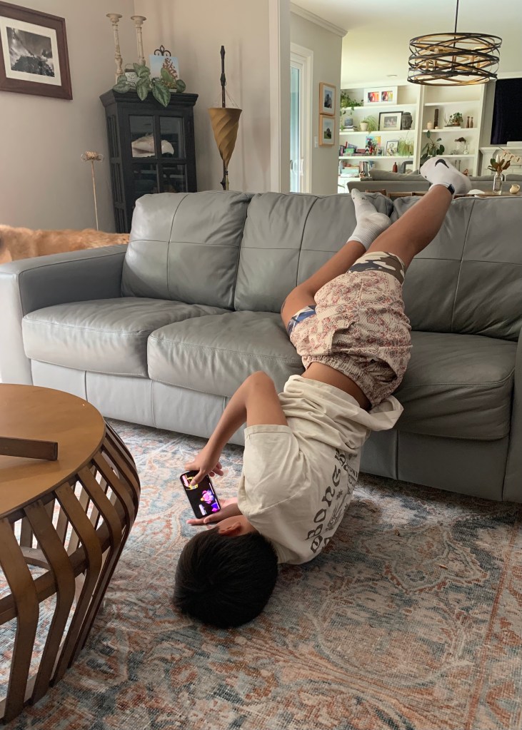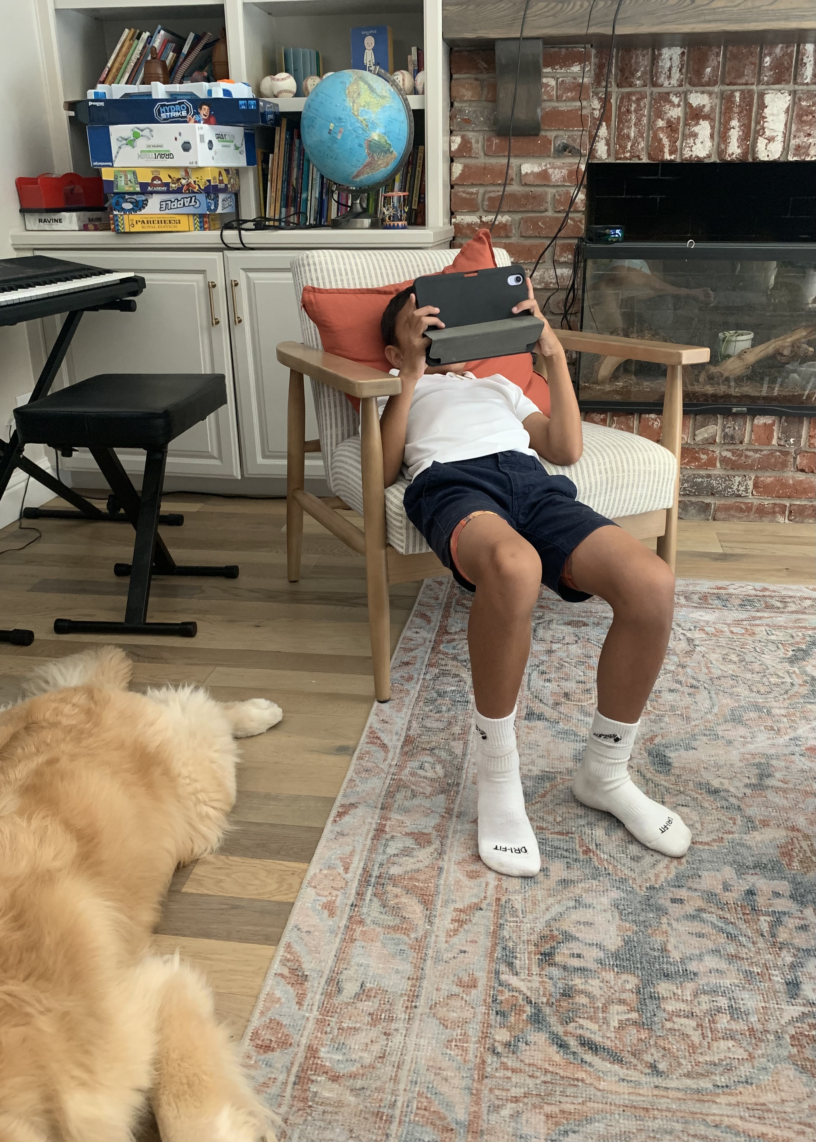 I marvel at the positions Carson and Avery find comfortable for extended game playing. Carson is actually playing online with two friends, Hudson and Zane.