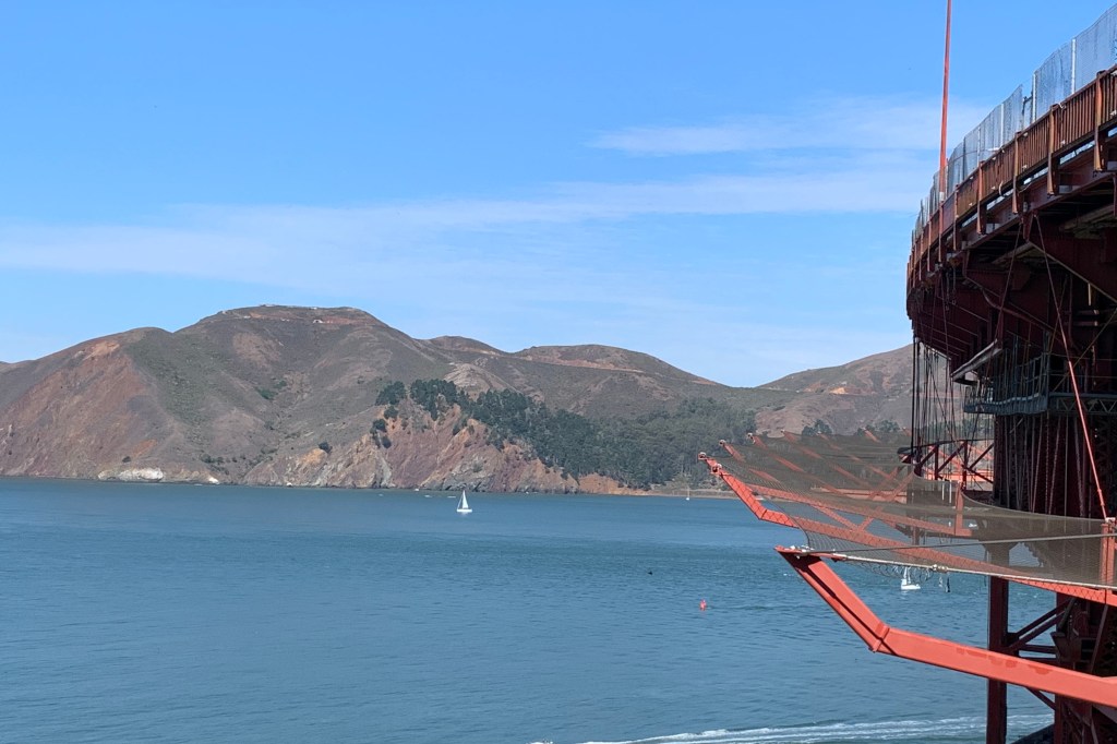 The Golden Gate Bridge from a viewpoint on the ocean side. Note the suicide nets.