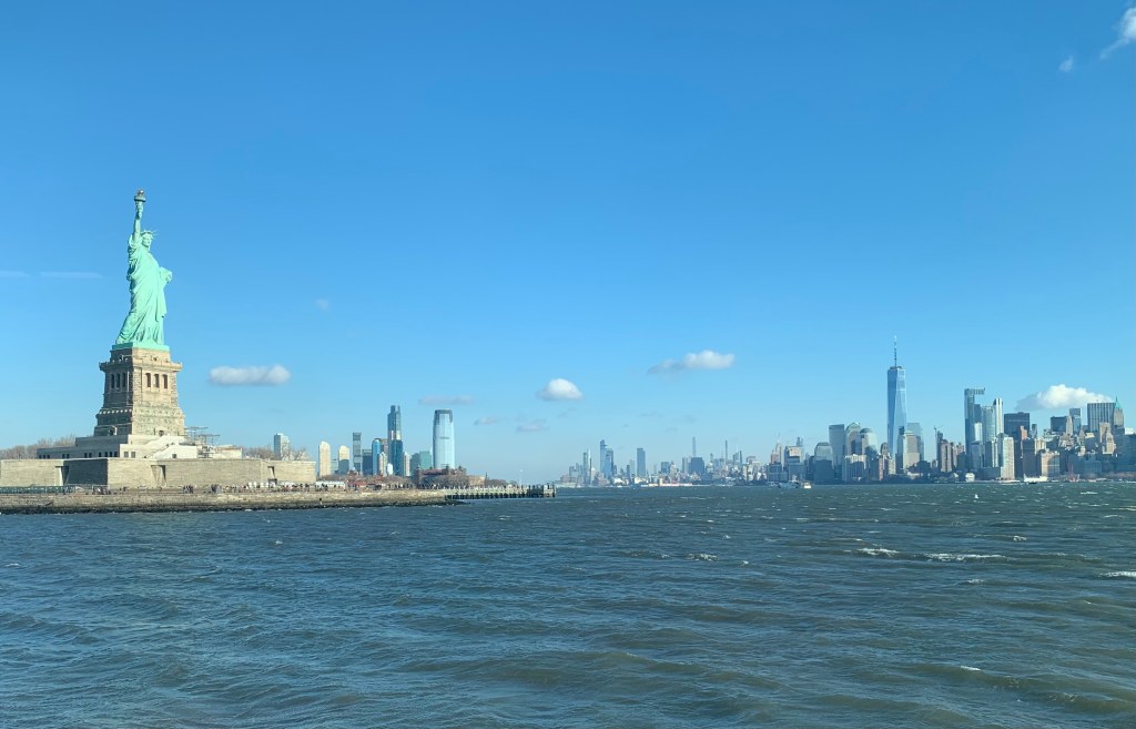 Looking back at Manhattan, New Jersey buildings are just behind Lady Liberty.