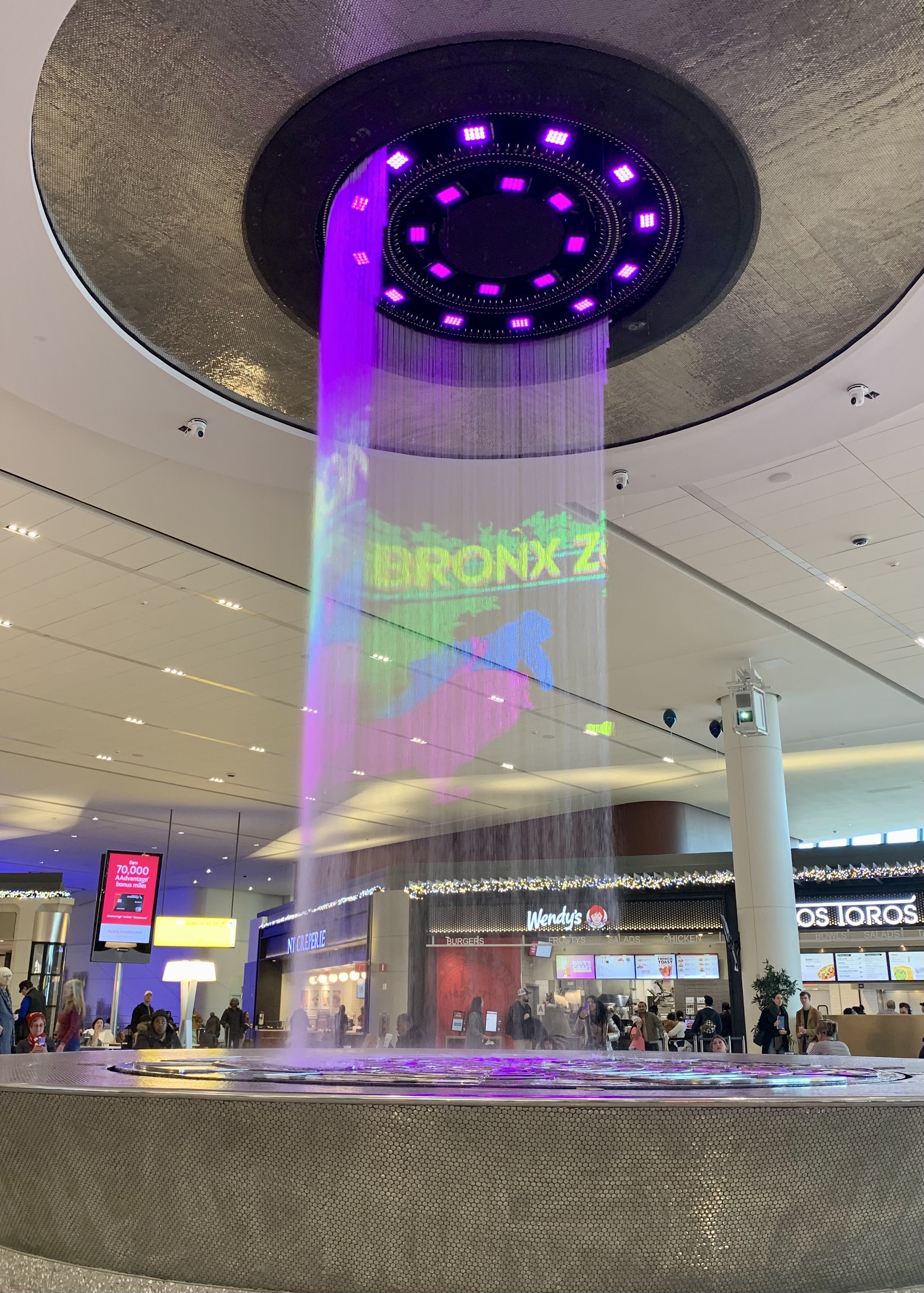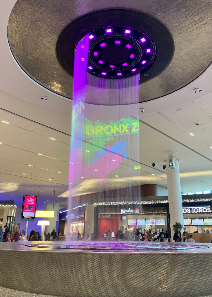 Saturday morning, we left the hotel with plenty of time for breakfast at La Guardia before our flight. We sat near an entertaining waterfall light show.