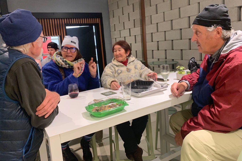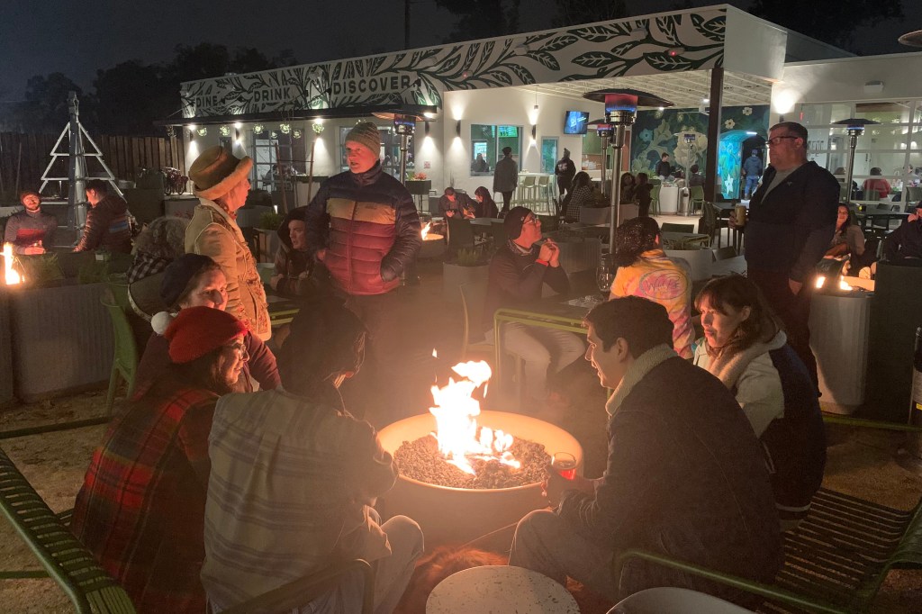 Outdoor beer garden with fire pits and heat lamps. You use your phone to order from a (QR code) menu at your table, various restaurants are available, you can pick and choose items from any of them. Fairly quickly, your food is delivered to you by a server, they know where you are sitting.