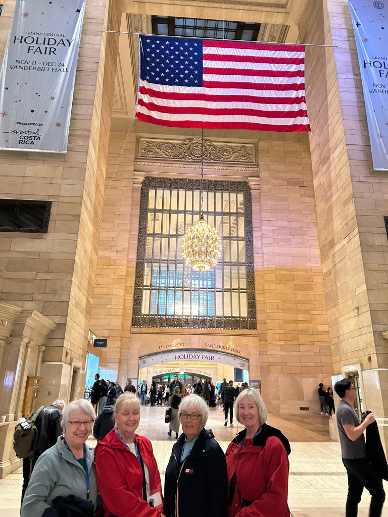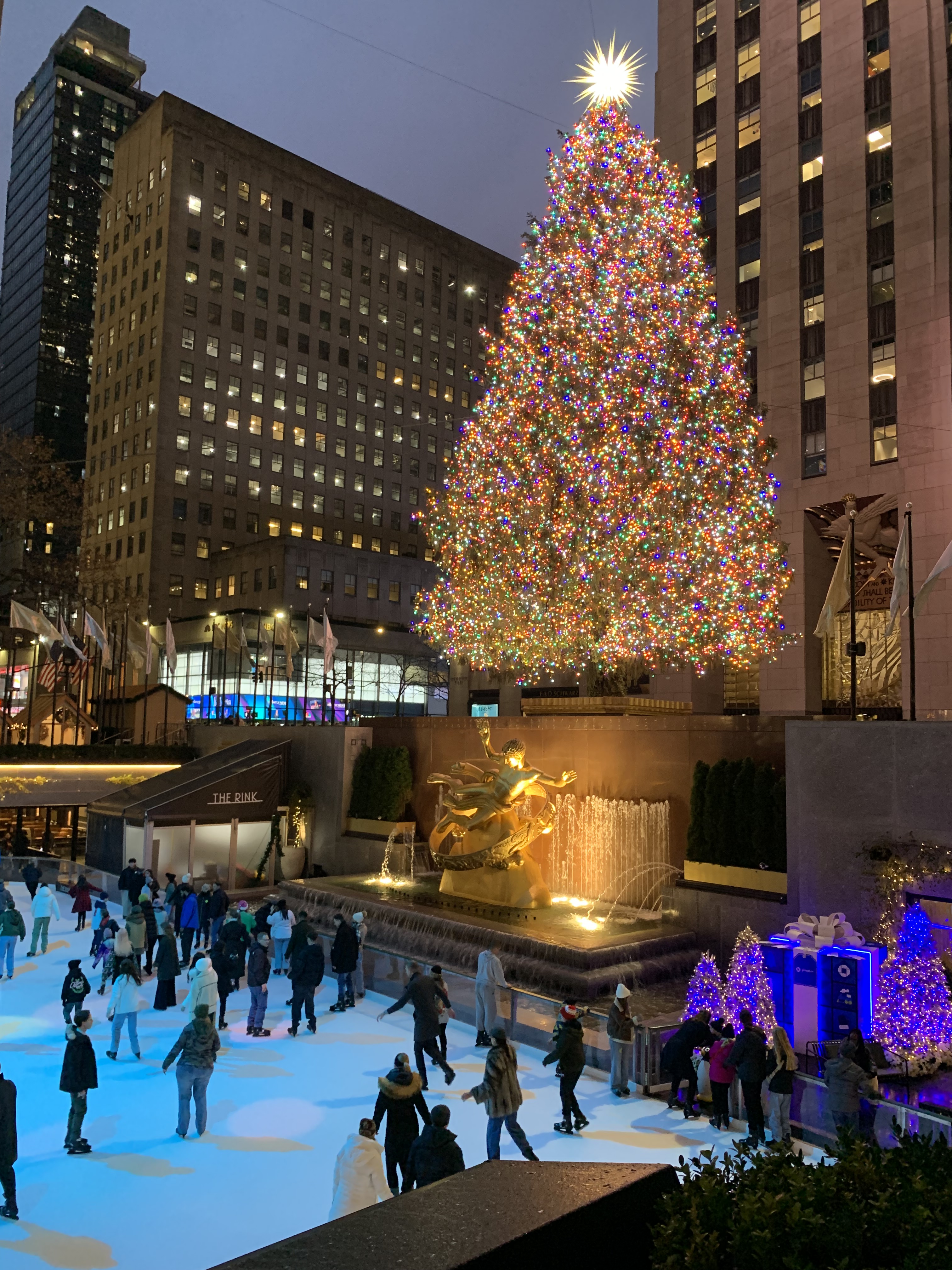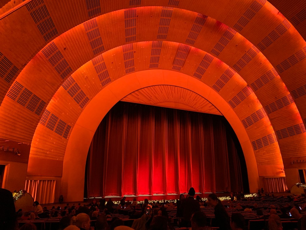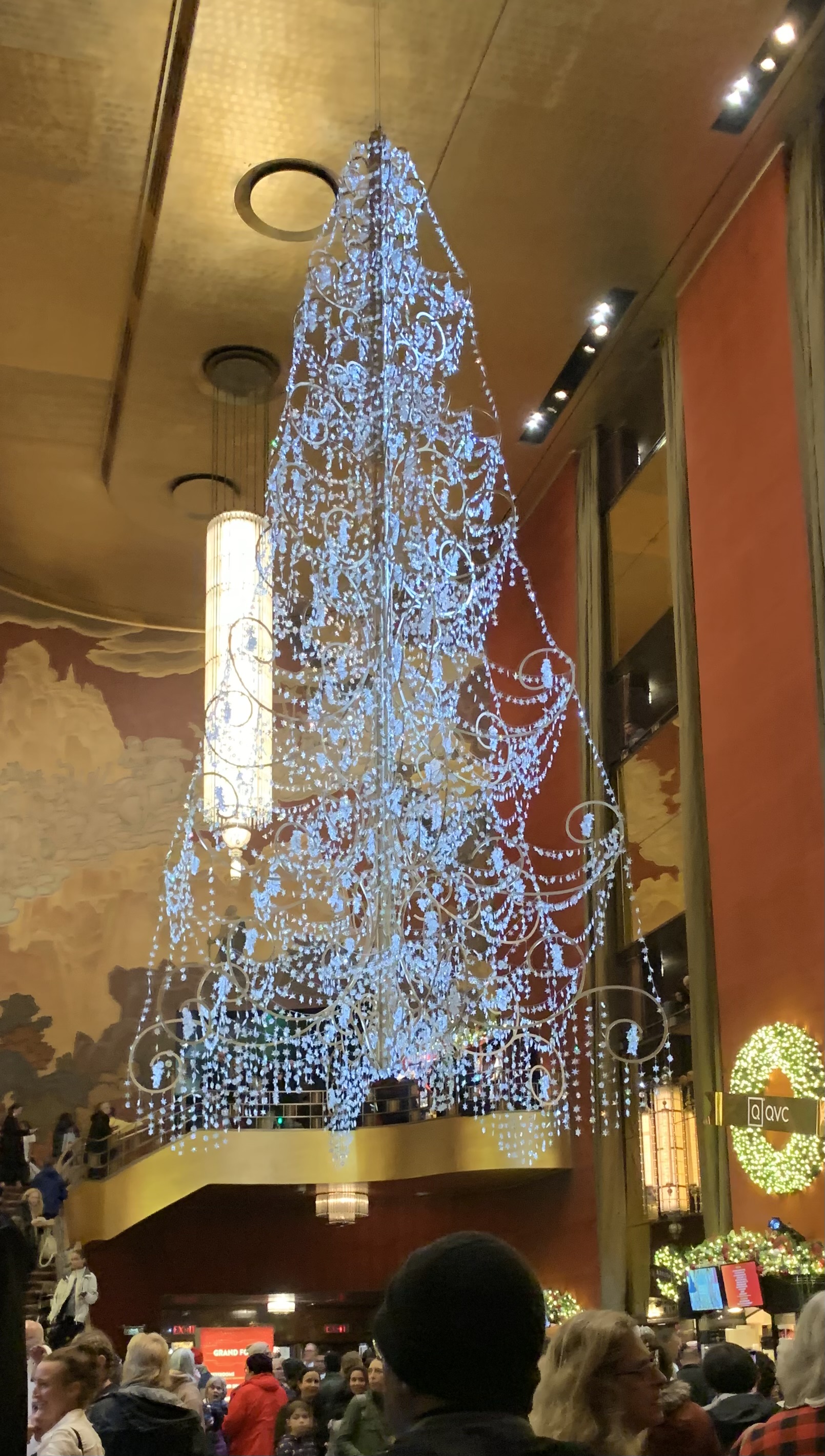 After dinner, we walked to Radio City Music Hall to see the Rockettes Christmas Spectacular: 36 Rockettes plus a cast of 140, three real camels, several sheep and a donkey. It was spectacular. Chandelier in the lobby: